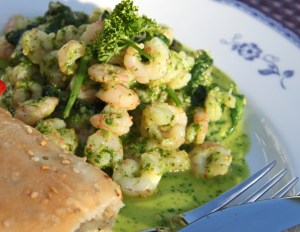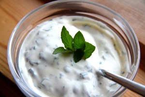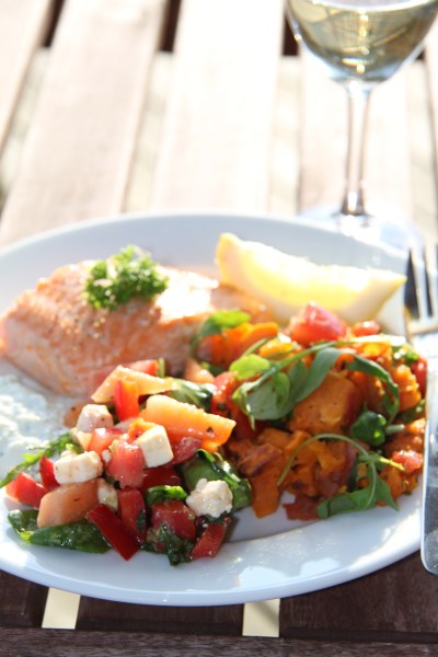 Harissa er frekar bragðsterkt en samt ekki of, börnin eru til dæmis mjög hrifin af þessum rétti. En það er afar gott og eiginlega nauðsynlegt að bera fram með réttinum milda og frískandi myntujógúrtsósu en uppskrift af henni er að finna hér (gleymdist að setja sósuna á diskinn í myndartökunni!). Með þessu bar ég einnig fram grillaða sveppi á teini. Mæli alveg með þessum rétti! 🙂