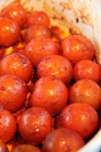Hitið bakarofn í 80 gráður. Setjið tómatana í lítið eldfast mót. Blandið Harissa, ólífuolíu, balsamedik saman, hellið yfir tómatana og veltið þeim vel upp úr blöndunni. Kryddið með salti og pipar. Setjið í ofn í 35-40 mínútur.