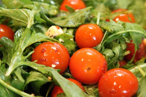 Blandið heitum tómötunum saman við blandað salat, klettasalat og fetaost.