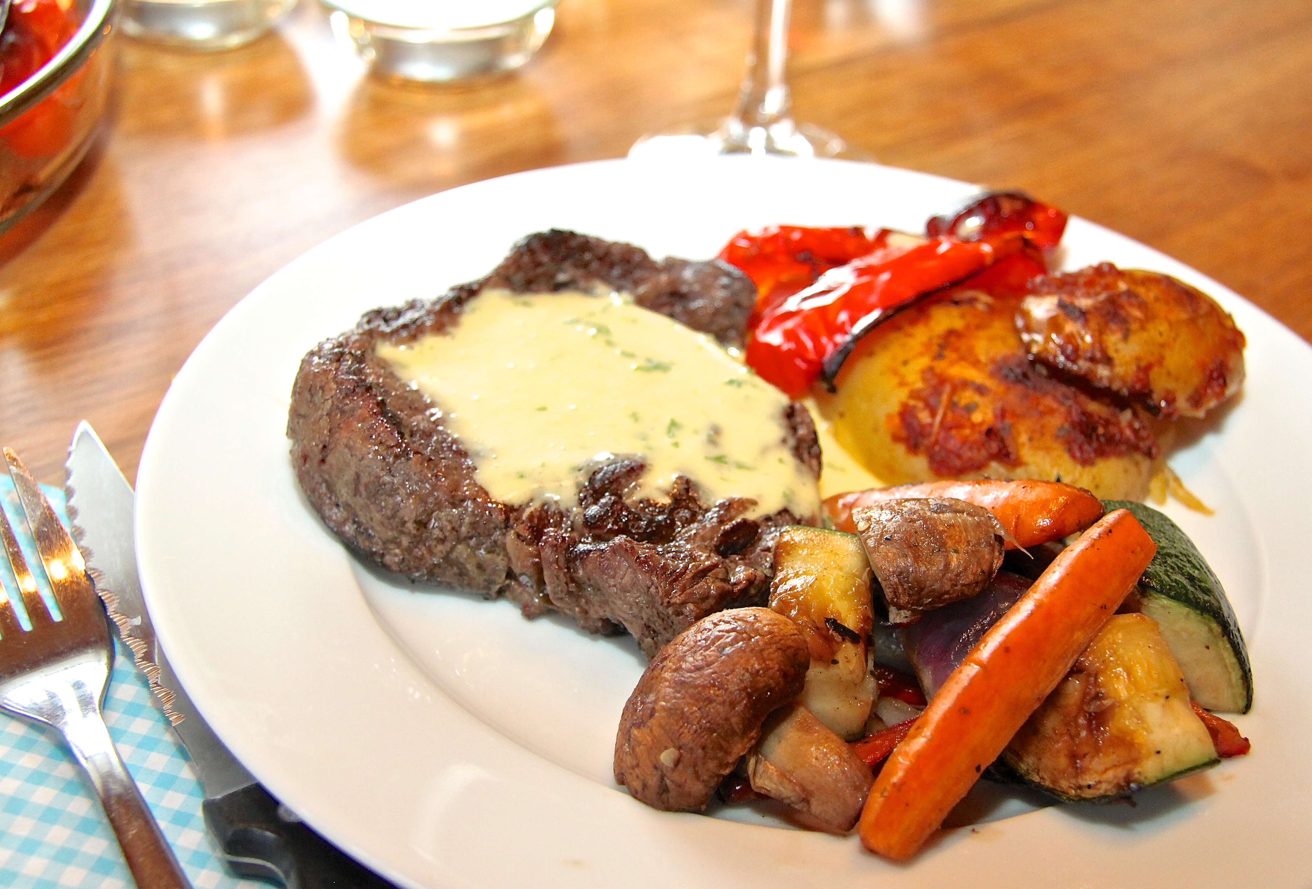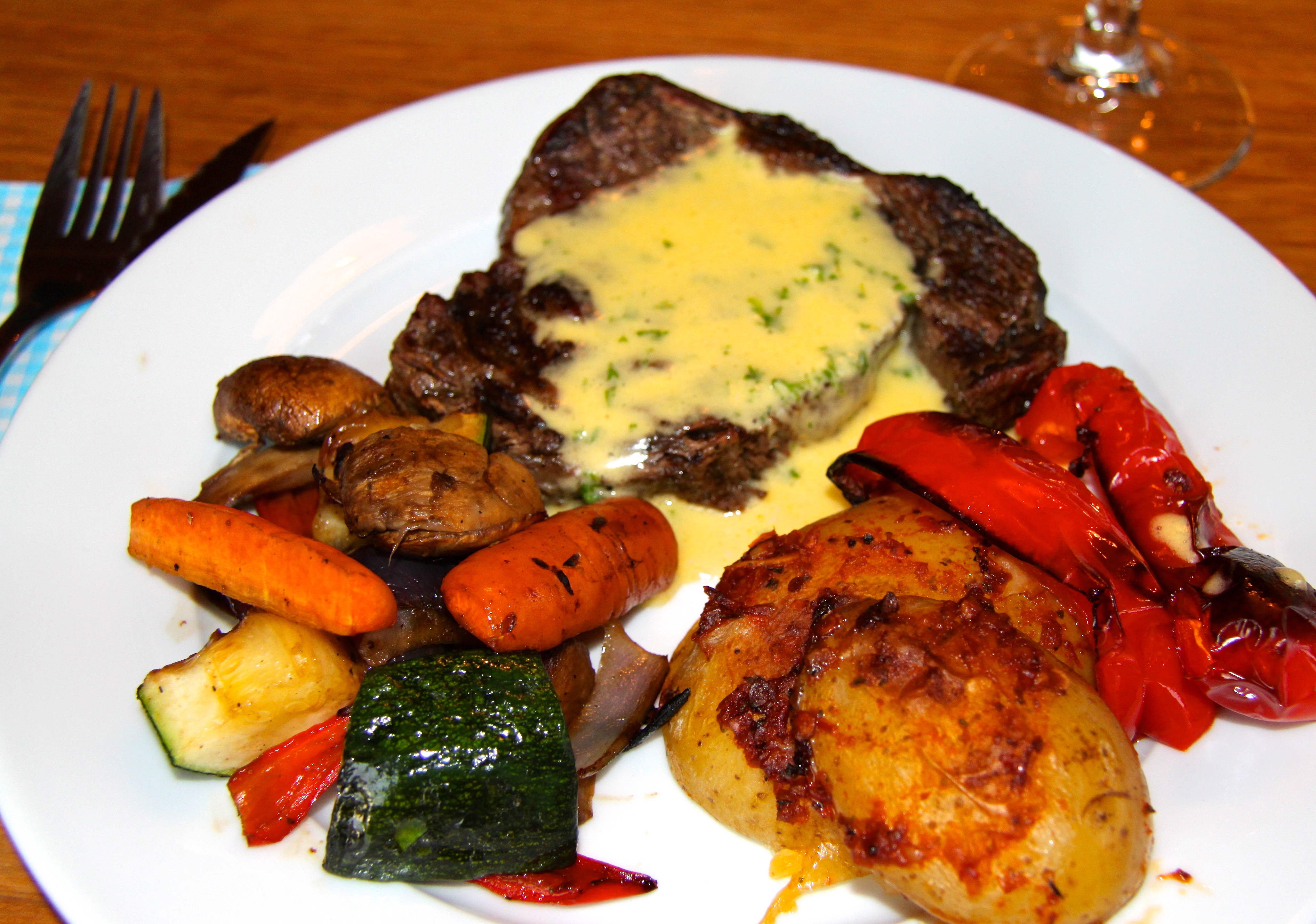 Með þessu var ég með grillað grænmeti og chilikartöflur með papriku en uppskrift af þeim er hér. Þær eru svolítið sterkar og koma þvi vel út með mildri bearnais sósunni og kjötinu. Þetta var býsna gott þó ég segi sjálf frá! 🙂