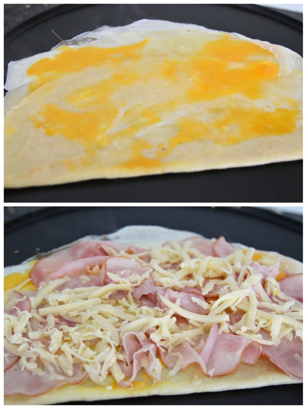 En í framhaldinu af crêpes-æðinu sem ríkir heima hjá mér þessa dagana ákvað ég hins vegar að prófa í hádeginu í gær franskar crêpes með eggjum, skinku og osti eins við fengum í Frakklandi. Sjúklega gott! Ég hrærði í crêpes deig sem ég er með uppskrift af hér. Það þarf ekki að nota sérstaka crêpespönnu eins og ég er með. Þetta er hægt að gera á steikarpönnu með góðri teflonhúð eða á pönnukökupönnu.Deiginu er ausið á pönnu, dreift um pönnuna og umfram deigi hellt af. Þegar pönnukakan er steikt á þeirri hlið er henni snúið við. Eftir ca. 30 sekúndur er pönnukakan brotin saman, egg sett yfir hana og dreift úr því með pönnukökuspaða (rauðan sprengd), egginu er ýtt aðeins út fyrir pönnukökuna (þeim megin sem pönnukakan er í boga). Því næst er skinku dreift yfir og svo rifnum osti, saltað og piprað eftir smekk.