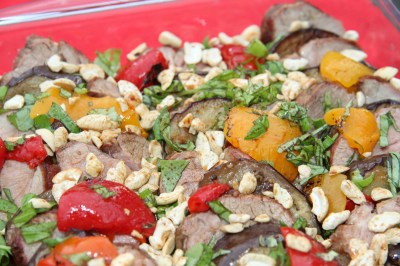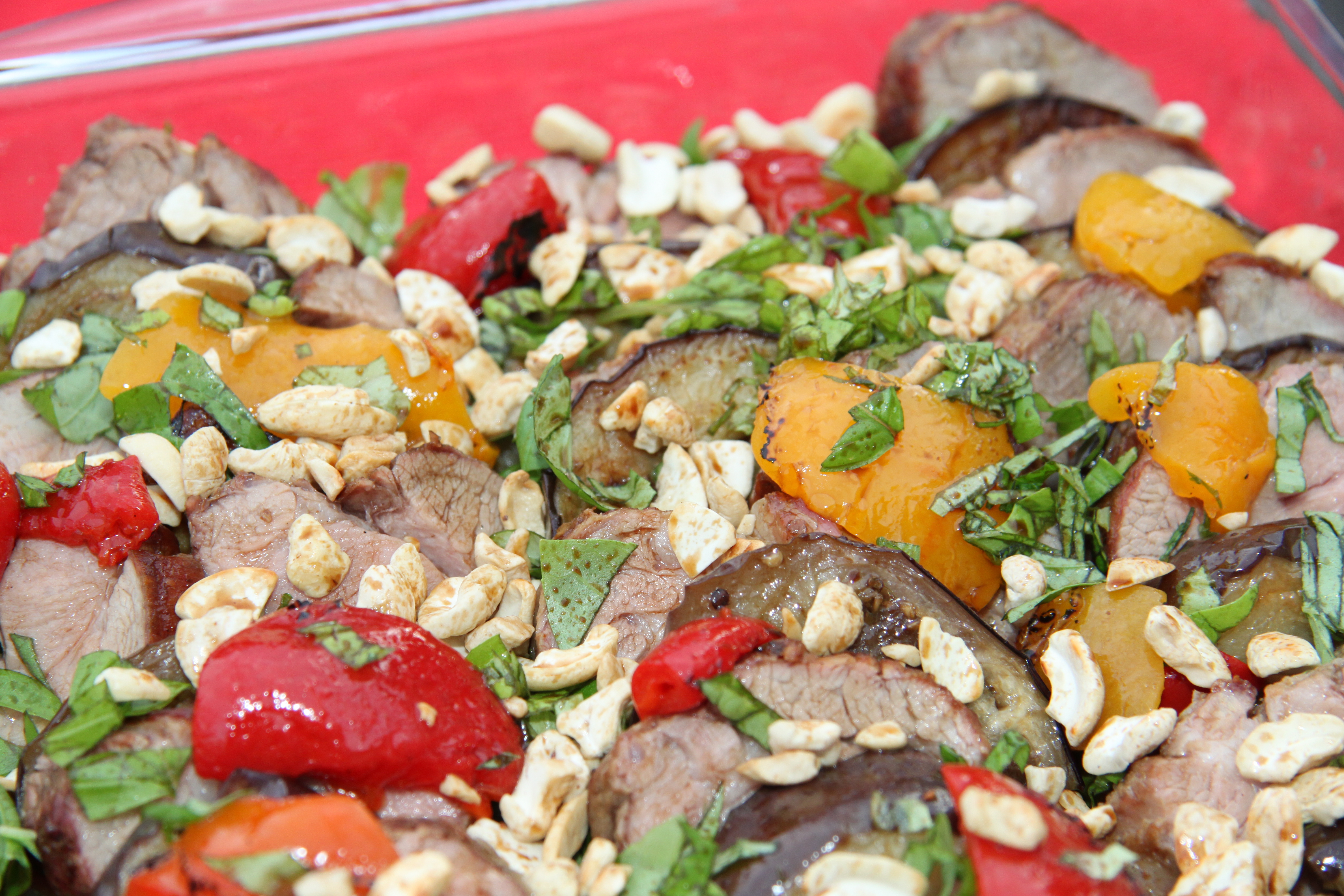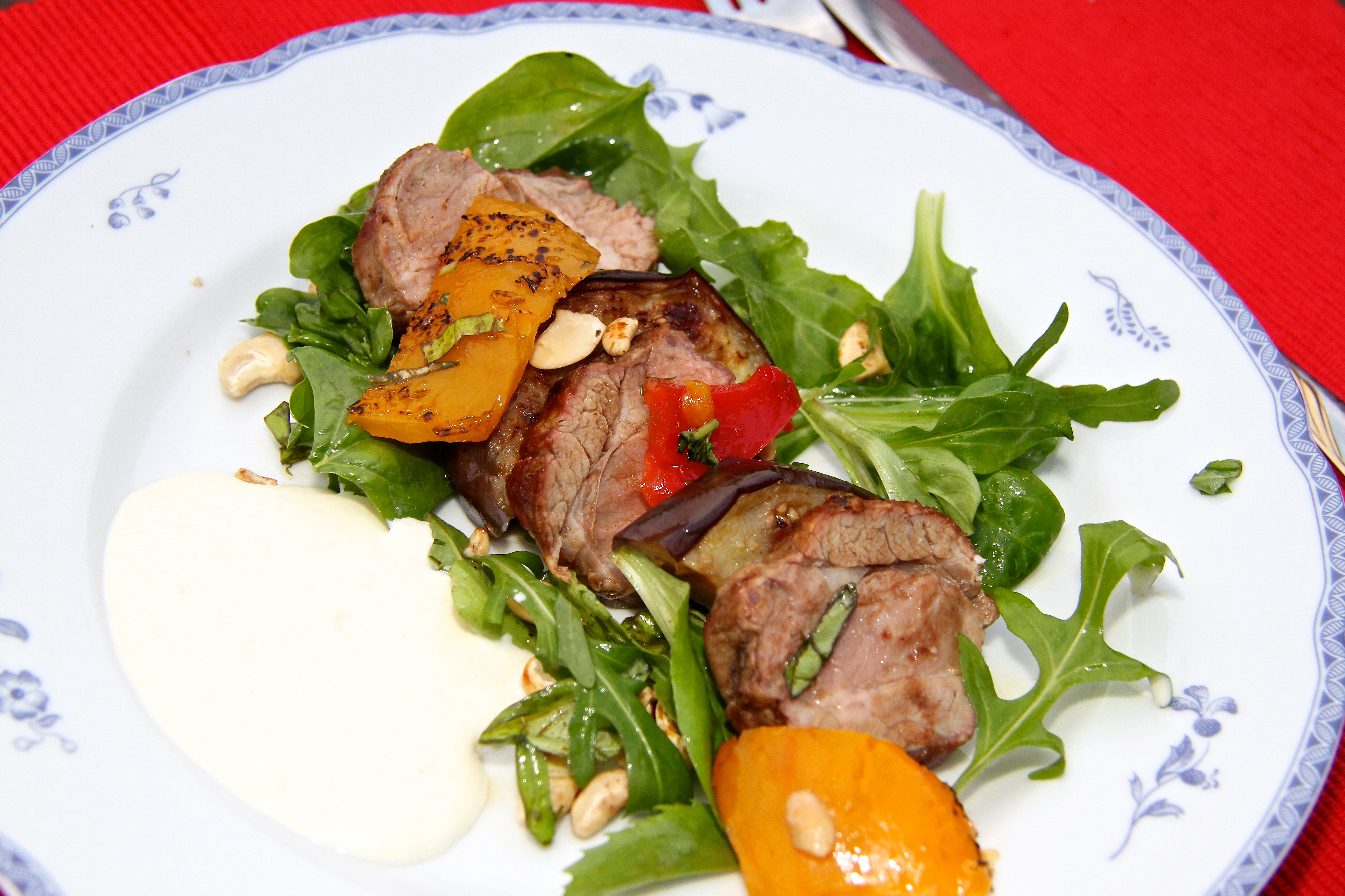 Að vanda fylgdi ég nú ekki uppskriftinni út í ystu æsar. Ég notaði minna af balsamik edik og olíu en uppgefið var og útbjó í staðinn piparrótarsósu til að bera fram með réttinum. Hér í fjölskyldunni eru sósur flokkaðar með drykkjarföngum og því ekkert sérstaklega vinsælt að bera fram kjöt án vænnar sósuslettu! Ég notaði líka ristaðar kasjúhnetur í stað furuhneta en ég er eiginlega alveg hætt að nota furuhnetur. Ég hef nefnilega tvisvar lent í ,,pine mouth syndrome“ sem er afar hvimleitt að lenda í. Það lýsir sér þannig að einum degi eftir að hafa borðað furuhnetur finnur maður málkennt, vont bragð í munni af öllum mat, drykk og meira að segja tannkreminu! Þetta getur varað í allt að fjórar vikur. Ég lagðist í rannsóknarvinnu um þetta vandamál og komst að því að það er algengt. Það er ekki enn búið að finna ástæðuna en samkvæmt rannsóknum matvælastofnun Svíþjóðar virðist þetta tengjast uppskerubresti á furuhnetum í Asíu. Þá fóru ræktendur að notast við aðra tegund af furuhnetum sem geta haft þessi áhrif. Ég vil ekki taka áhættuna að lenda í þessu aftur og nota því varla furuhnetur lengur! Ég breytti tvennu til viðbótar í uppskriftinni, ég notaði klettasalat til viðbótar við spínatið og lambasalatið. Að auki notaði ég grillaðar paprikur frá Sacla í stað bakaðra tómata. Þetta heppnaðist býsna vel og öllum fannst rétturinn ljúffengur!