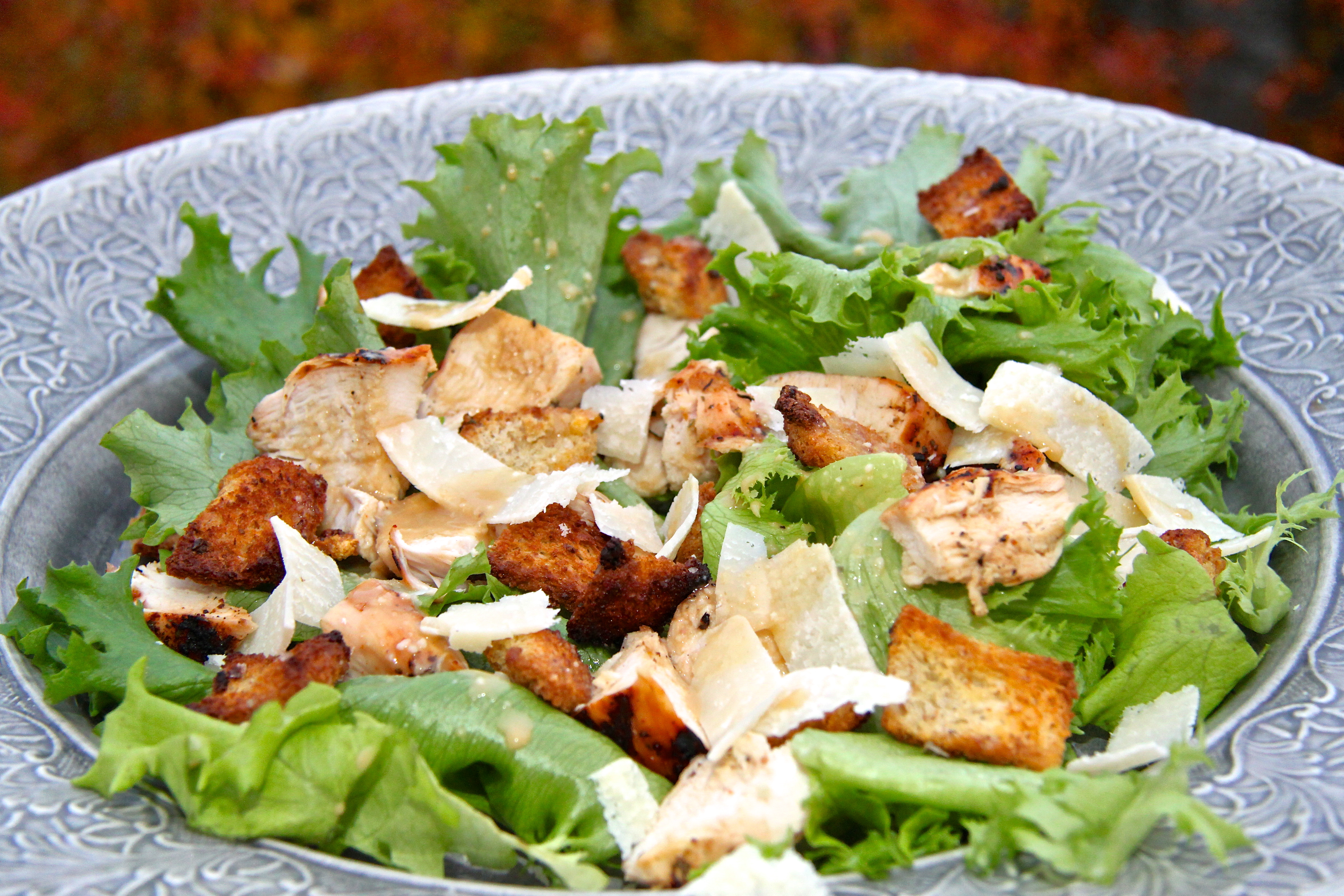 Salatið er sett í skál og dressingunni bætt saman við. Brauðteningum og rifna parmesan ostinum er bætt saman við og loks er kjúklingi og beikoni dreift yfir.