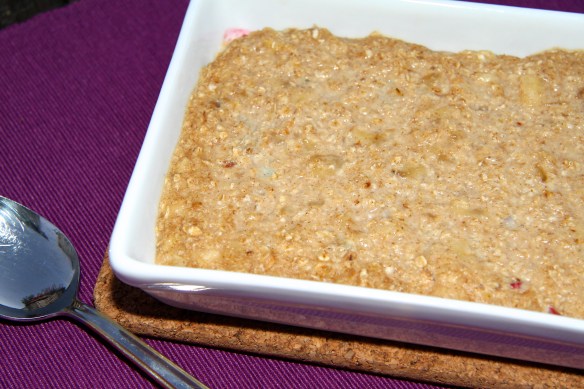 Ég verð að viðurkenna að ég er ekki mikið fyrir hafragraut, eiginlega borða ég hann ekki en öfunda alla þá sem borða hafragraut því hann er svo hollur og staðgóður! Flestum í fjölskyldunni finnst hann góður, þær systur fá sér oft hafragraut á morgnana. En svo sá ég á netinu hugmynd af ofnbökuðum hafragraut sem kveikti áhuga minn á að gera einhverjar skemmtilegar útfærslur af grautnum. Það lítur kannski út fyrir að vera tímafrekt að útbúa grautinn í ofni en svo er alls ekki, ég tók tímann! Ég var 2 mínútur að útbúa grautinn (með forskornum rabbabara úr frysti, aðeins lengur ef epli eru skorin niður), svo er honum bara hent inn í ofn og á meðan er hægt að vekja börnin og hafa alla til á meðan grauturinn bakast í ofninum í ca. 15 -20 mínútur. Það er líka hægt að búa hann til kvöldinu áður og geyma í ísskáp yfir nóttu, setja bara álpappír eða plastfilmu yfir hann. Krökkunum fannst ofnbakaði hafragrauturinn algjört sælgæti! Ósk sagði að grauturinn bragðaðist ekki eins og hafragrautur, meira eins og nammi! Meira að segja Vilhjálmi, sem hefur hingað til ekki verið mjög hrifinn af hafragraut, fannst hann æðislegur. Ég prófaði nokkrar útfærslur af grautnum. Í eitt skiptið notaði ég frosin bláber í botninn, en betra fannst okkur að nota rabbabara eða epli. Við eigum líka eftir að prófa t.d. frosin hindber, það er örugglega ljúffengt! Það er hægt að leika sér enn meira með þennan graut, td. bæta út í hann smá kókosmjöli, döðlum, hnetum eða hunangi. Eins er hægt að bera hann fram og borða með kotasælu, jógúrt eða AB-mjólk. Ef það er afgangur af grautnum þá er hægt að geyma hann í ísskáp og borða seinna um daginn, kaldan eða upphitaðan. Uppskriftin hér að neðan passar fyrir eina svanga sál!