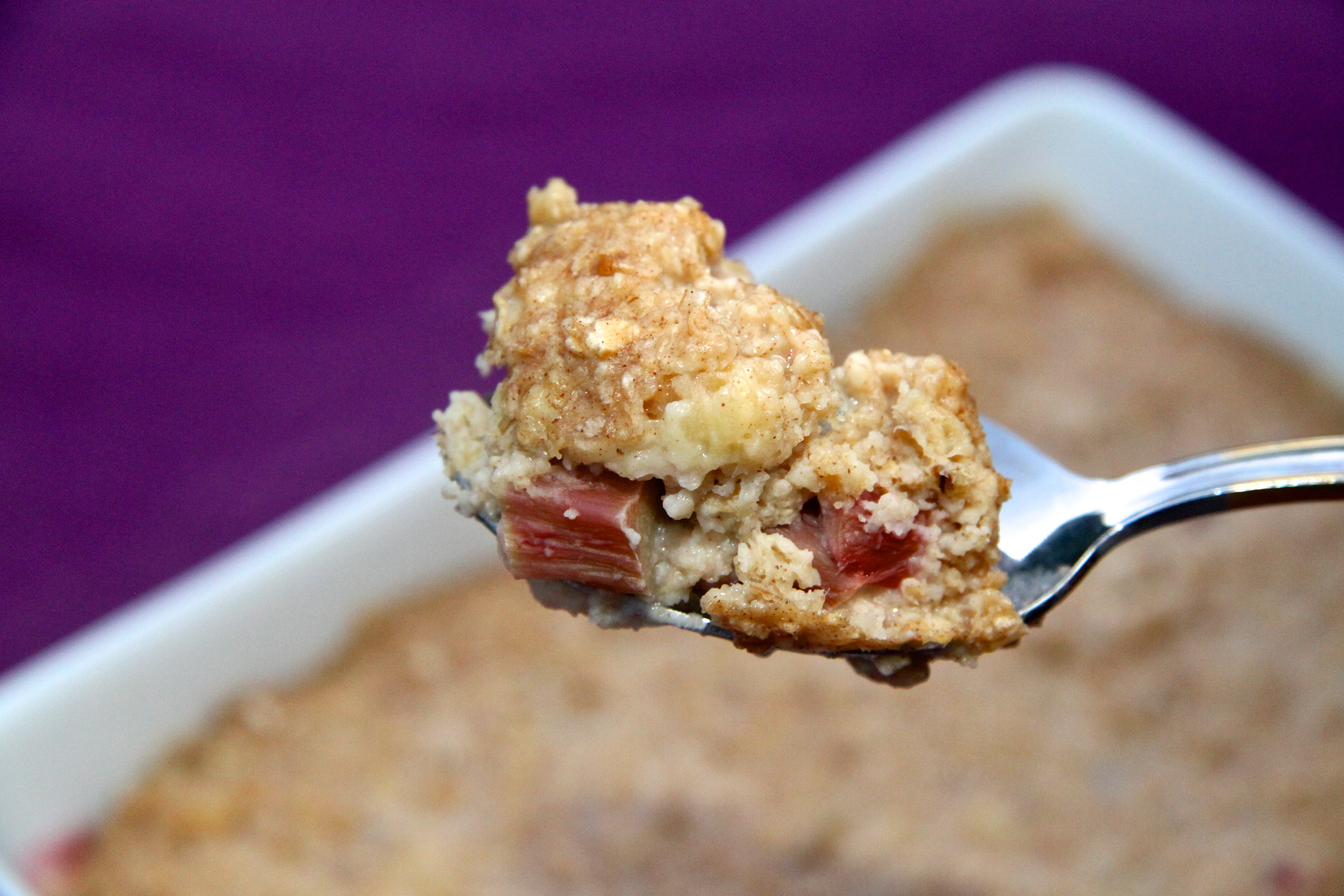Ofninn er hitaður í 220 gráður. Í botninn á litlu eldföstu móti eða skál er lagður smátt skorinn rabbabari (nú eða smátt skorin epli, líka hægt að skera þau í skífur). Haframjöli, mjólk, eggi, lyftidufti, kanil og banana blandað saman í skál með gaffli (banani stappaður í leiðinni) og helt yfir rabbabarann. Bakað í ofni við 220 gráður í 15-20 mínútur (fer dálítið eftir hvernig formið er og þá hversu þykkt lag af graut er ofan á ávöxtunum, fer líka eftir hversu stökkt yfirborð maður vill)