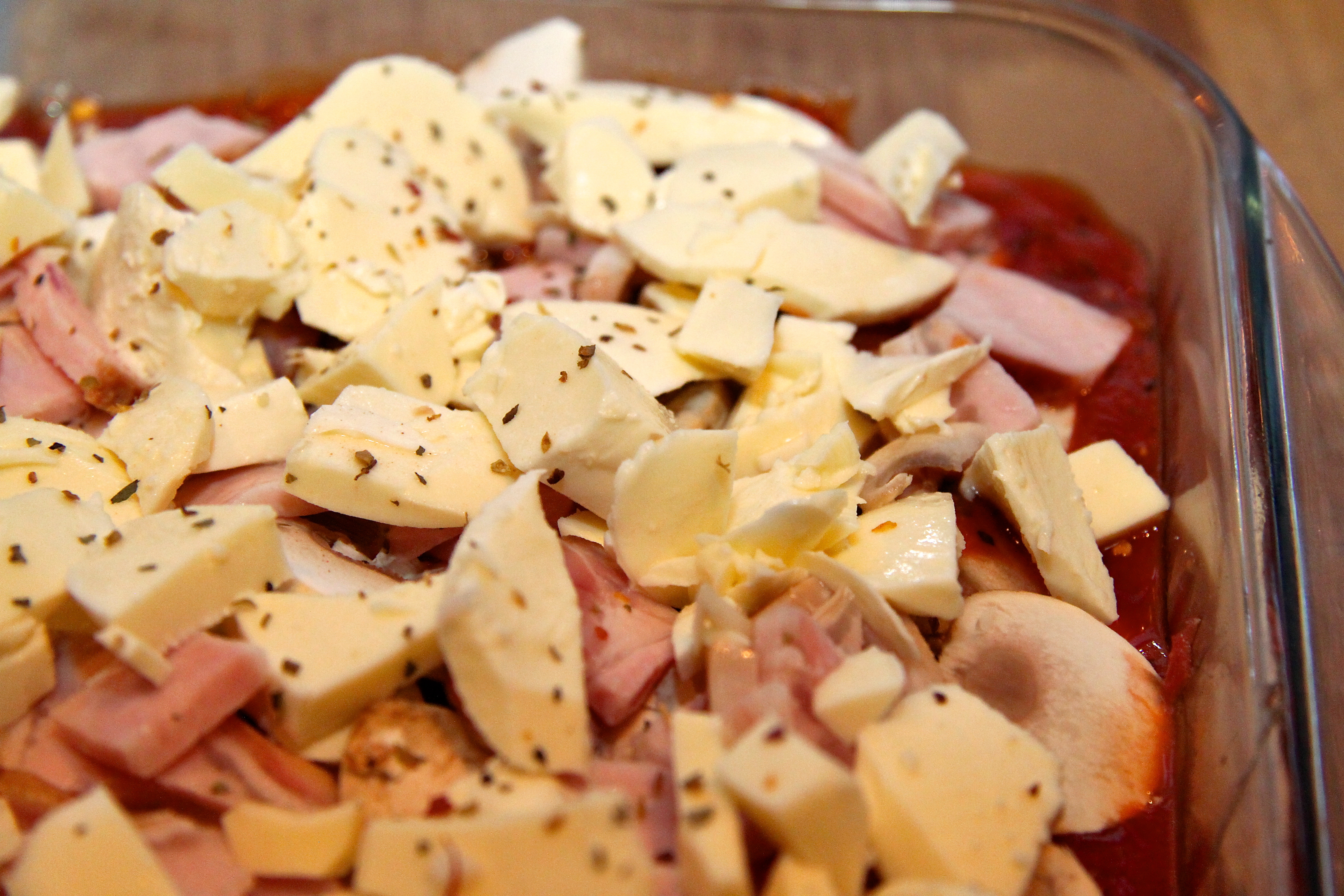 Blandið saman öllu hráefninu í kjöthleifinn og þrýstið honum ofan í eldfast mót. Steikið lauk og hvítlauk í ólífuolíu þar til laukurinn verður mjúkur. Bætið þá við tómatmaukinu auk krydda og látið blönduna malla í 3 mínútur. Smakkið svo til með sykri, salti og pipar. Hellið blöndunni á hakkið, stráið sveppum og skinku yfir og síðast mozzarella ostinum. Bakið í ofni við 200 gráður í ca. 25 mínútur. Gott að bera fram með réttinum pasta eða kartöflumús auk salats.