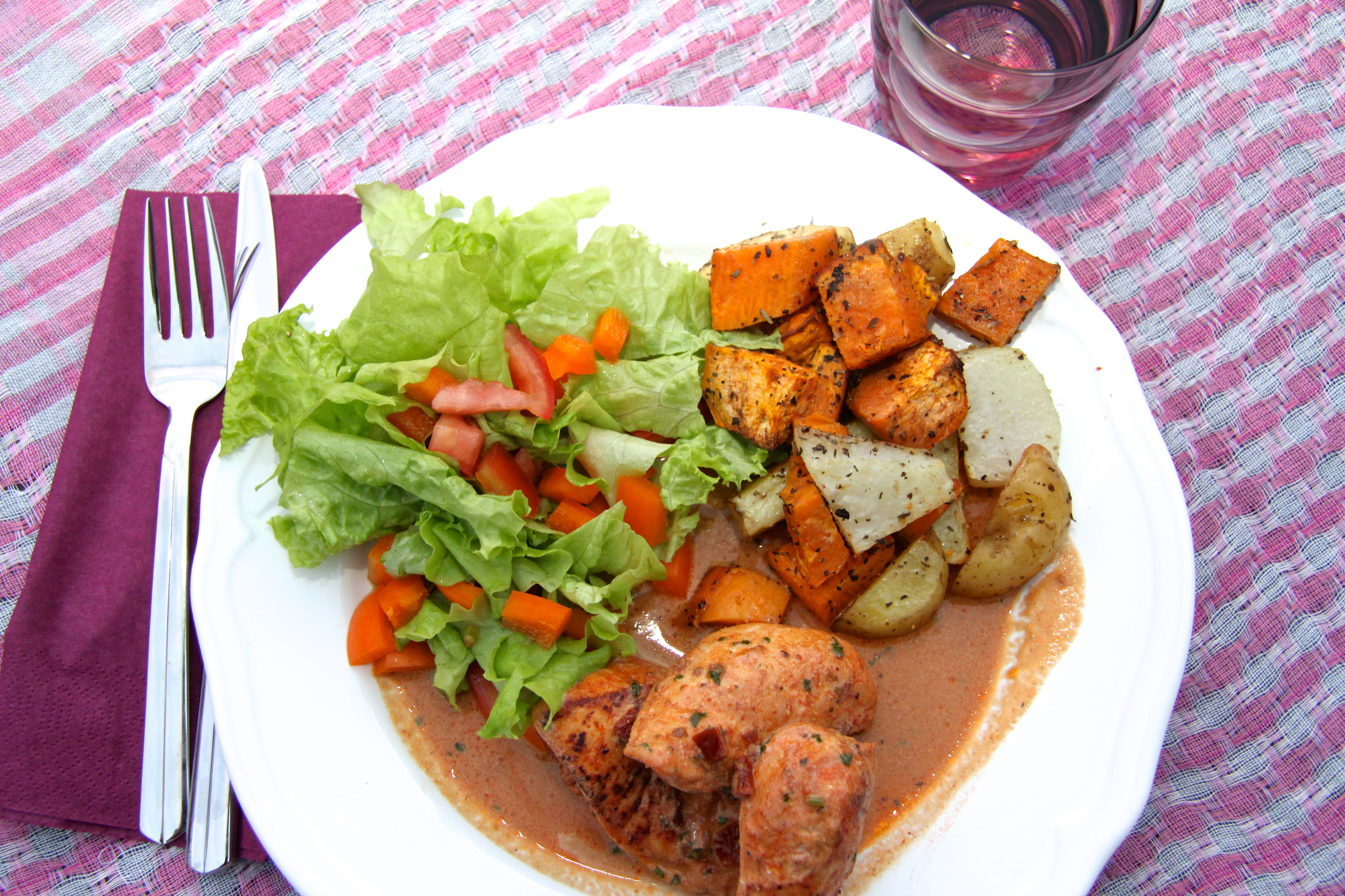 Ég bjó eiginlega til þennan rétt með hálfum hug. Ég er nefnilega ekkert of hrifin af sólþurrkuðum tómötum, finnst þeir bara góðir ef þeir eru ekki of afgerandi í uppskriftunum. Þetta er afsakaplega einfaldur réttur, mjög fljótlegt að búa hann til og það kom mér síðan skemmtilega á óvart hvað hann var góður! Elfari fannst hann afar góður líka en það sem kom kannski mest á óvart var að Alexander fannst þetta vera besti rétturinn sem ég hef nokkurn tíma gert! Það er reyndar býsna auðvelt að elda fyrir hann, honum finnst allt gott sem ég geri! 🙂 En sósan var sem sagt sú bragðbesta sem hann hefur borðað hingað til, ekki slæm einkunn það! Í upprunalegu uppskriftinni er talað um að nota krydd sem heitir ungversk paprika, það er sætara paprikukrydd en þetta hefðbundna. Það er til frá Pottagöldrum en ég átti það ekki til og notaði því bara hefðbundið paprikukrydd.