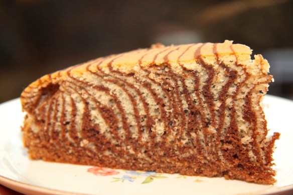 Ég gat ekki staðist mátið að prófa þessa köku eftir að ég sá hana á netinu. Tvennt fannst mér afar spennandi, annað var skemmtilegt útlit kökunnar og hitt var að í henni var kók! Ég hef aldrei bakað úr kóki áður þó ég sé nú hrifin af þeim drykk! 🙂 Þetta er í raun tilbrigði við hefðbundna marmaraköku, bara mikið flottari, mýkri og bragðbetri kaka. Ég var nú ekki viss um að ná sebraútlitinu, hélt að það væri kannski afskaplega erfitt. Annað kom þó á daginn, þetta var ægilega auðvelt og skemmtilegt. Jóhönnu Ingu fannst afar gaman að fylgjast með gerð kökunnar og það var hún sem tók myndirnar þegar ég var að setja deigið í kökuformið. Ég notaði svona nestispoka frá Íkea sem hægt er að loka til þess að sprauta deiginu. Smellan helst vel lokuð og pokarnir eru þykkir, það er því lítil hætta á því að deigið fari út um allt. Mikilvægt er að klippa bara örlítið gat á eitt hornið til þess að deigið renni ekki alltof hratt, maður vill geta haft góða stjórn á því. Ég setti til skiptis ljóst og dökkt deig frekar þétt, það er líka hægt að hafa breiðari renndur, setja þá meira af deigi í hverjum skammti. Það kemur líka mjög flott út. Þetta er virkilega góð kaka, það gerir hana afar safaríka að nota kók en það er líka hægt að nota sódavatn til að ná sömu eiginleikum fyrir þá sem ekki vilja nota kók.