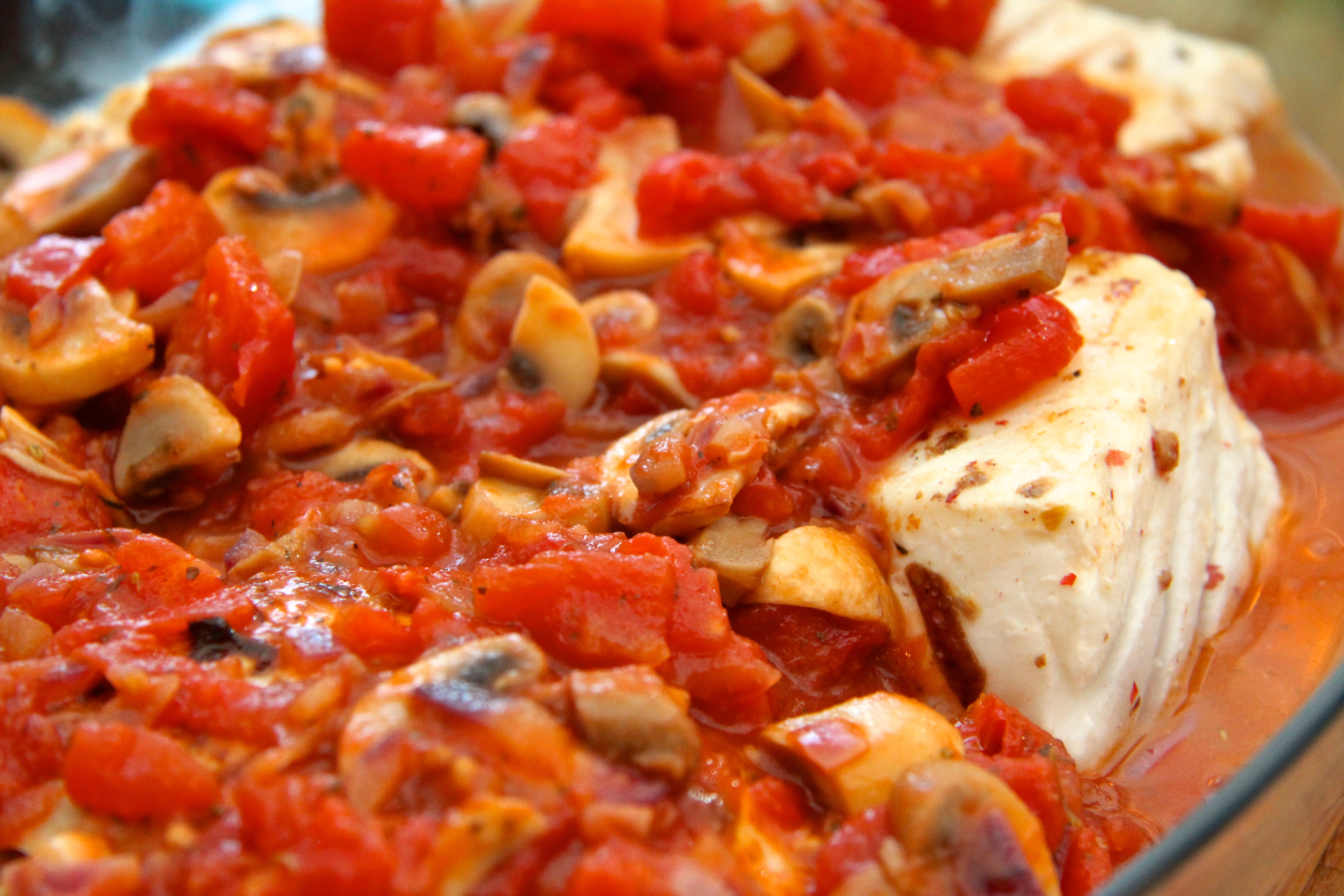 Ofninn er hitaður í 200 gráður og stilltur á grill. Fiskurinn er kryddaður með rósapipar, salti, pipar og sítrónusafanum dreift yfir fiskinn. Fiskurinn er steiktur á pönnu upp úr smjörinu á báðum hliðum þar til hann hefur náð góðum lit á báðum hliðum. Þá er hann tekinn af pönnunni og lagður í smurt eldfast mót. Sveppum, lauk og hvítlauk bætt út á pönnuna. Þetta er steikt í smástund (smjöri bætt við eftir þörfum) og þá er tómötum og hvítvíni bætt út á pönnuna, saltað og piprað. Sósan er látin malla í ca. 10 mínútur. Þá er henni hellt yfir fiskinn.
