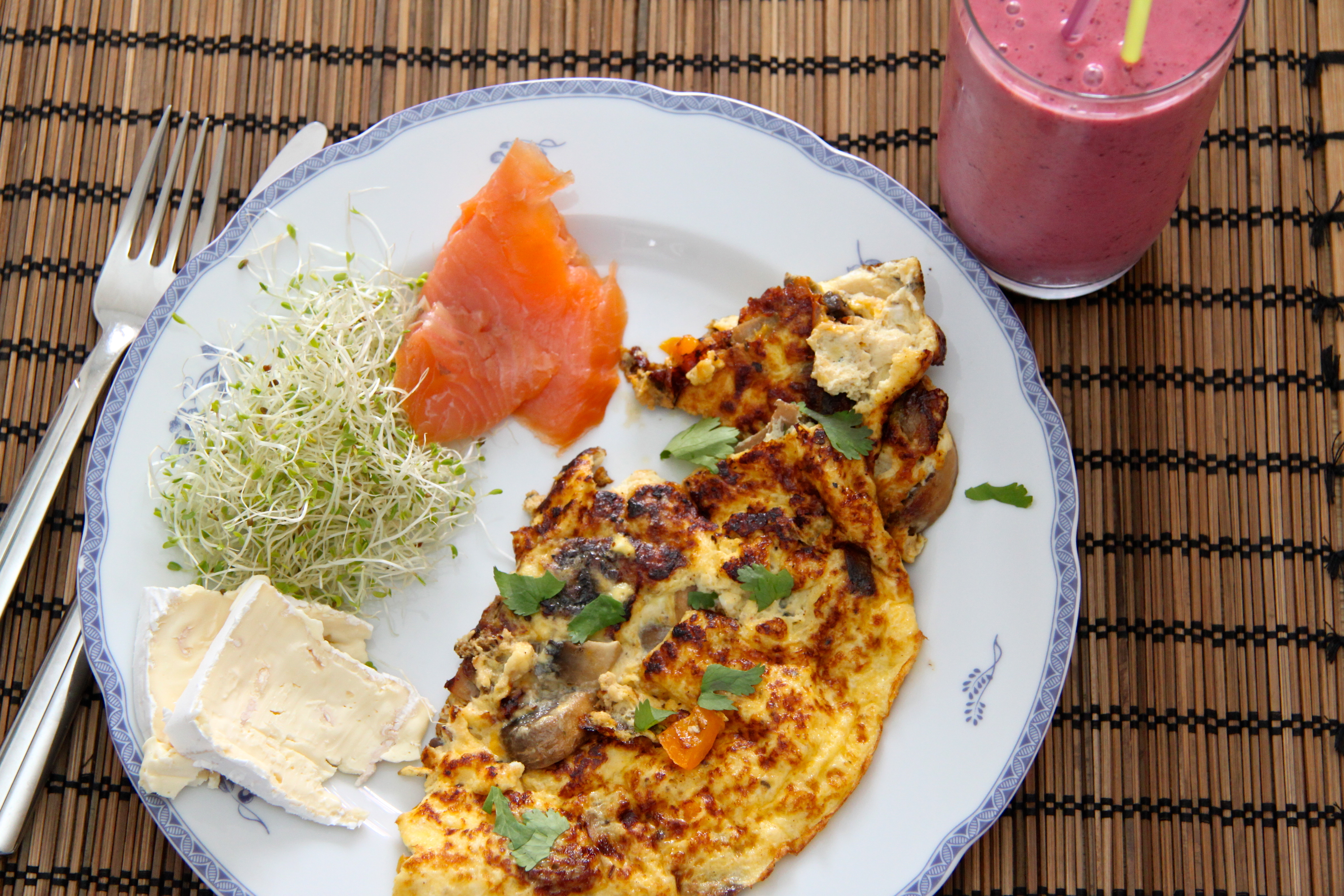 Í glasinu er skyrboostið góða og á disknum er eggjakakan mín sem ég fæ aldrei leið á. Reyndar var ekkert brokkolí í henni í dag, þess í stað var appelsínugul paprika auk sveppa og rifins cheddar osts. Á disknum er líka alfalfa spírur sem mér finnst svo góðar. Þær eru rosalega góðar í salat og ég nota þær líka mikið ofan á brauð. Þessar voru sérstaklega góðar, lífrænt ræktaðar og fengust í Nettó.