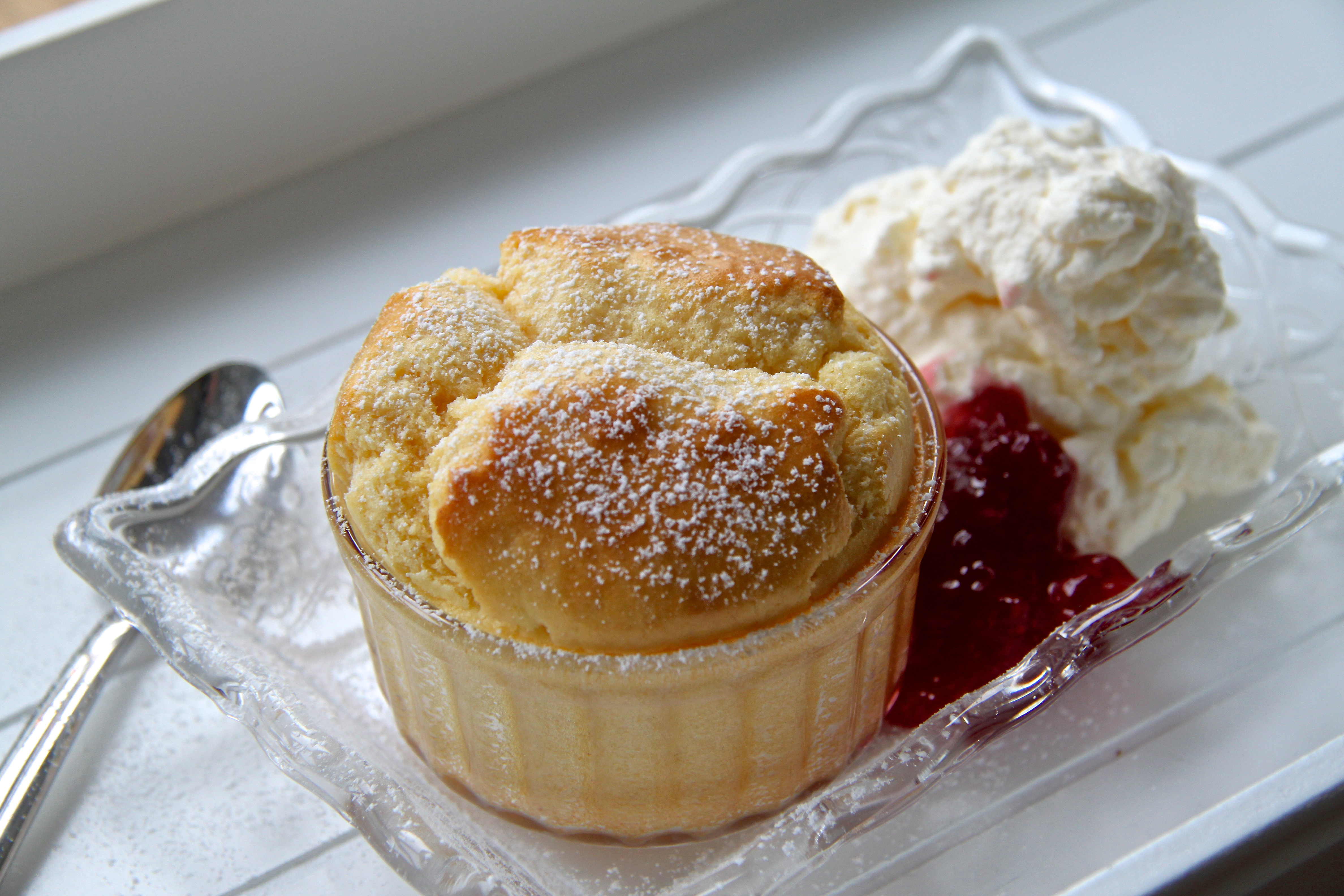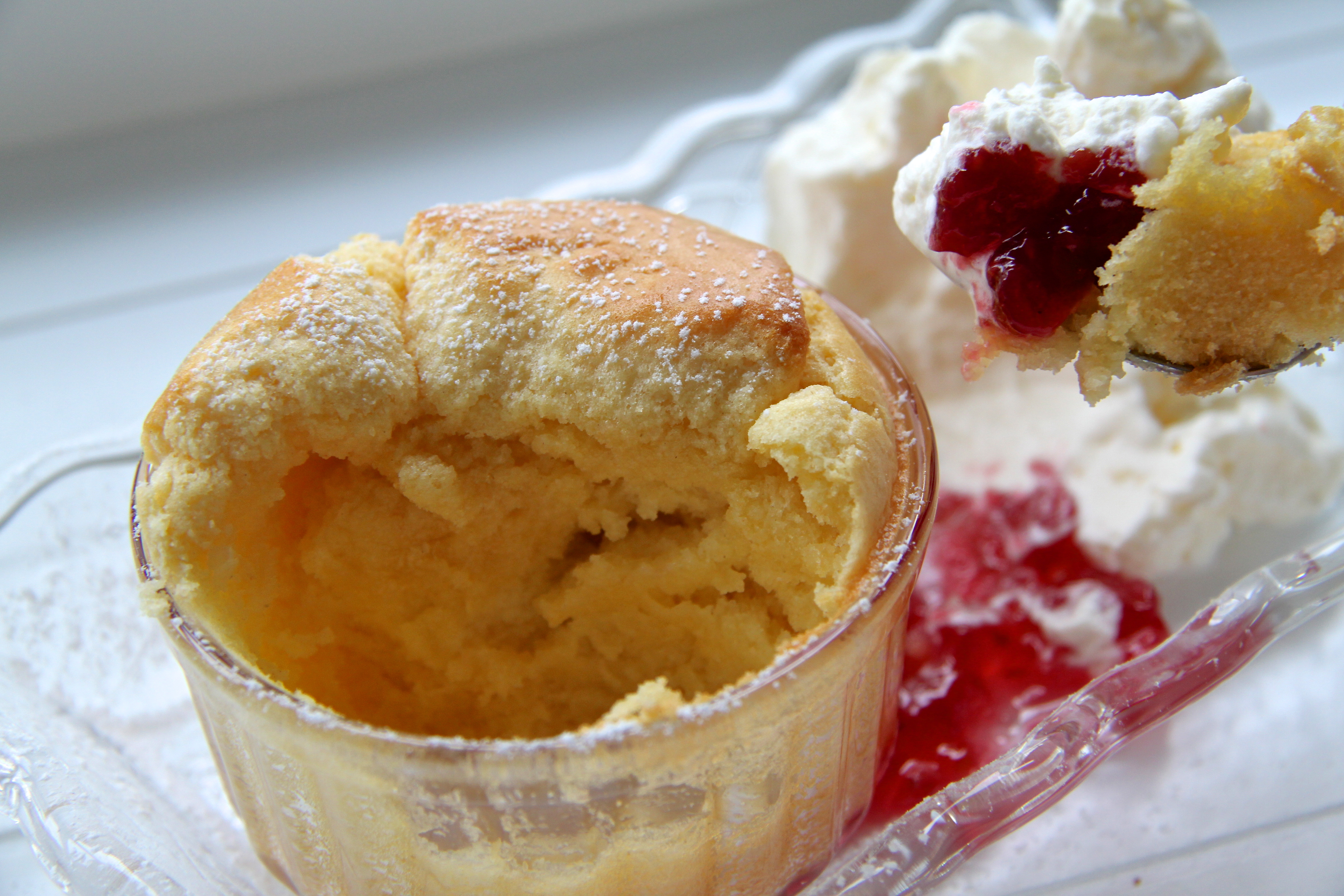 Ofninn er stilltur á 200 gráður við undir- og yfirhita. Fjögur souffle-form eru smurð með smjöri. Eggin eru aðskilin og eggjahvítan stífþeytt og látin bíða í ísskáp. Smjörið er brætt í potti á meðan eggjarauðurnar og sykurinn er þeytt saman. Því næst er mjólkinni, rjómanum og brædda smjörinu bætt út í eggjarauðurnar og sykurinn. Þá er hveitið og lyftiduftið sigtað og bætt út í. Að lokum er blöndunni blandað varlega saman við þeyttu eggjahvíturnar með sleikju. Deiginu er skipt í souffle-formin fjögur og þau bökuð fremur neðarlega í ofni við 200 gráður (undir- og yfirhita) í 15 mínútur. Borið strax fram með þeyttum rjóma og sultu.