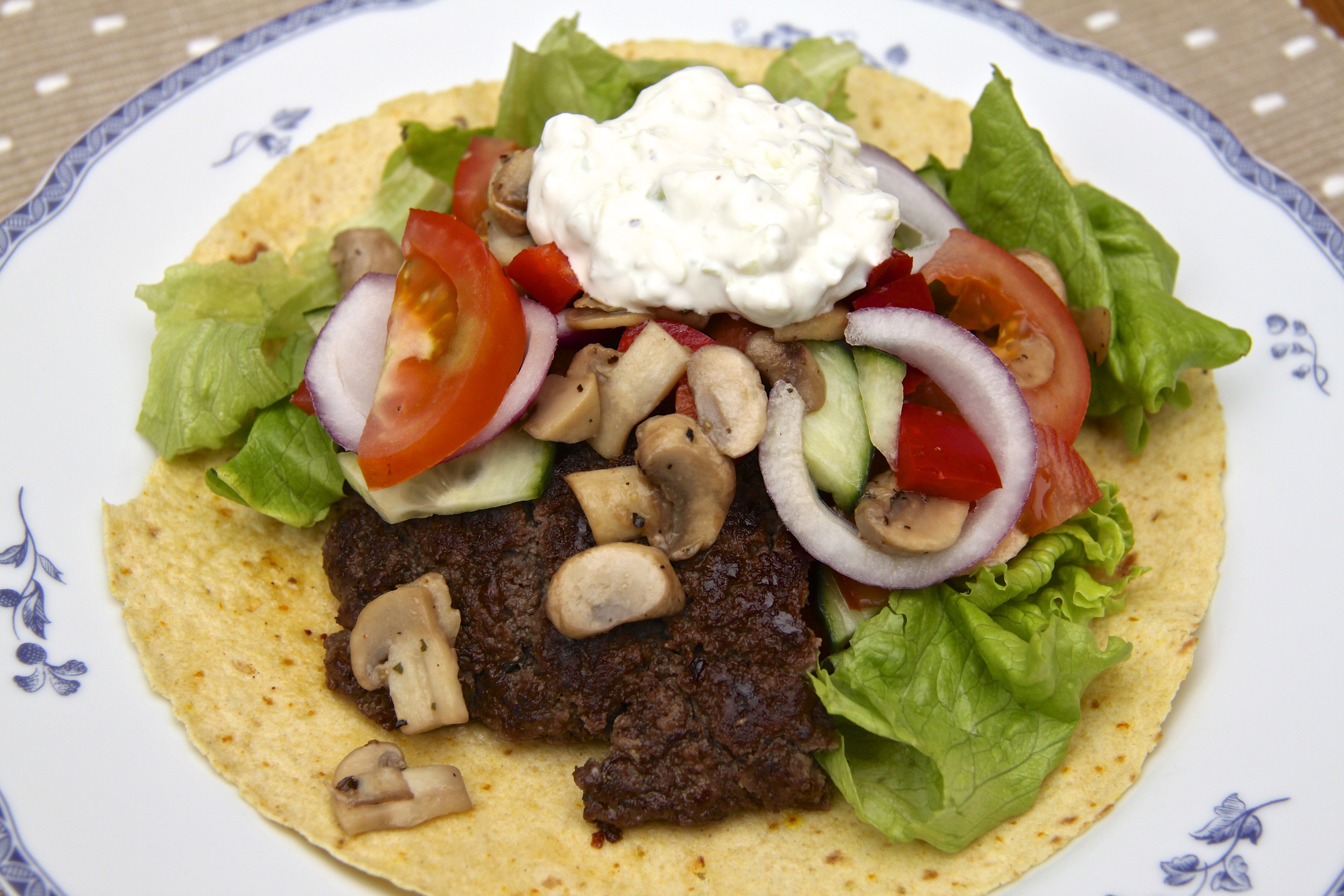 Tortillakökur eru hitaðar samkvæmt forskrift og borið fram með pönnubuffinu, grænmeti, steiktum sveppum og sósu.