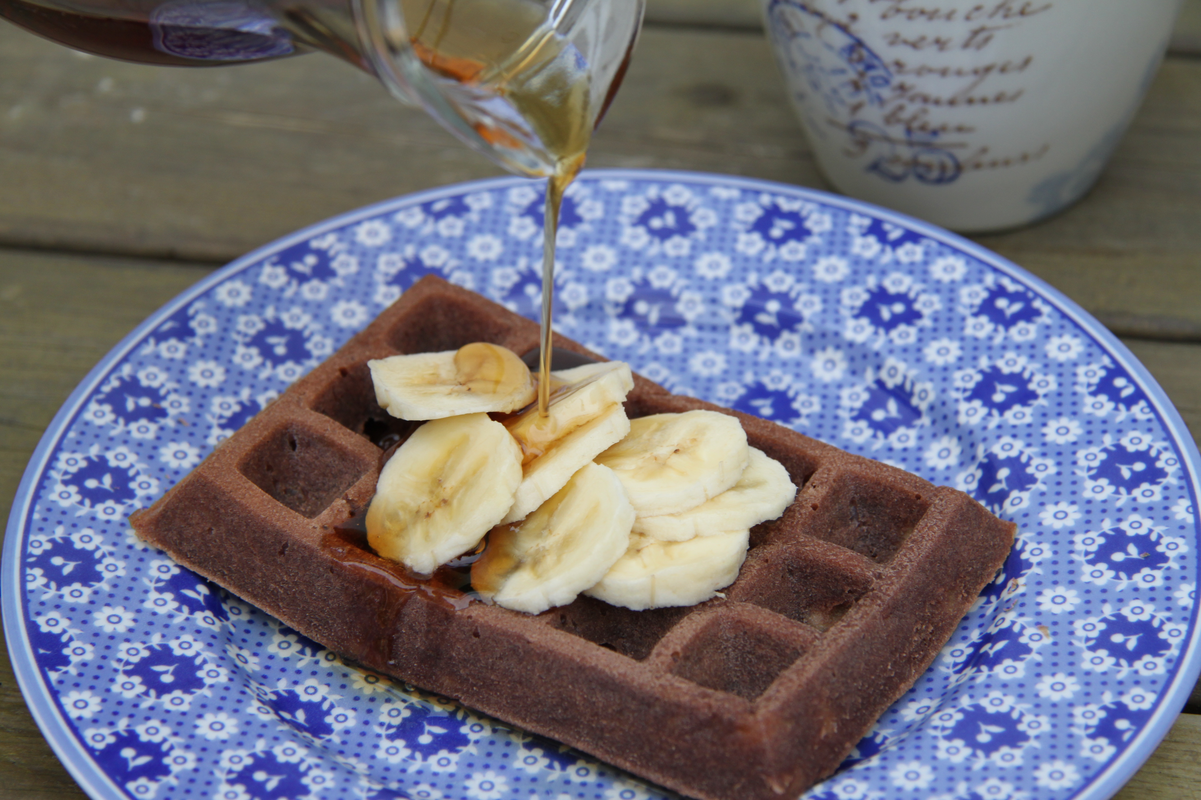 Mér datt í hug að prófa að búa til vöfflur með súkkulaði og banönunum, nokkuð sem reyndist snilldarhugmynd. Ég prófaði mig áfram og fyrstu vöfflurnar reyndust óætar! Ég notaði of mikið kakó og of lítinn sykur, þær urðu alltof rammar. En eftir að hafa prófað mig áfram með deigið datt ég niður á sjúklega góðar vöfflur, þessar verðið þið bara að prófa! Frábær eftirréttur eða með kaffinu til hátíðarbrigða. Ég prófaði bæði að baka þær í vöffluformunum mínum í ofninum en líka í belgíska vöfflujárninu og hvor tveggja kom álíka vel út.