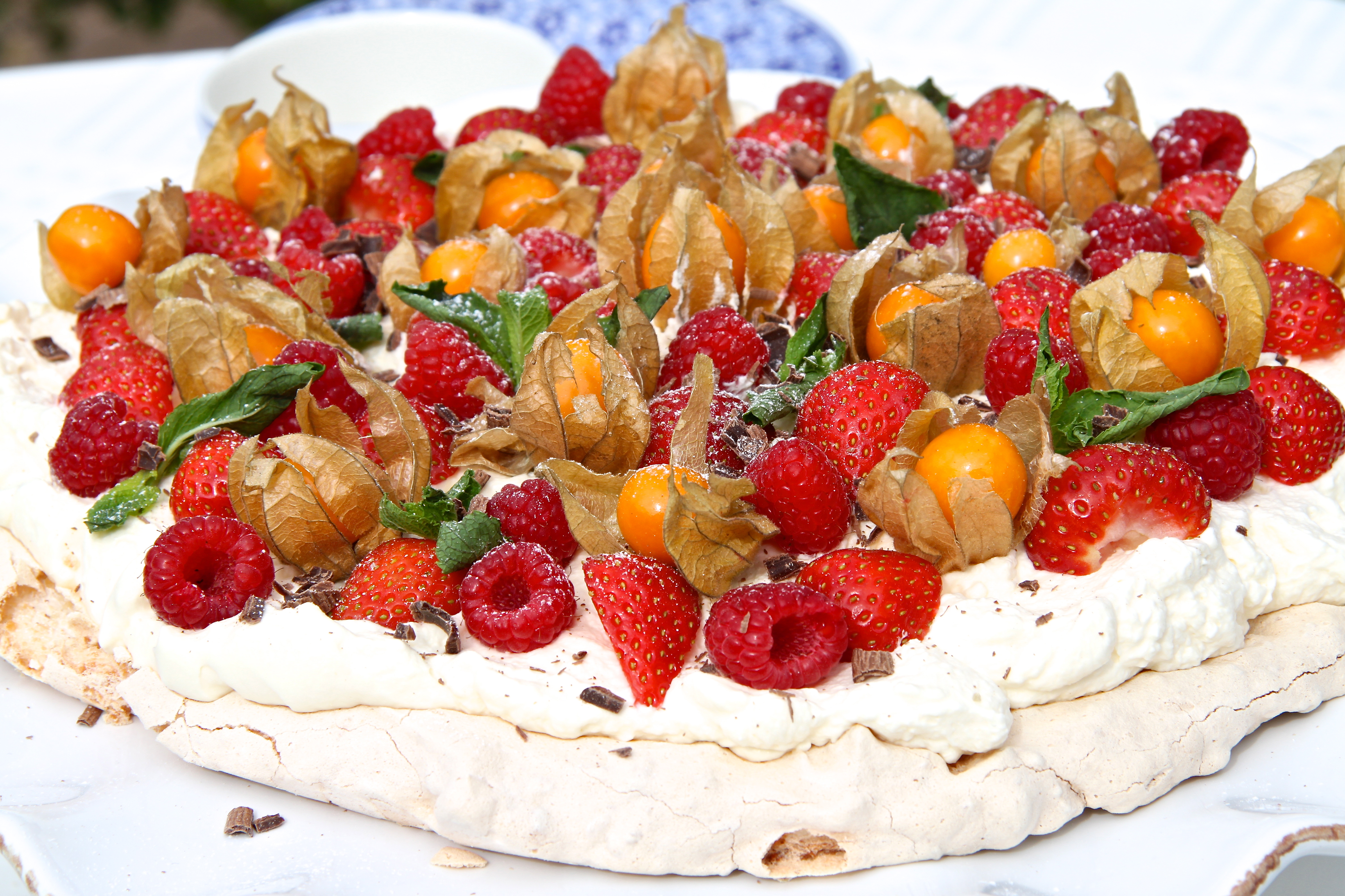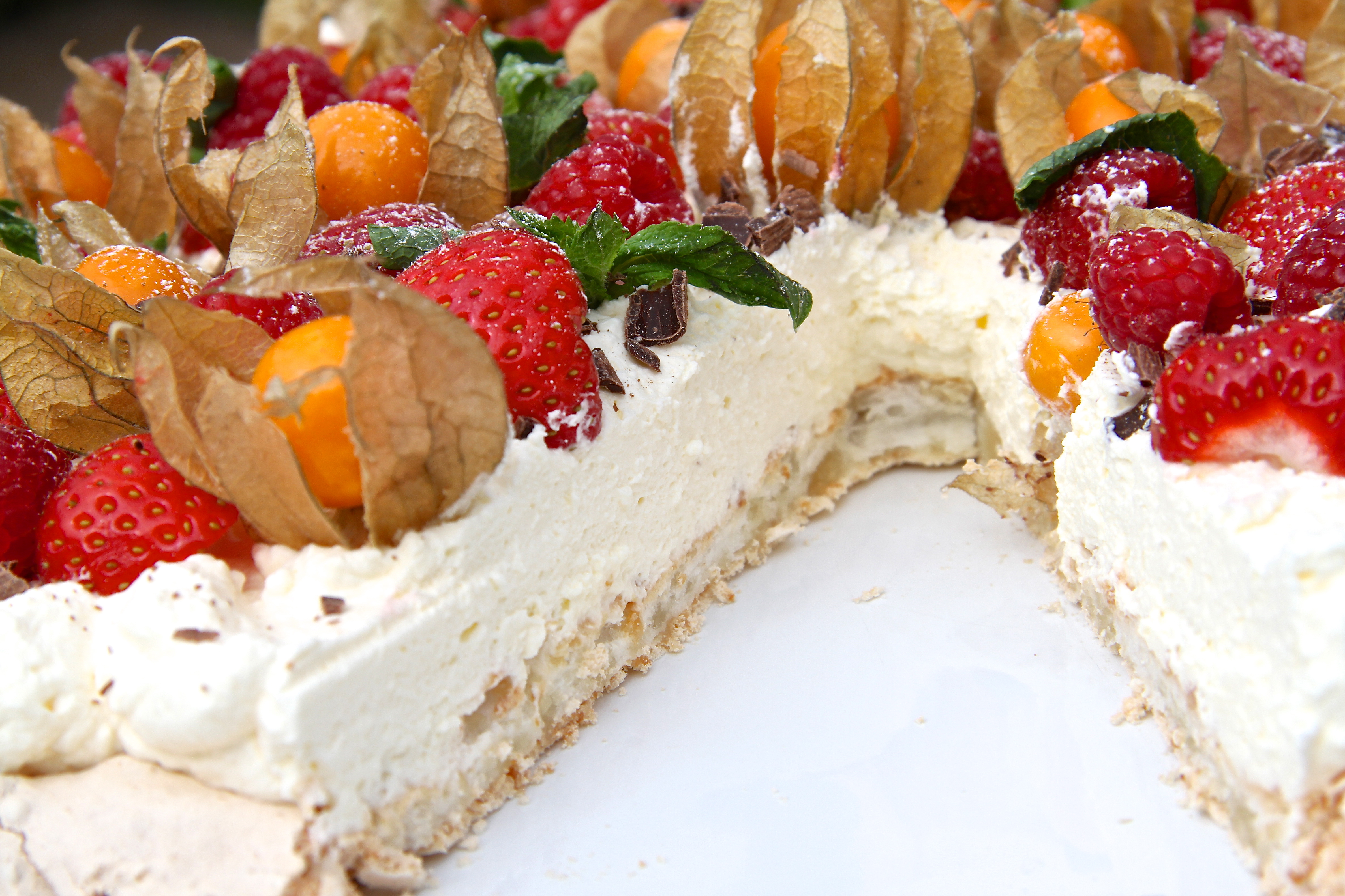 Áður en kakan er borin fram er settur þeyttur rjómi yfir marengsinn og yfir rjómann er dreift berjum, rifnu suðusúkkulaði og að lokum er örlitlum flórsykri sigtað yfir berin.
