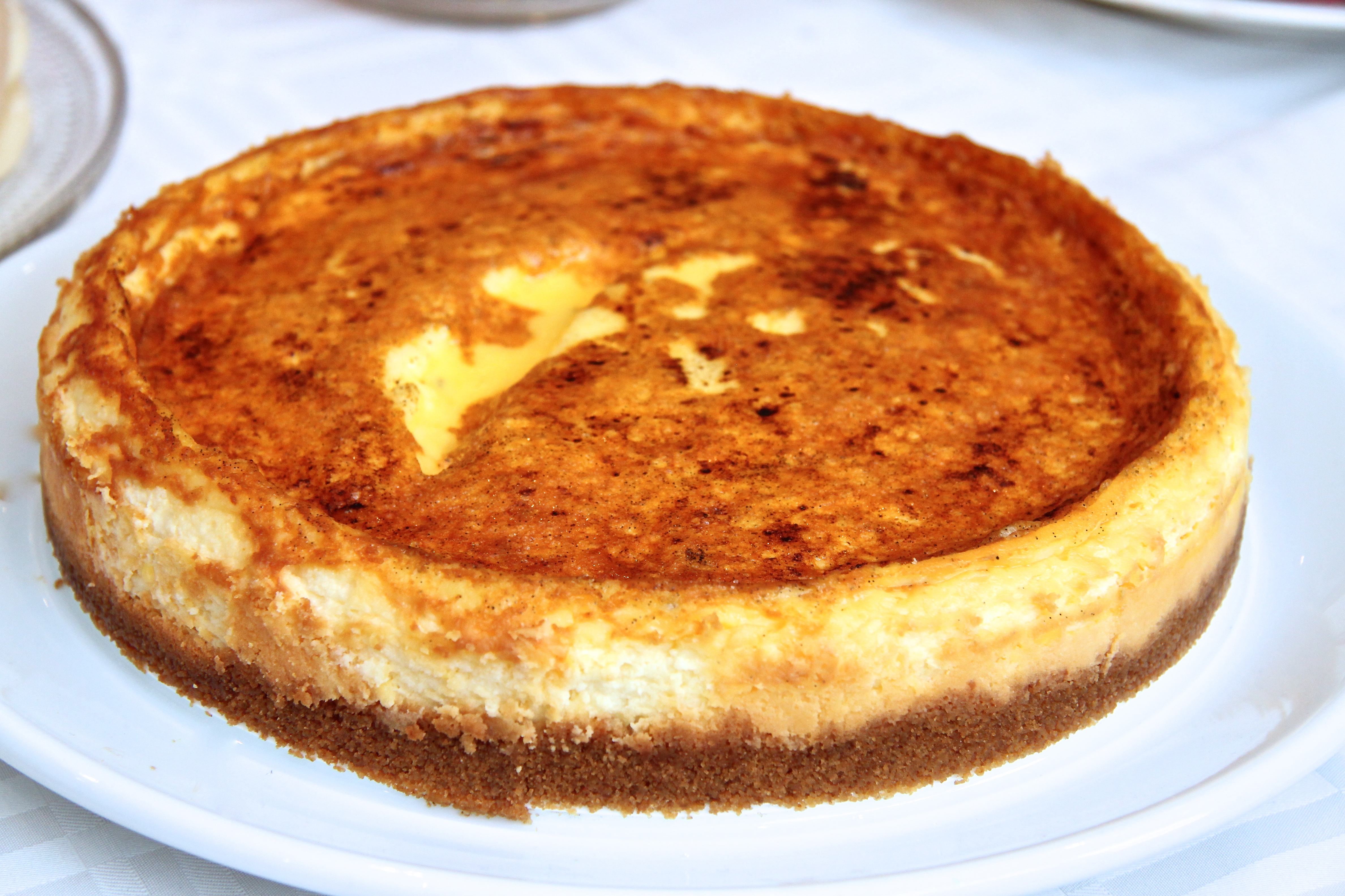Eggjarauður þeyttar þar til þær verða ljósar og léttar. Rjóminn settur í pott ásamt 4 msk af sykri og hitað að suðu, þá er potturinn tekinn af hellunni. Rjómablöndunni er svo hellt hægt og varlega út í eggjarauðurnar á meðan þær eru þeyttar á lágum hraða. Vanillustönginn er klofin í tvennt og fræin skafinn innan úr stönginni. Þeim er bætt út í blönduna. Blöndunni er síðan hellt yfir ostakökuna (sem hefur fengið að kólna aðeins eftir að hún kemur út úr ofninum). Kakan er svo bökuð áfram í ofninum í 45 mínútur við 150 gráður. Þegar kakan er tekin úr ofninum er henni leyft að kólna vel. Þá er ca. 4 msk af sykri dreift yfir kökuna og hann brenndur með gasbrennara. Ef ekki er til gasbrennari er hægt að setja kökuna í örfáar mínútur undir heitt grill í bakarofni til þess að brenna sykurinn. Kakan er svo geymd í ísskáp, bragðast best daginn eftir.