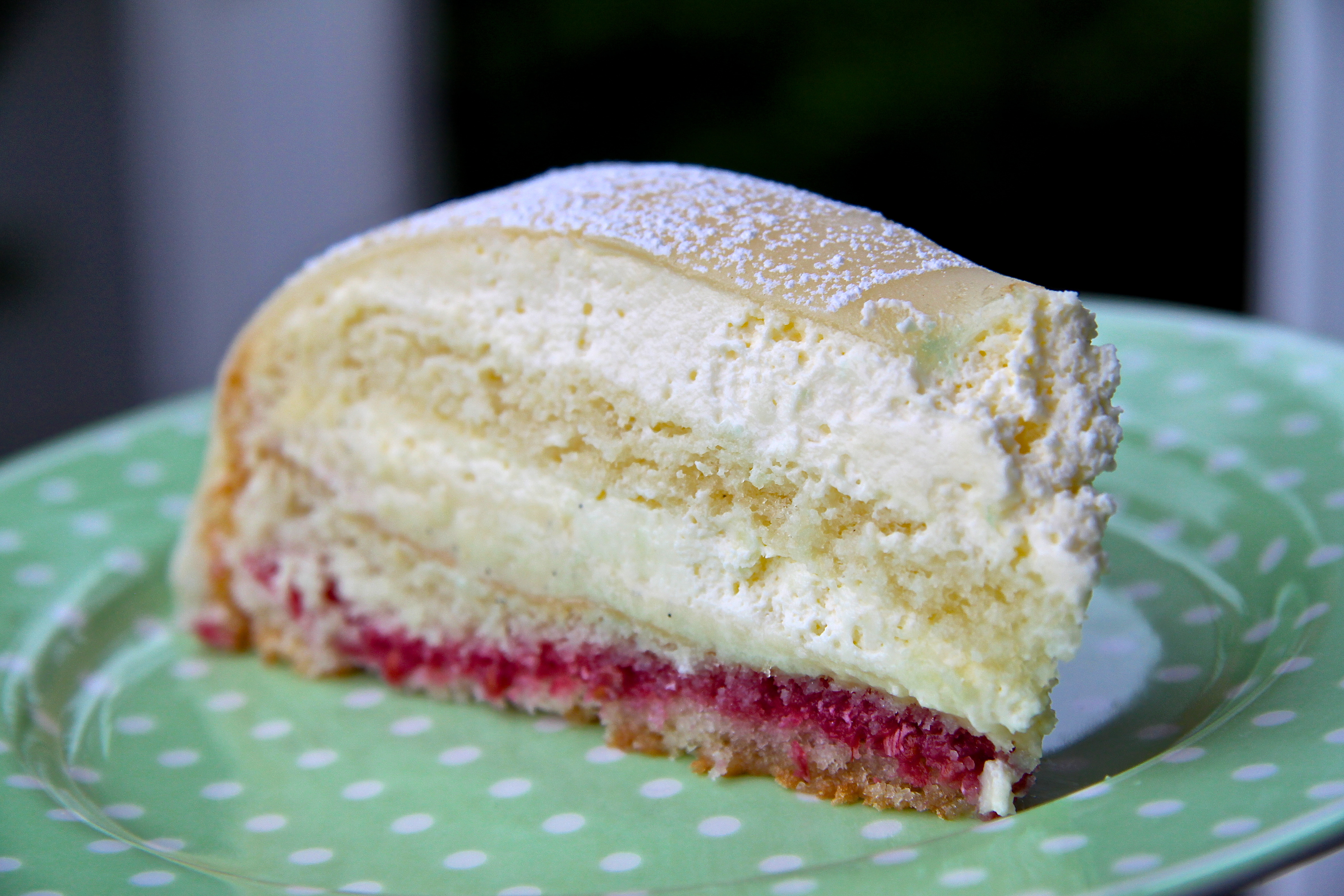 Þegar hindberin hafa þiðnað eru þau maukuð saman með gaffli (hægt að bæta við 1 tsk af sykri). Gott er að sía frá svolítið af vökvanum þannig að kökubotninn verði ekki alltof blautur undan hindberjamaukinu. Svampkökubotninn er skorinn í þrennt. Ég nota svona sniðuga græju frá Íkea til þess að skurðurinn verði jafn: