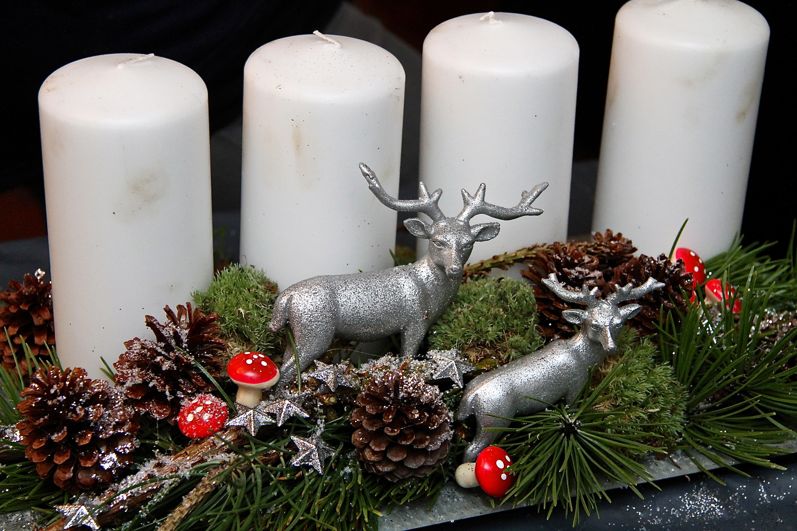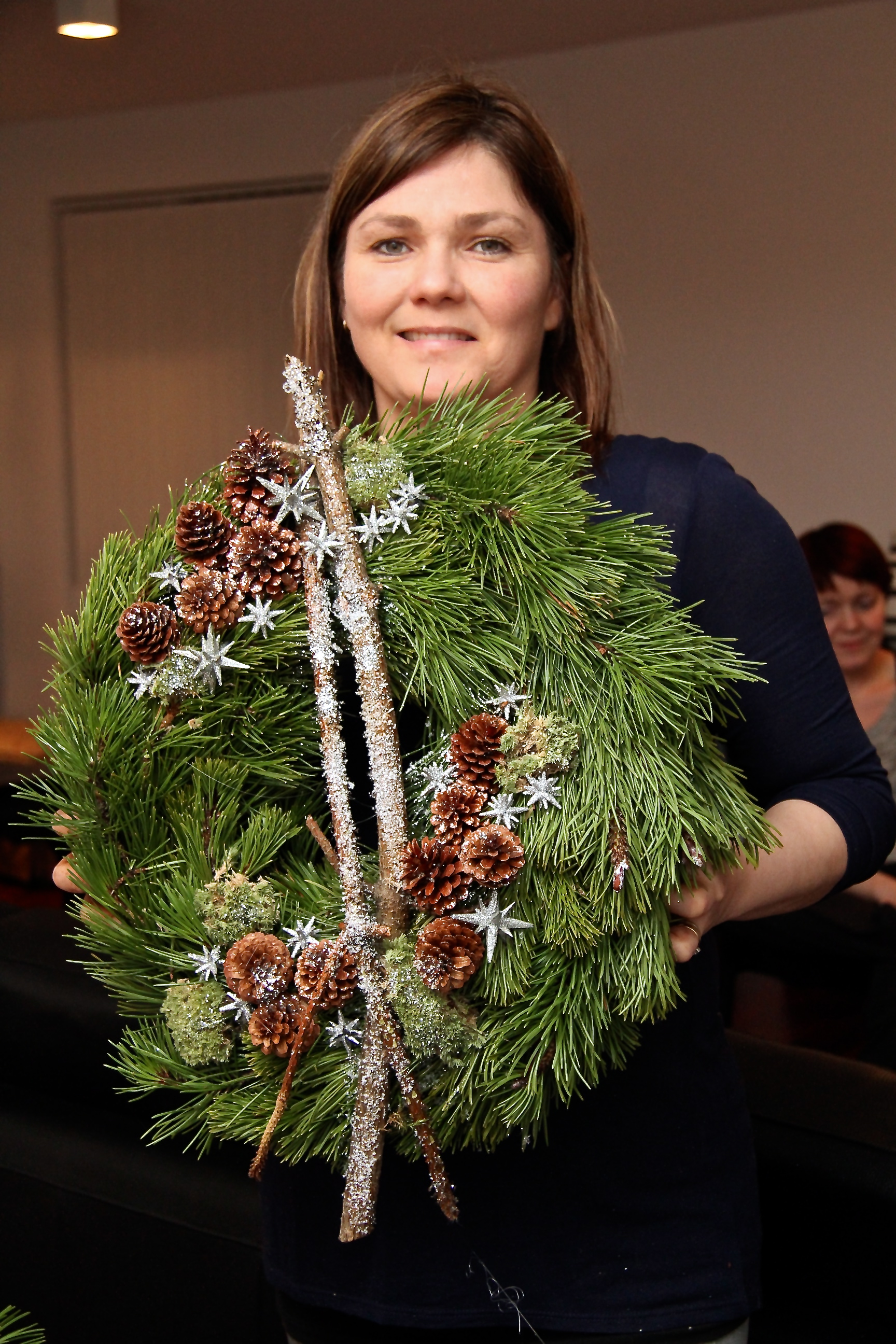 Í vikunni kom saumaklúbburinn minn líka saman og við bjuggum til kransa. Ég gerði einn á útidyrnar og einn aðventukrans. Það er mikið lán að í klúbbnum er Fríða æskuvinkona mín sem er einn færasti blómaskreytirinn á landinu (auk þess að vera farastjóri og kennari með meiru!). Það eru nokkur ár síðan við tókum upp á því að föndra kransana saman. Ég hafði aldrei gert krans áður og án Fríðu þá væru kransarnir mínir ansi dapurlegir. Verandi bókasafns- og upplýsingafræðingur þá er ég mikið fyrir röð og reglu. Ég hef til dæmis tilhneigingu til þess að vilja raða könglunum í röð … alveg jafnt … jafnvel í stærðarröð! Nokkuð sem virkar vel á bókasafni en er hörmung þegar um aðventukransa er að ræða! Fríða er búin að kenna okkur að búa til þétta og fallega kransa, raða könglum í grúppum, nota náttúrlegt skraut eins og greinar en síðast en alls ekki síst; nota glimmer og snjó í miklu magni! Það er með ólíkindum hversu miklu glimmer og gervisnjór getur breytt og lagað!