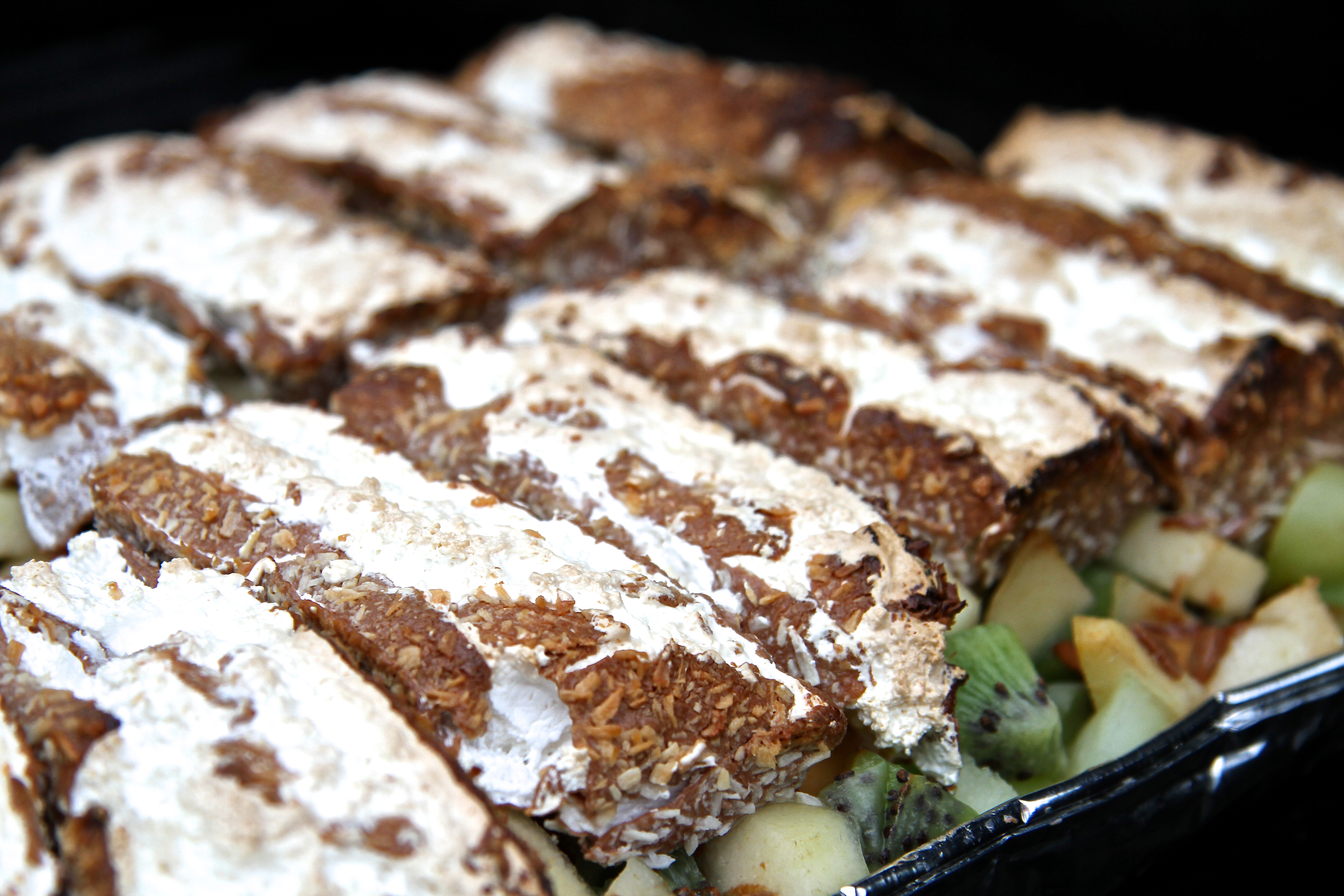 Rjómaosturinn og 150 g af sykri er hrært saman í hrærivél þar til blandan verður slétt. Þá er eggjum, einu í senn, bætt út í ásamt vanillusykri. Þessari blöndu er því næst hellt yfir heitan botninn. Eplum, 1.5 msk sykri, kanil og negul er blandað saman og dreift jafnt yfir rjómaostablönduna.
