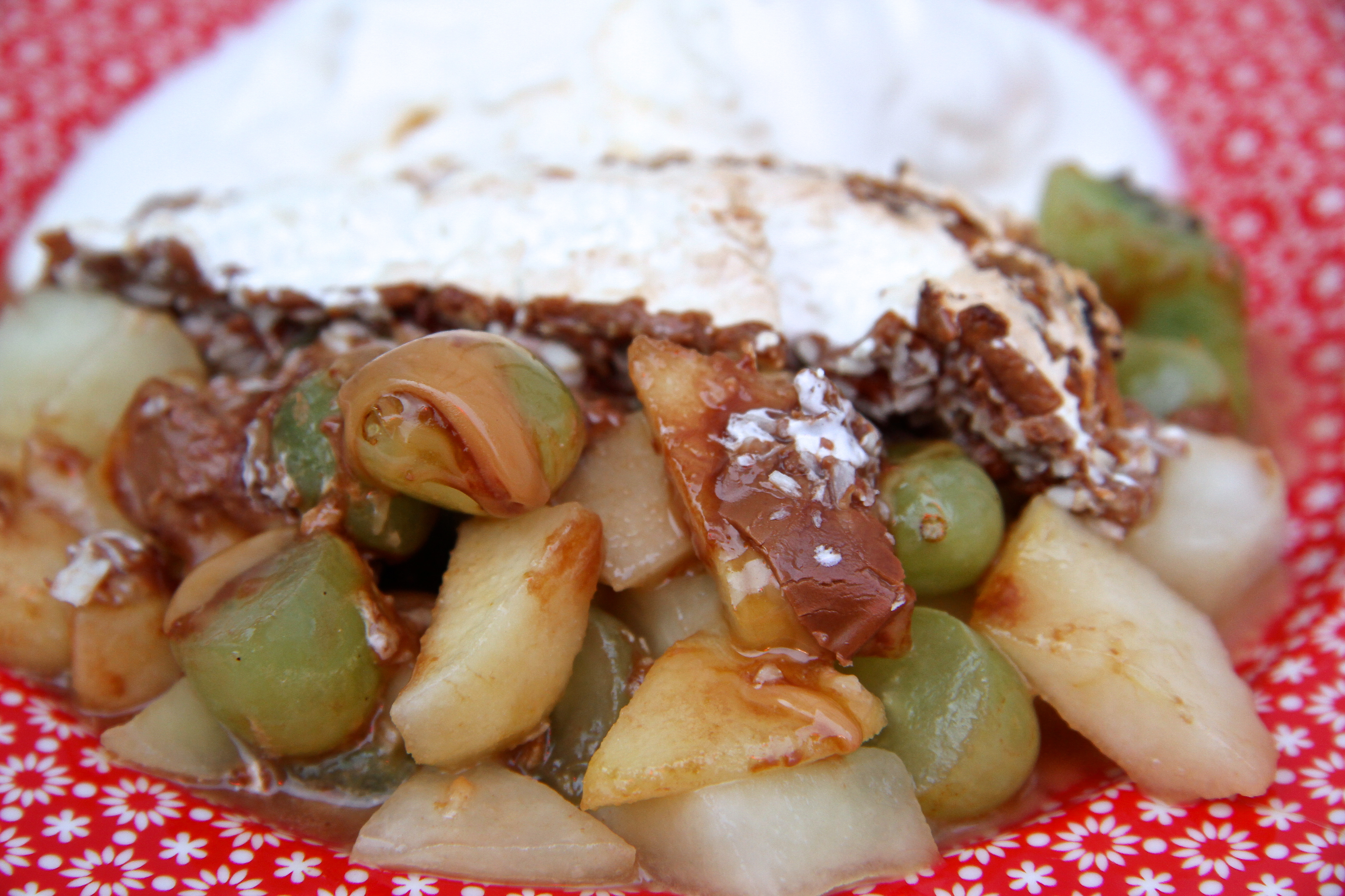 Ávöxtunum er blandað saman og settir í álbakka. Karamellurnar eru klipptar eða skornar niður í þrjá bita hver og þeim dreift yfir ávextina. Kókosbollurnar eru skornar í tvennt langsum og þeim raðað yfir ávextina þannig að hvíta kremið vísi upp. Grillað við lágan til meðalhita í um það bil 8-10 mínútur eða þar til karamellurnar eru bráðnaðar og hvíta kremið í kókosbollunum orðið stökkt. Borið fram strax með ís.