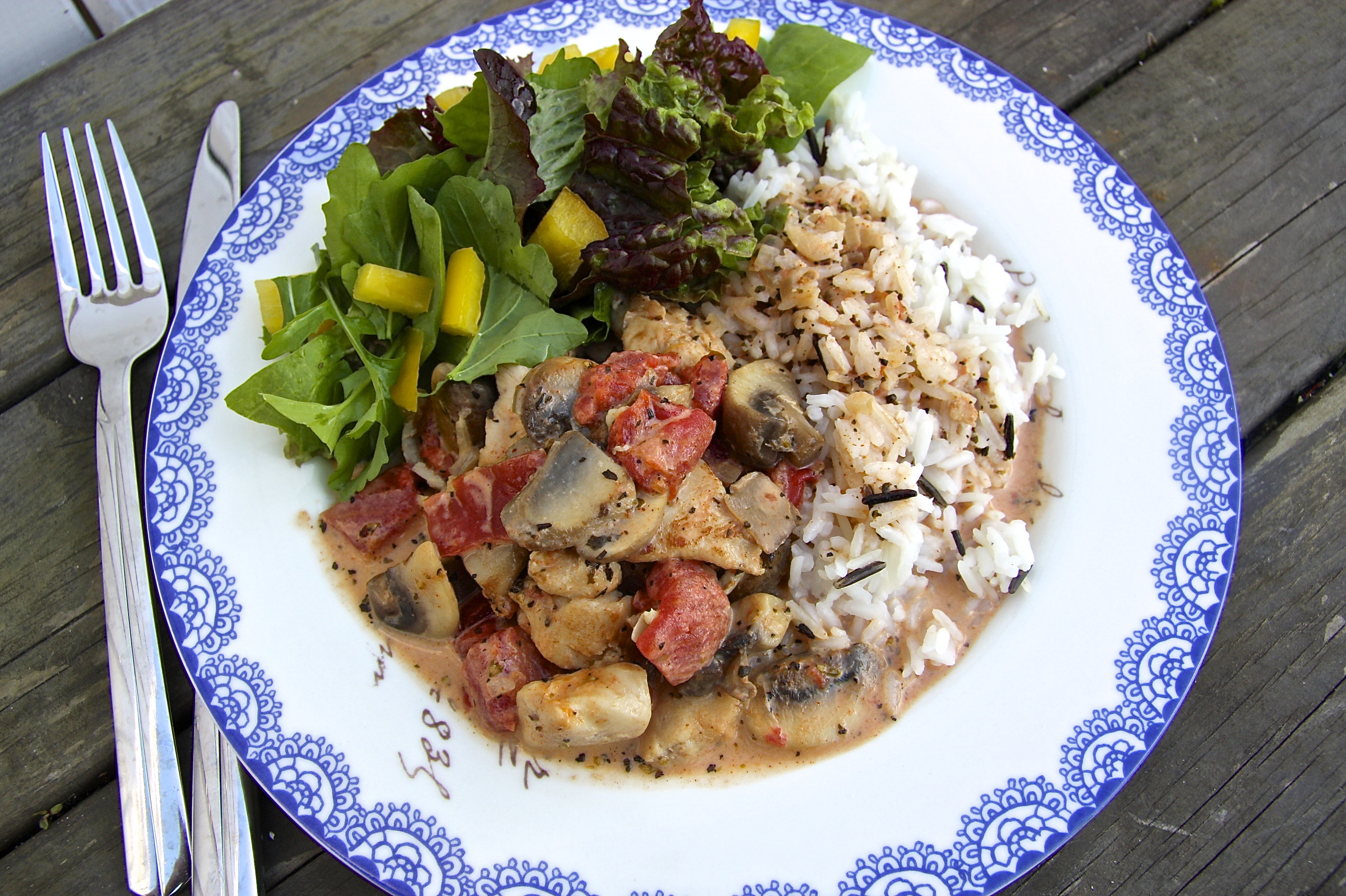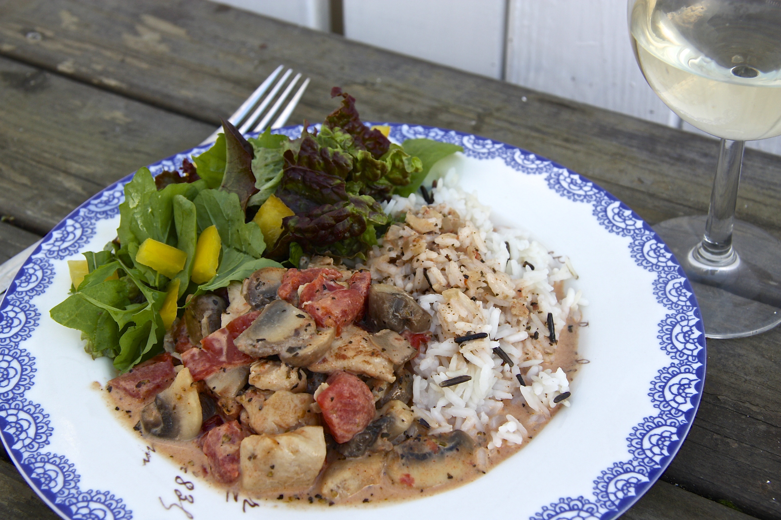 Kjúklingurinn kryddaður með salti og pipar. Laukurinn er steiktur á pönnu þar til hann er mjúkur. Því næst er kjúklingi og sveppum bætt út á pönnuna og steikt þar til hvort tveggja hefur tekið góðan lit. Þá er tómötunum, kjúklingakraftinum, hvítvíninu, rjómanum og kryddunum bætt út í og látið malla í ca. 10-15 mínútum. Smakkað til og kryddað meira við þörfum. Borið fram með góðu salati og hrísgrjónum, gott er að blanda Tilda basmati hrísgrjónunum við Tilda vilt hrísgrjón.