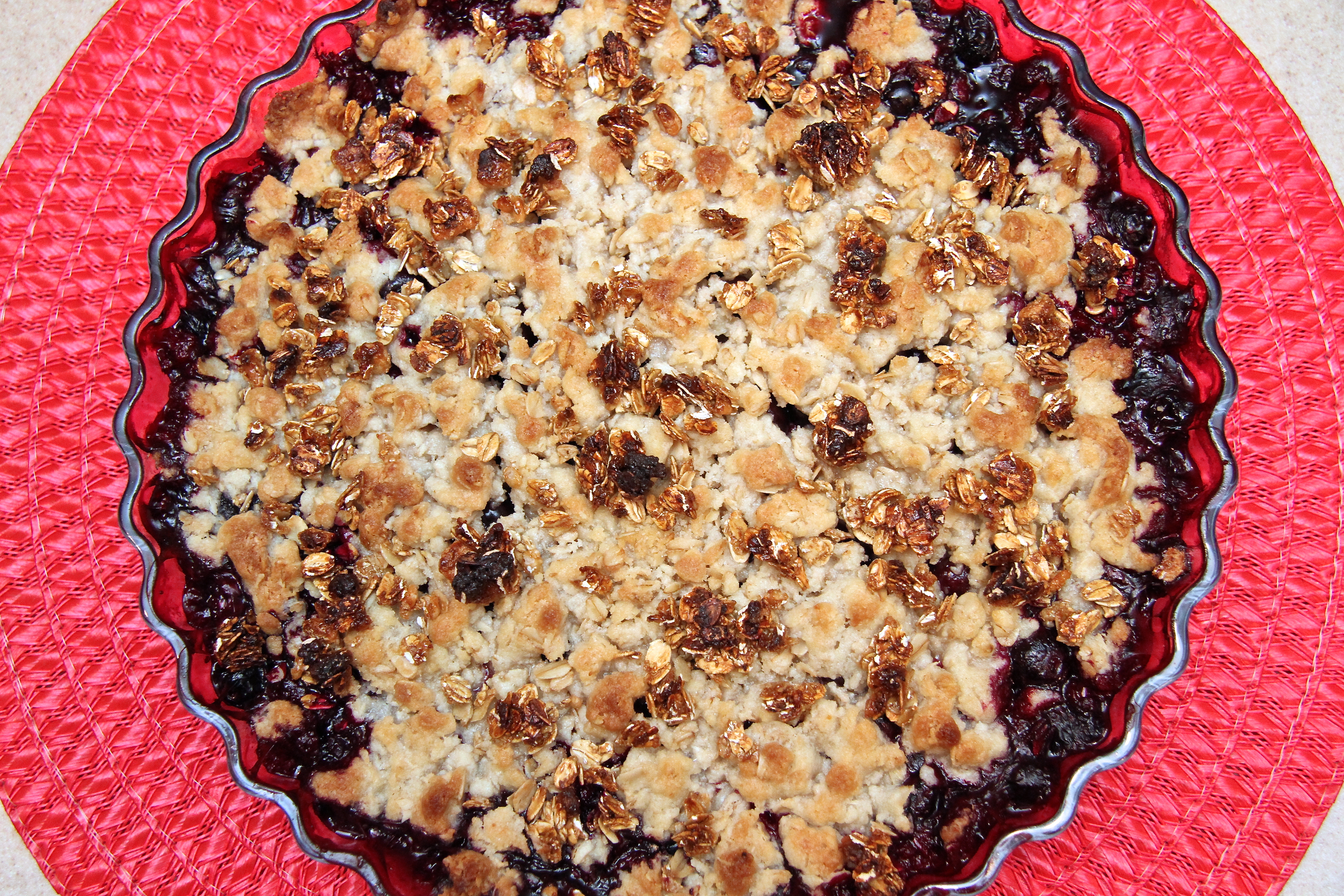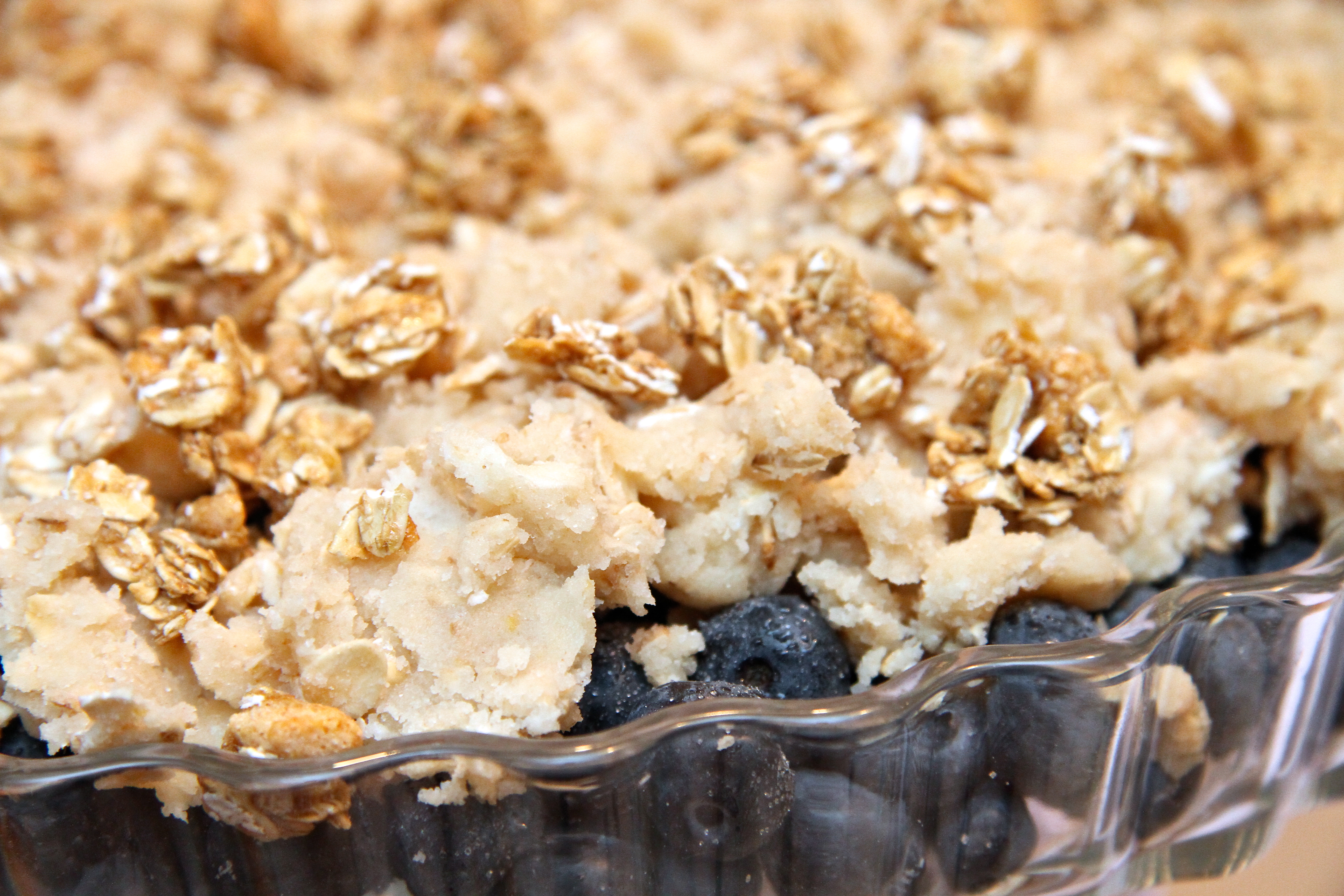 Ofn hitaður í 225 gráður við undir- og yfirhita. Bláberin eru sett í eldfast mót (kartöflumjöli dreift yfir ef þau eru frosin) og 3 tsk sykri dreift yfir berin. Smjörið er skorin niður í litla bita og sett í skál. Þá er haframjöli, hveiti, sykri, salti bætt út í, allt mulið saman með höndunum og að síðustu er múslí/granóla blandað saman við deigið. Blöndunni er því næst dreift yfir bláberin. Bakað í um það bil 20-25 mínútur við 225 gráður. Borið fram heitt með ís eða þeyttum rjóma. IMG_6735