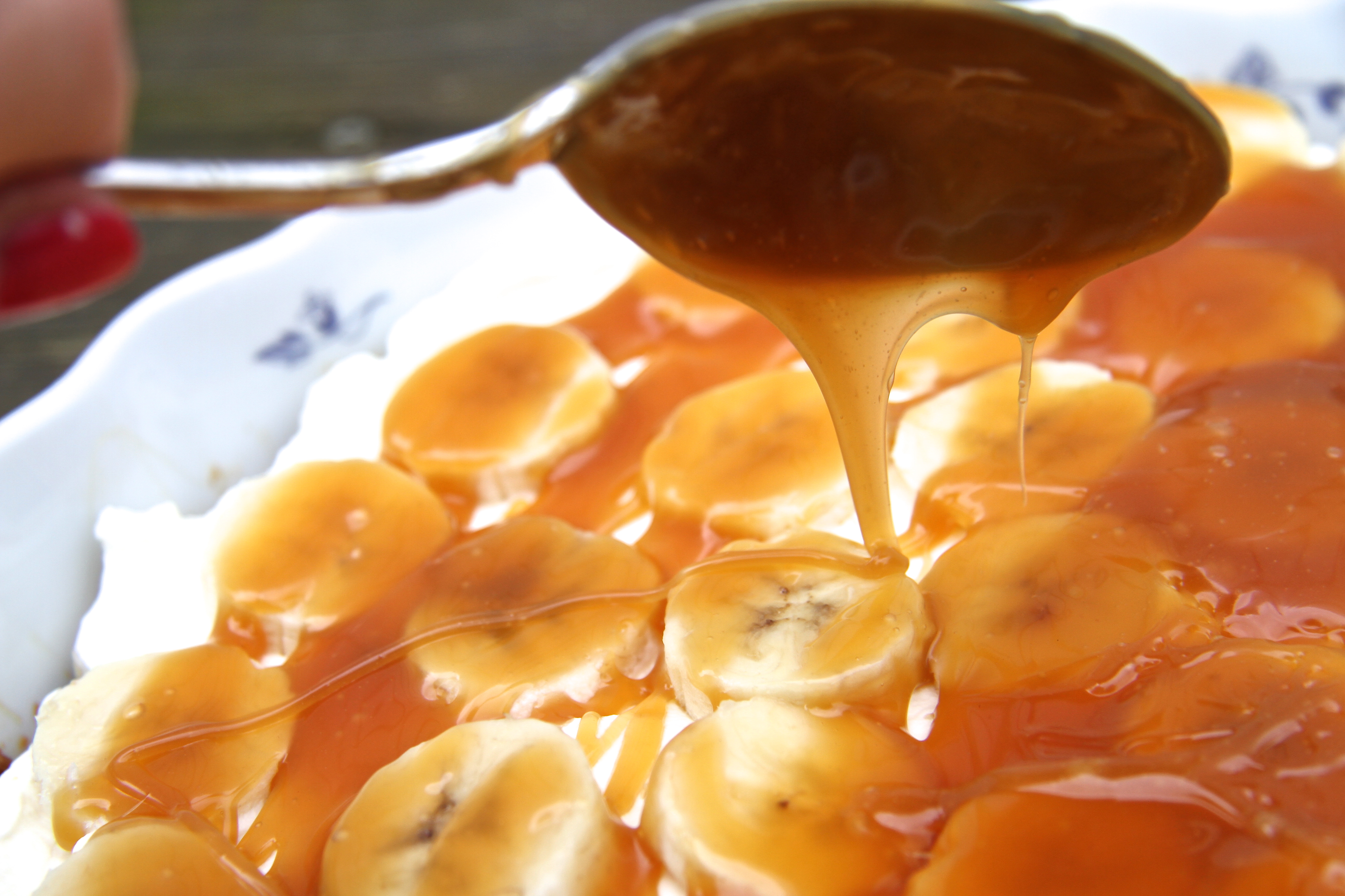 Ein kakan í afmælinu sem fékk mikið lof var þetta banana-karamellupæ. Sjálfri finnst mér allt sem hefur samsetninguna bananar, karamellur og rjómi ákaflega gott. Ég setti inn uppskrift af svipaðri böku hér en það þarf að hafa meira fyrir henni enda er karamellusósan heimagerð. Þetta pæ er hins vegar ótrúlega fljótlegt og einfalt en sjúklega gott og hentar mjög vel sem eftirréttur. Hugmyndin kom út frá þessari karamellusósu sem ég keypti í Þinni verslun og var búin að eiga inni í skáp þónokkuð lengi. Ég fór á síðuna hjá þeim og sá að þessar vörur eru seldar á eftirfarandi stöðum: í Melabúðinni, Hagkaup Garðabæ, Hagkaup Kringlunni, Ostabúðinni Skólavörðustíg, Vínberinu Laugavegi, Garðheimum, Kjöthöllinni Háaleitisbraut, Þinni Verslun í Breiðholti, Mjólkurstöðinni Neskaupsstað, Blómasetrinu Borganesi og Býflugan og blómið á Akureyri.