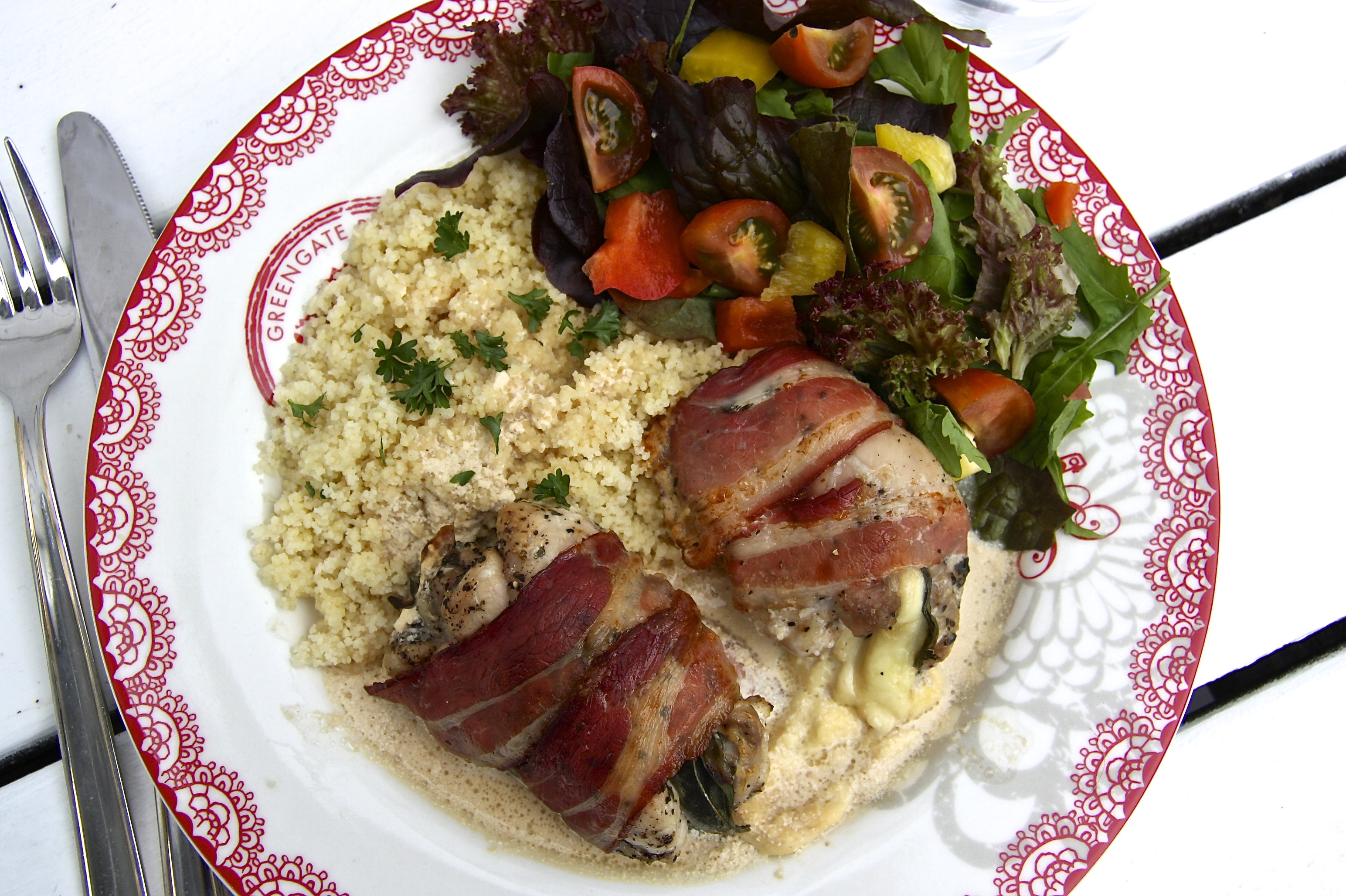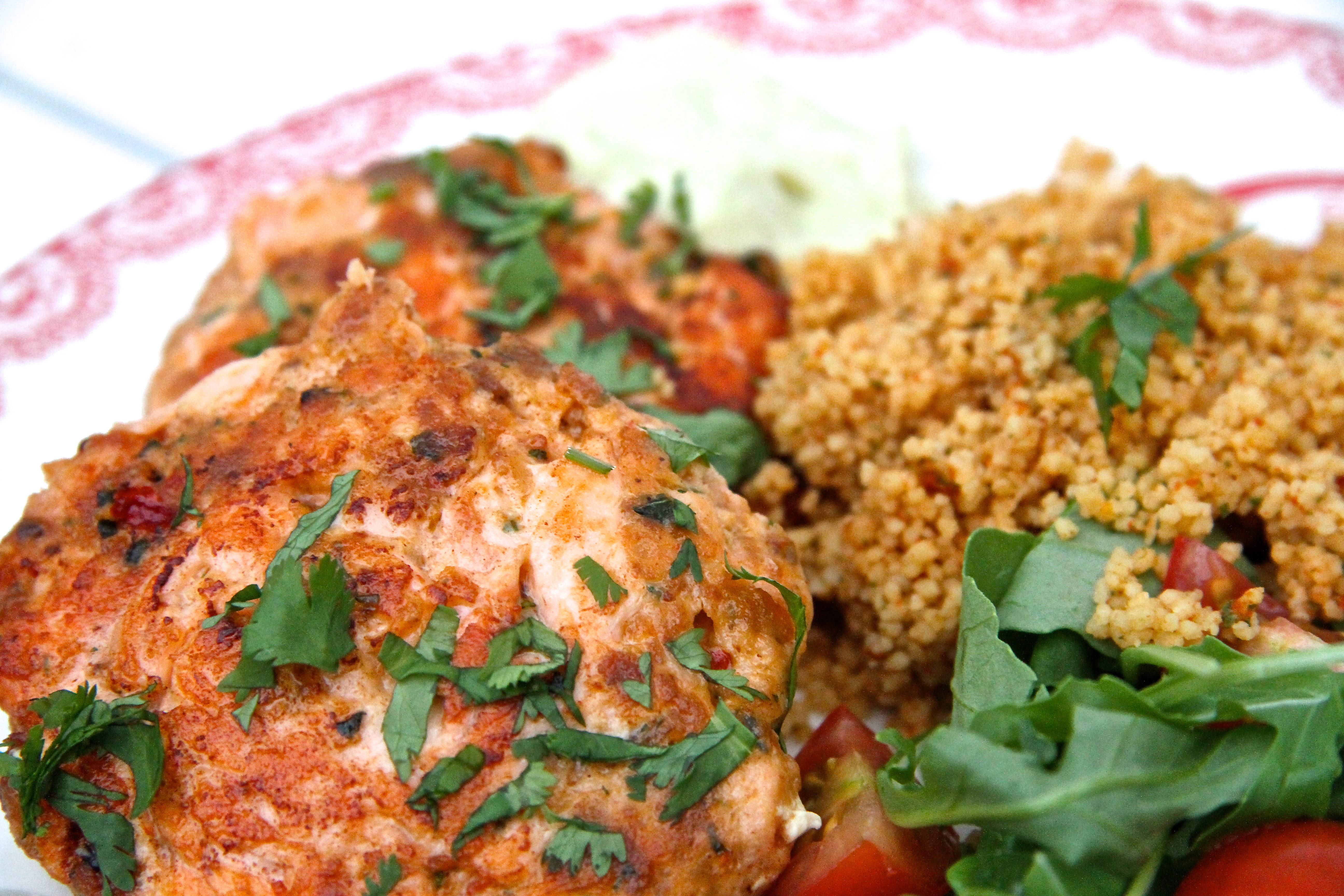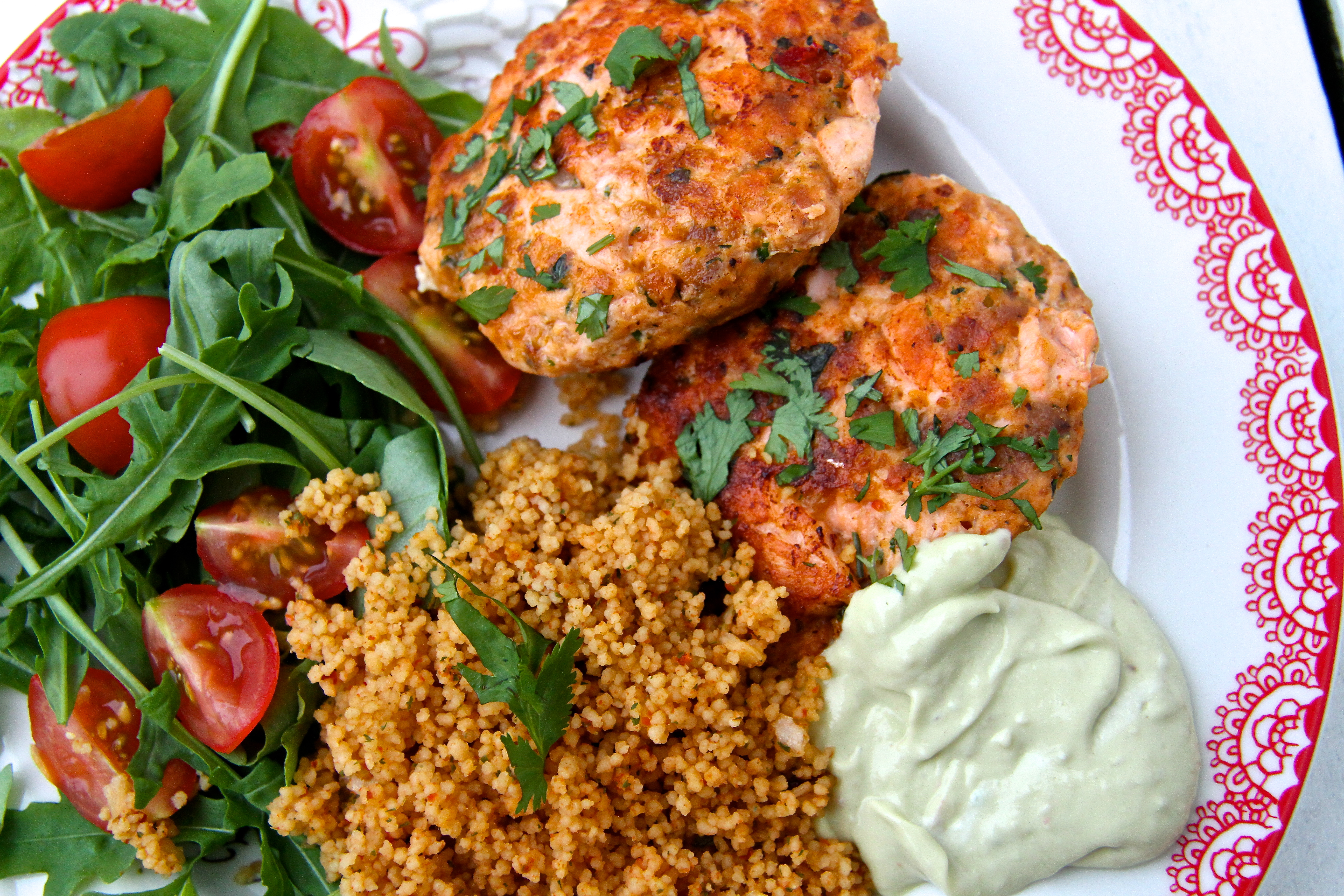 Það er lengri aðdragandi að sumum réttum en öðrum. Þessi réttur er einn af þeim, samt er þetta þó einn fljótlegasti réttur sem ég hef gert lengi. Þetta byrjað allt með því að ég fékk svo góðan laxaborgara á Nauthól – það var fyrir þremur árum. Ég reyndi að endurskapa hann heima með ágætis árangri – það var fyrir tveimur árum (uppskriftin er hér). Það var svo í sumar að Vilhjálmur minn átti 14 ára afmæli og ákvað að bjóða til hamborgaraveislu fyrir stórfjölskylduna. Einn fjölskyldumeðlimurinn borðar ekki kjöt og ég ákvað því að kaupa lax og gera svona laxaborgara fyrir hann. Eitthvað skolaðist skipulagið til hjá mér því bókstaflega fimm mínútum áður en afmælið byrjaði mundi ég allt í einu eftir þessum laxaborgurum og ég átti ekki einu sinni til allt hráefnið í þá fyrir utan laxinn. Í loftköstum henti ég laxinum í matvinnsluvélina ásamt hráefni sem ég fann til. Ég til dæmis átti ekki brauðmylsnu og ristaði bara brauð í staðinn og sleppti lauknum því ég hafði ekki tíma til að saxa hann. Svo setti ég matvinnsluvélina í gang en viti menn, hún snéri hnífnum í einn hring og dó svo! Það sem ég vissi ekki þá var að þetta var það besta sem gat gerst. Gestirnir voru farnir að streyma inn og ég átti eftir að gera laxaborgarana og mangósósuna. Ég réðst þá með offorsi á laxinn með töfrasprota að vopni og reyndi að mauka allt saman en töfrasprotinn réði illa við laxinn þannig að maukið varð mjög gróft. Ég hafði ekki tíma til að hugsa um það heldur mótaði nokkra grófa borgara í flýti og skellti þeim á pönnuna. Til að gera langa sögu stutta þá voru þetta bestu laxaborgara sem ég hef smakkað og þeir voru mikið vinsælli en venjulegu hamborgararnir. Svo fór að ég þurfti að stoppa gestina af þannig að eitthvað yrði eftir fyrir gestinn sem var ætlað að fá laxaborarana. Galdurinn var nefnilega að leyfa hráefninu að njóta sín og hafa laxinn grófan, ekki mauka hann í hakk. Einnig þarf að passa að steikja þá bara stutt. Eftir þetta er ég stöðugt búin að hugsa um að mig langi að gera sambærileg laxabuff og var alltaf að velta fyrir mér hvaða sósu ég ætti að prófa með þeim. Um síðustu helgi kom svo sósan til mín! Þá slógum við systkinin saman í hamborgaraveislu og mágkona mín gerði dásemdarsósu úr avókadó, sýrðum rjóma og sweet chili sósu. Ég sá í hendi mér að þetta væri sósa sem myndi passa eins og hönd í hanska við laxabuffin. Í gærkvöldi útbjó ég laxabuffin og sósuna, það tók ekki meira en korter. Ég hafði með þeim tómatkúskús og ferskt salat … Jerimías hvað þetta var gott – sumir mánudagar eru einfaldlega betri en aðrir! 🙂