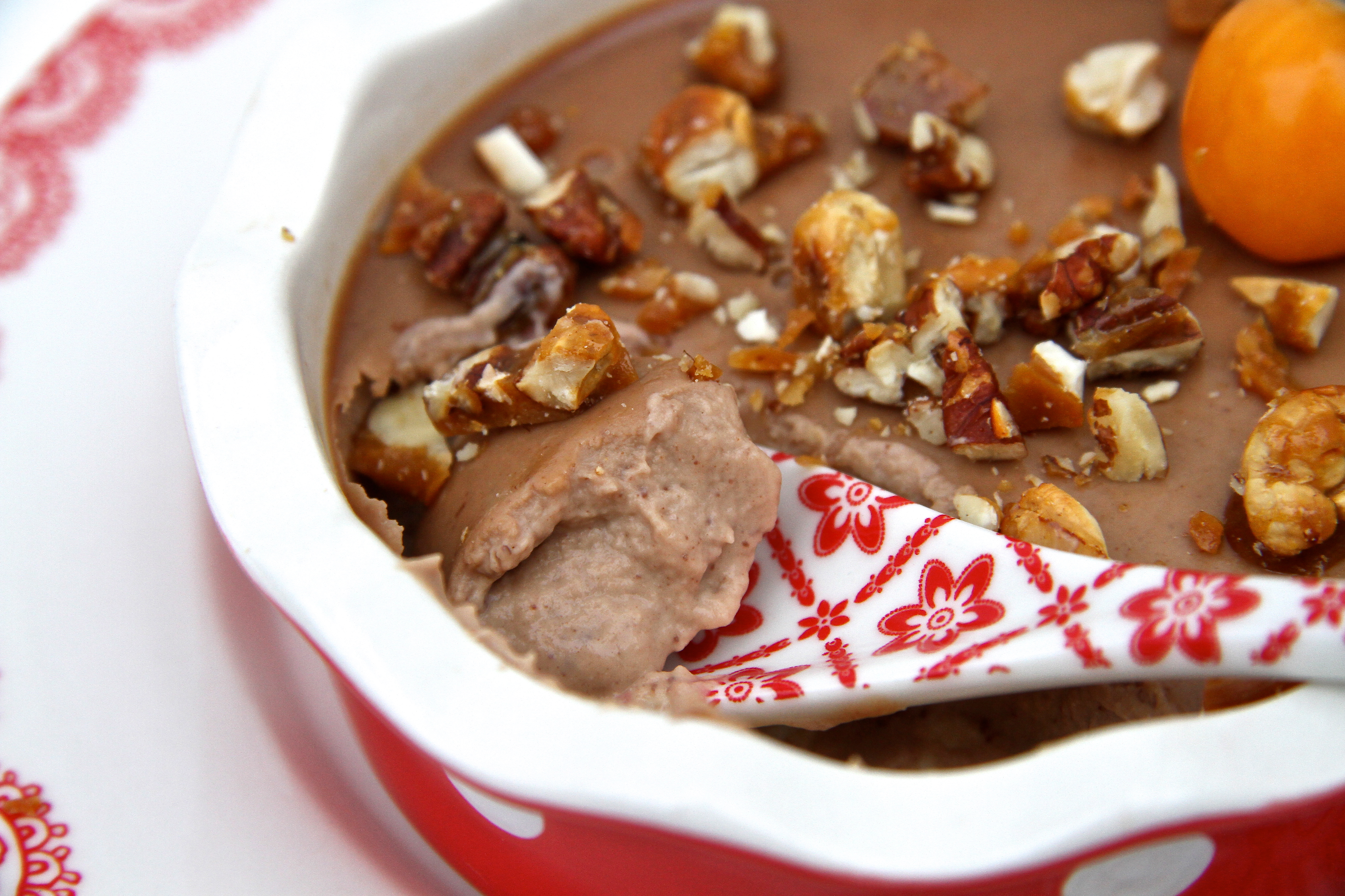 Matarlímsblöðin eru lögð í skál með köldu vatni í minnst 5 mínútur. Rjómi og sykur sett í pott og látið ná suðu. Þá er potturinn tekinn af hellunni og Dumle molunum bætt út í pottinn. Hrært þar til þeir hafa hafa bráðnað. Því næst er vökvinn kreistur úr matarlímsblöðunum, þeim bætt út í pottinn og hrært þar til þau hafa leyst upp. Hellt í þrjár skálar eða bolla og kælt í ísskáp í minnst 2 klukkutíma. Hneturnar eru settar á pönnu ásamt sykri og smöri við meðalhita, hrært stöðugt í blöndunni. Þegar sykurinn hefur brúnast og hneturnar karamelliseras er þeim hellt á bökunarpappír og leyft að kólna. Þegar hneturnar eru orðnar kaldar eru þær saxaðar niður gróft og dreift yfir panna cotta. Skreytt með berjum að vild.