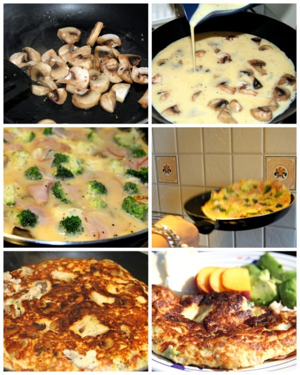 Setjið egg og eggjahvítur í skál ásamt mjólk, pískið þessu létt saman, bætið kryddinu út í. Skerið sveppina fremur gróft og steikið þá á pönnu. Því næst er eggjahrærunni hellt út á pönnuna. Skinkan er skorin niður í bita ásamt brokkolíi og hvoru tveggja bætt út í ásamt ostinum Látið eggjakökuna malla á meðalhita, gætið þess að hafa hann ekki of háan þannig að eggjakakan brenni ekki. Pikkið í hræruna á meðan hún er að þykkna til að flýta fyrir.