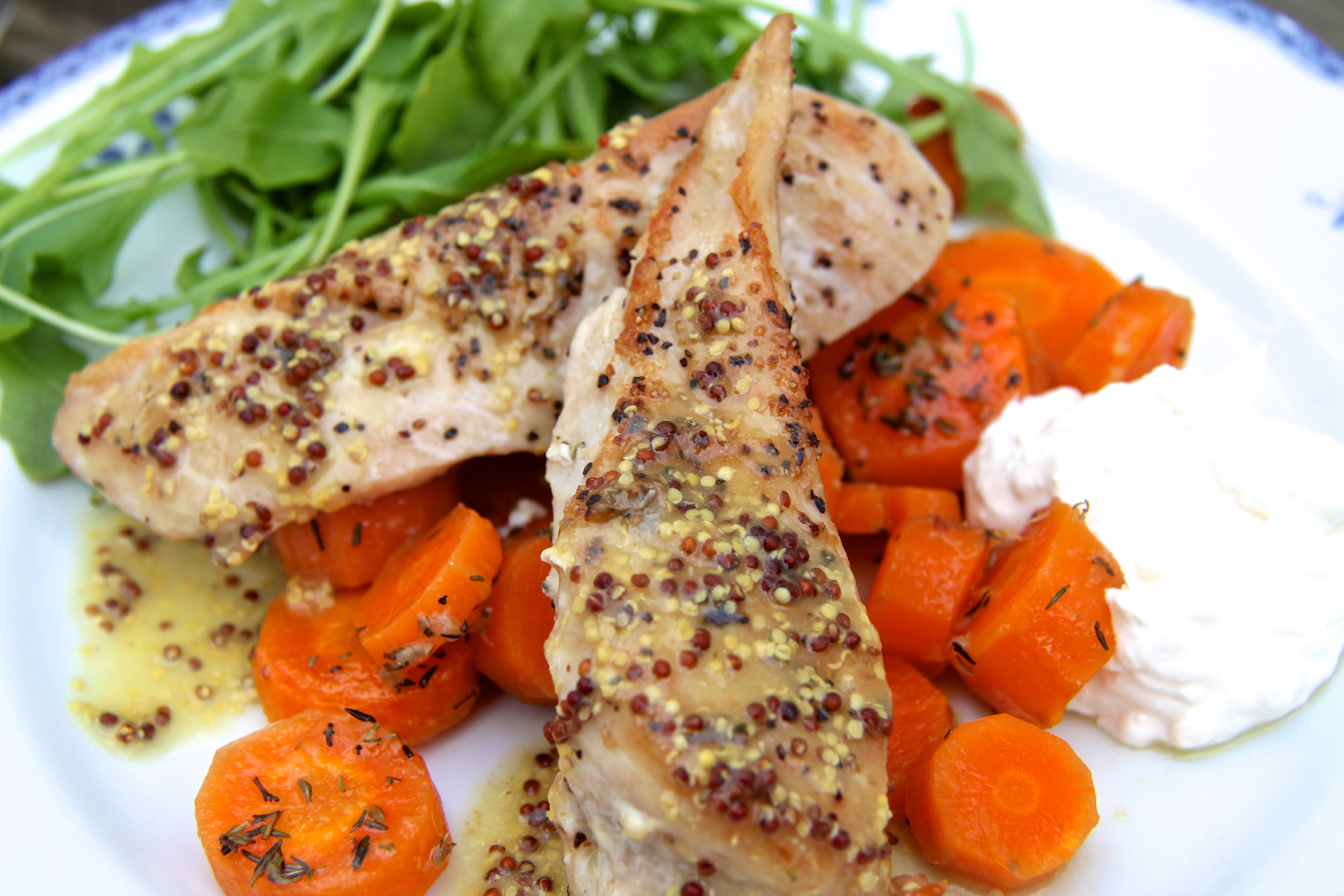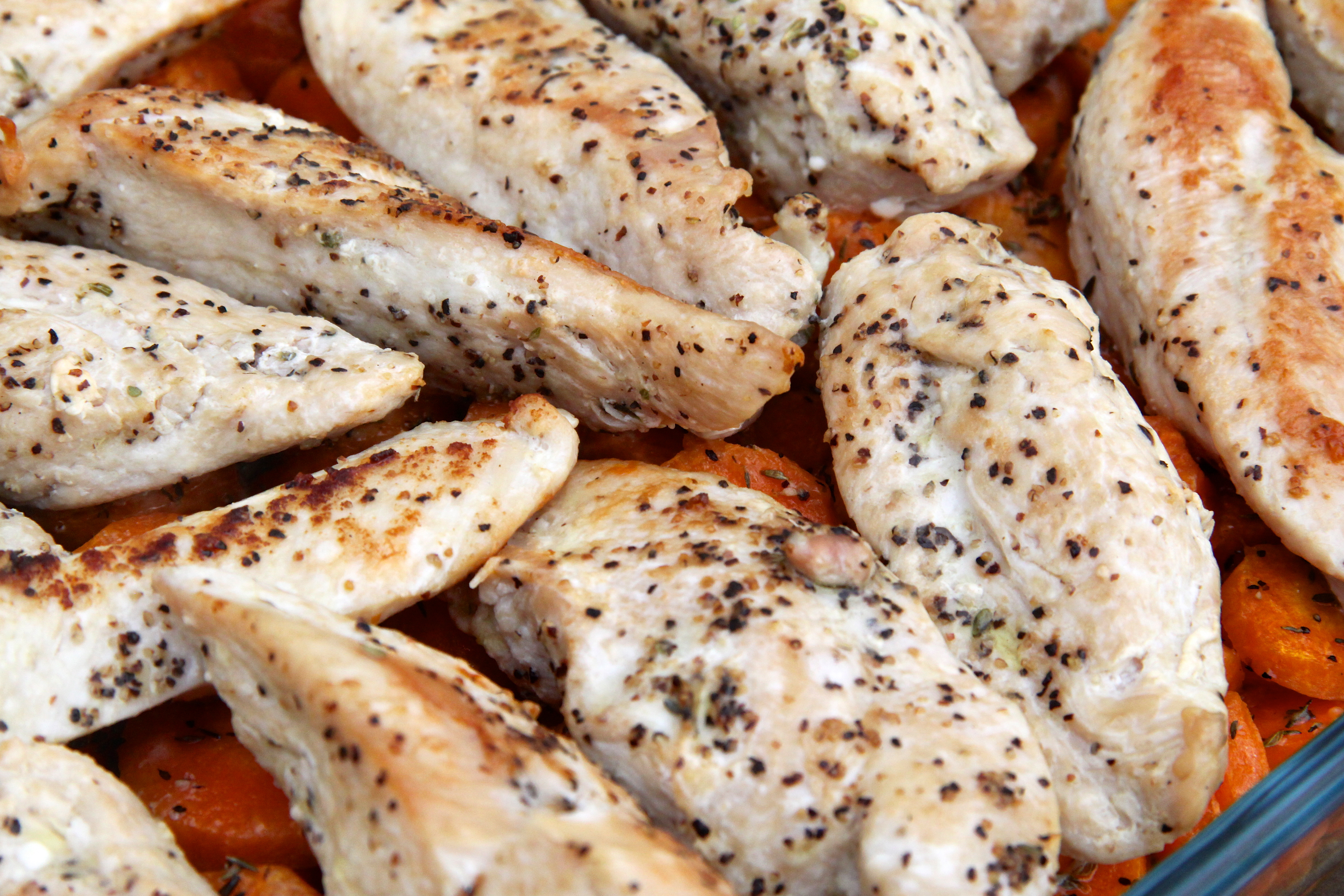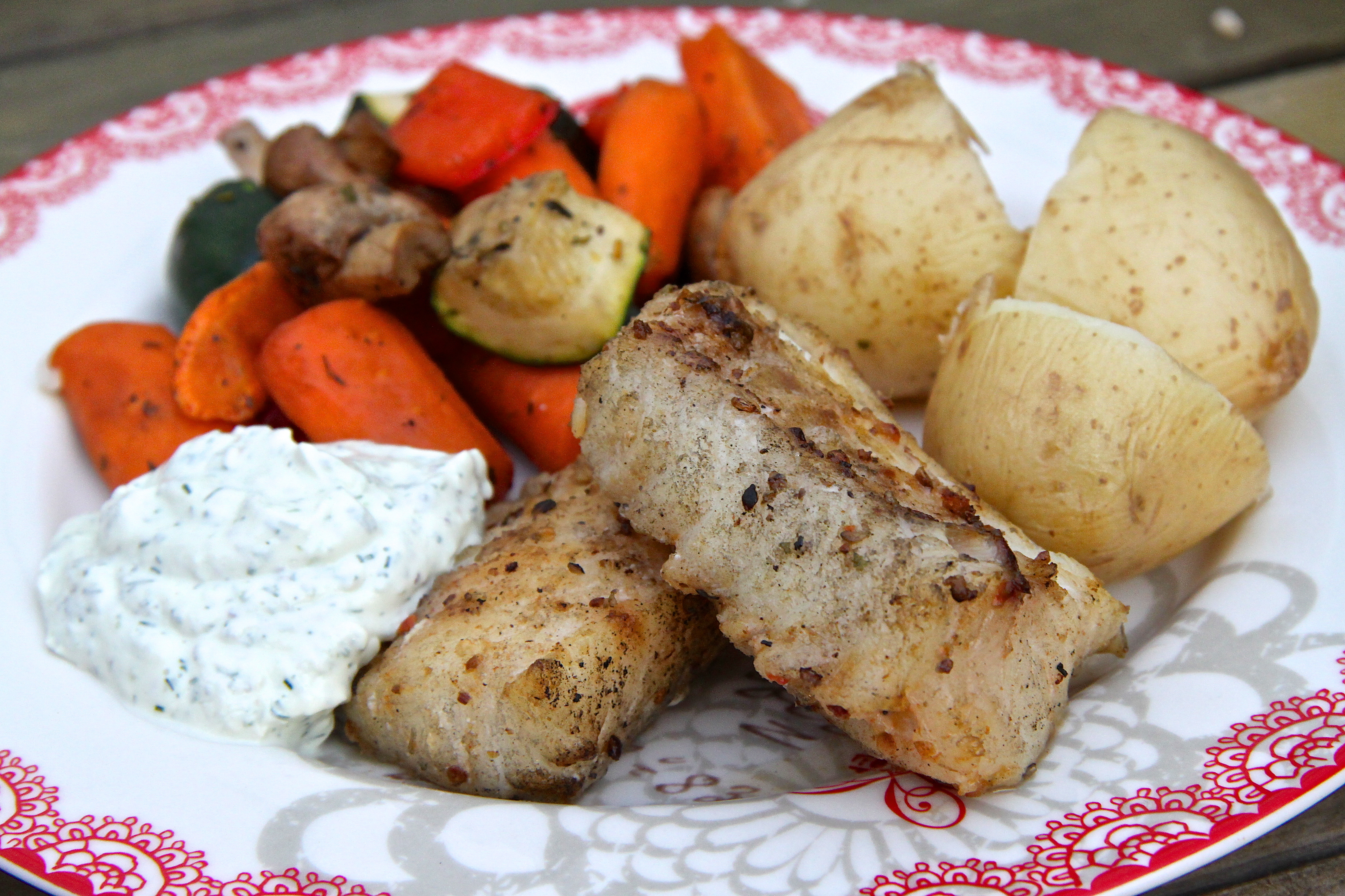 Bakarofn hitaður í 200 gráður. Kartöflur skornar í báta eða í tvennt ef þær eru litlar. Gulrætur eru einnig skornar í bita. Hvor tveggja sett í ofnskúffu og blandað við dálitla ólífuolíu, kryddað með salti, pipar og rósamarín. Bakað í ofni í ca 20 mínútur. Þá er ofnskúffan tekin út og losað dálítið um kartöflurnar og gulræturnar. Paprikum, lauk og kokteiltómötum bætt út í, þá er kjúklingurinn lagður ofan á (ef afgangur er af marineringunni er henni líka dreift yfir), ólífum dreift yfir og endað á því að mylja fetaostinn yfir alltsaman. Rétturinn er settur aftur inn í ofn og eldaður í ca. 30-35 mínútur eða þar til kjúklingurinn er tilbúinn. Borið fram með tzatziki jógúrtsósu.
