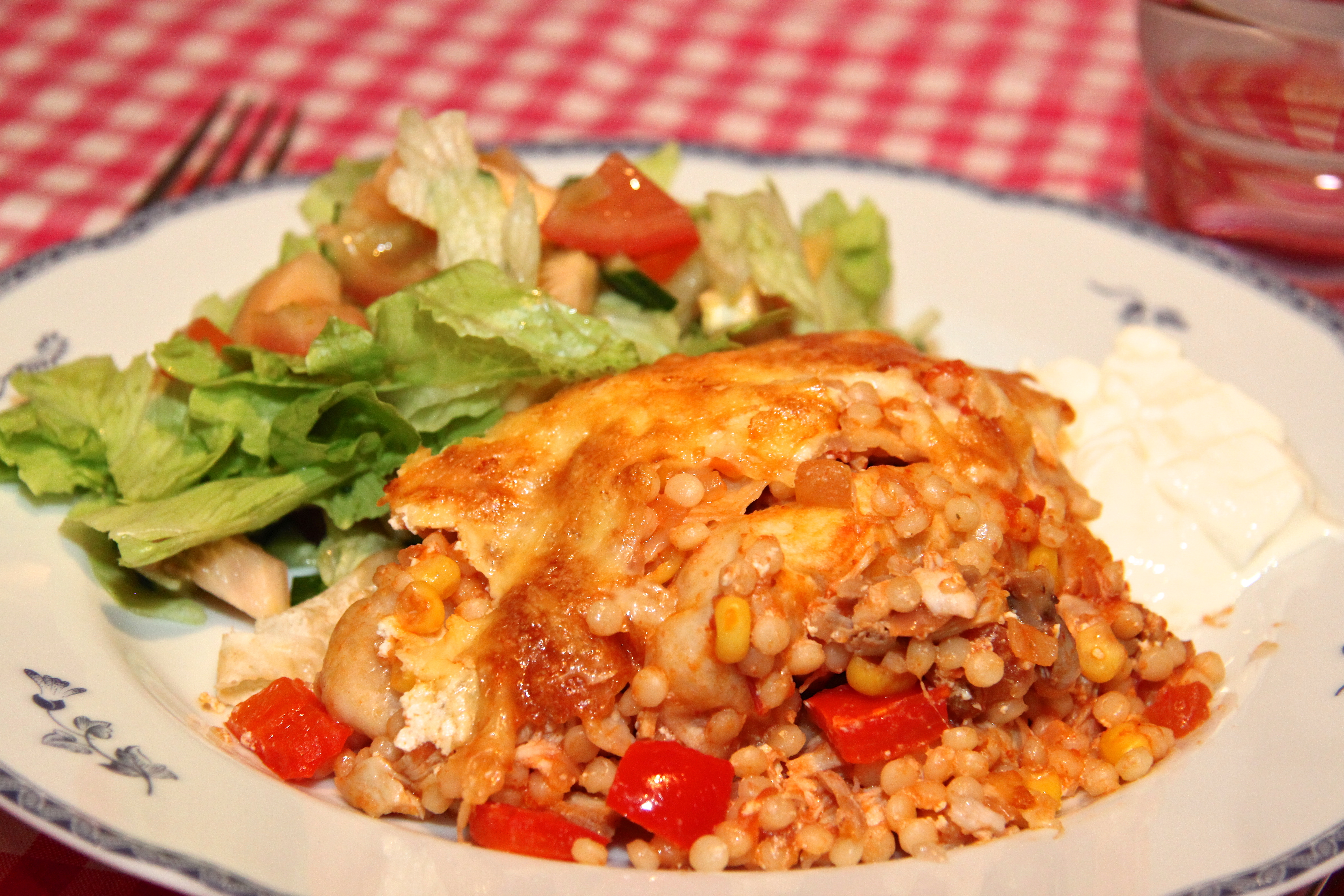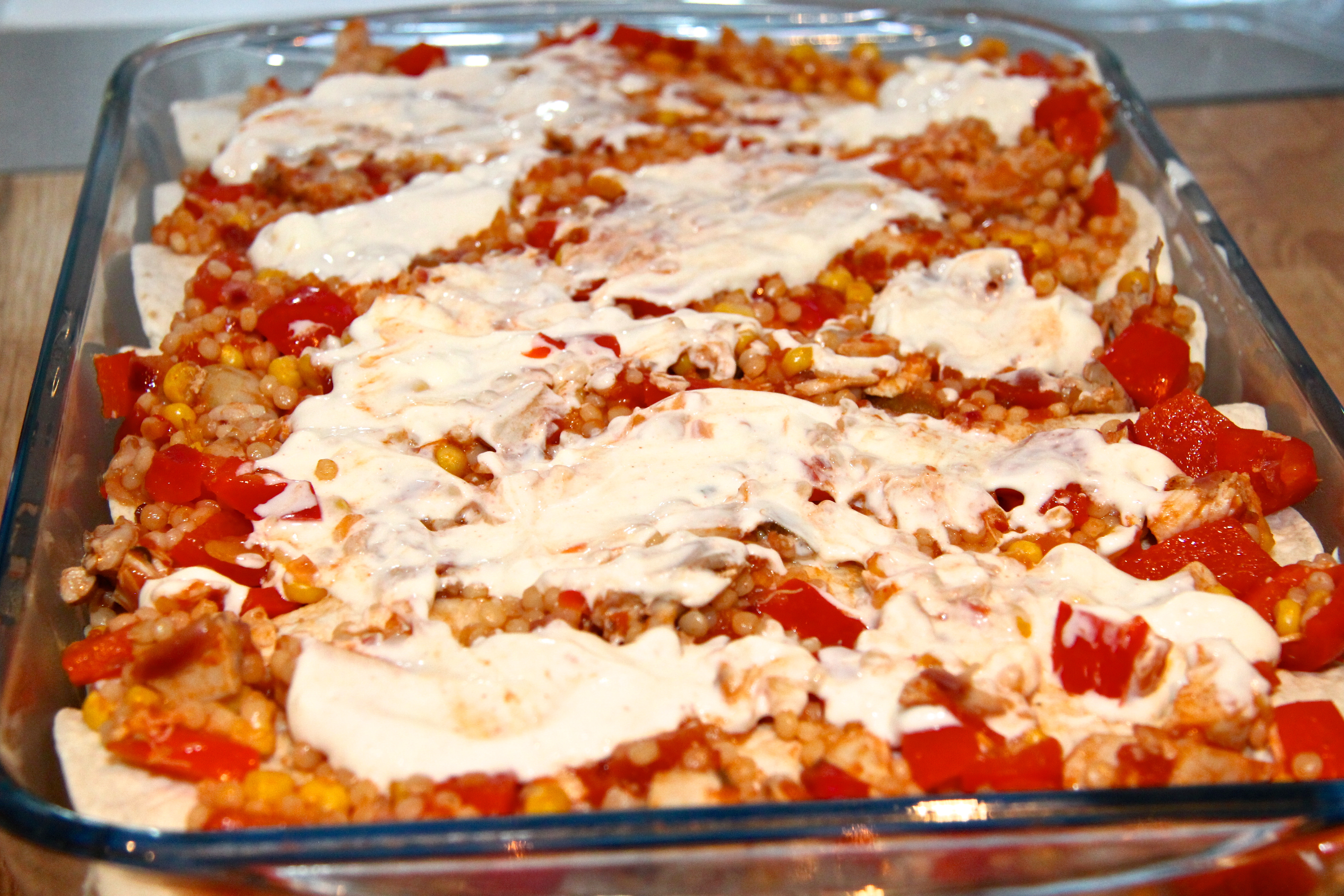 Mexíkóskur matur er alltaf jafn vinsæll heima hjá okkur. Ég gerði þetta burritogratín í nýrri útgáfu. Ástæðan var einföld, ég uppgötvaði að hrísgrjónin voru búin en hins vegar átti ég perlukúskús. Það er eins og kúskús en kúlulaga, stærra og þykkara, með eins og pastaáferð. Afskaplega gott og í miklu uppáhaldi hjá okkur öllum, sérstaklega krökkunum. Það kom afar vel út að nota perlukúskús í þennan rétt, ég held að ég taki það fram yfir hrísgrjónin. Perlukúskús er til í Hagkaup, Þinni verslun, hjá Tyrkneskum bazar og örugglega í fleiri verslunum en ég hef hvorki séð það í Krónunni eða Bónus enn.