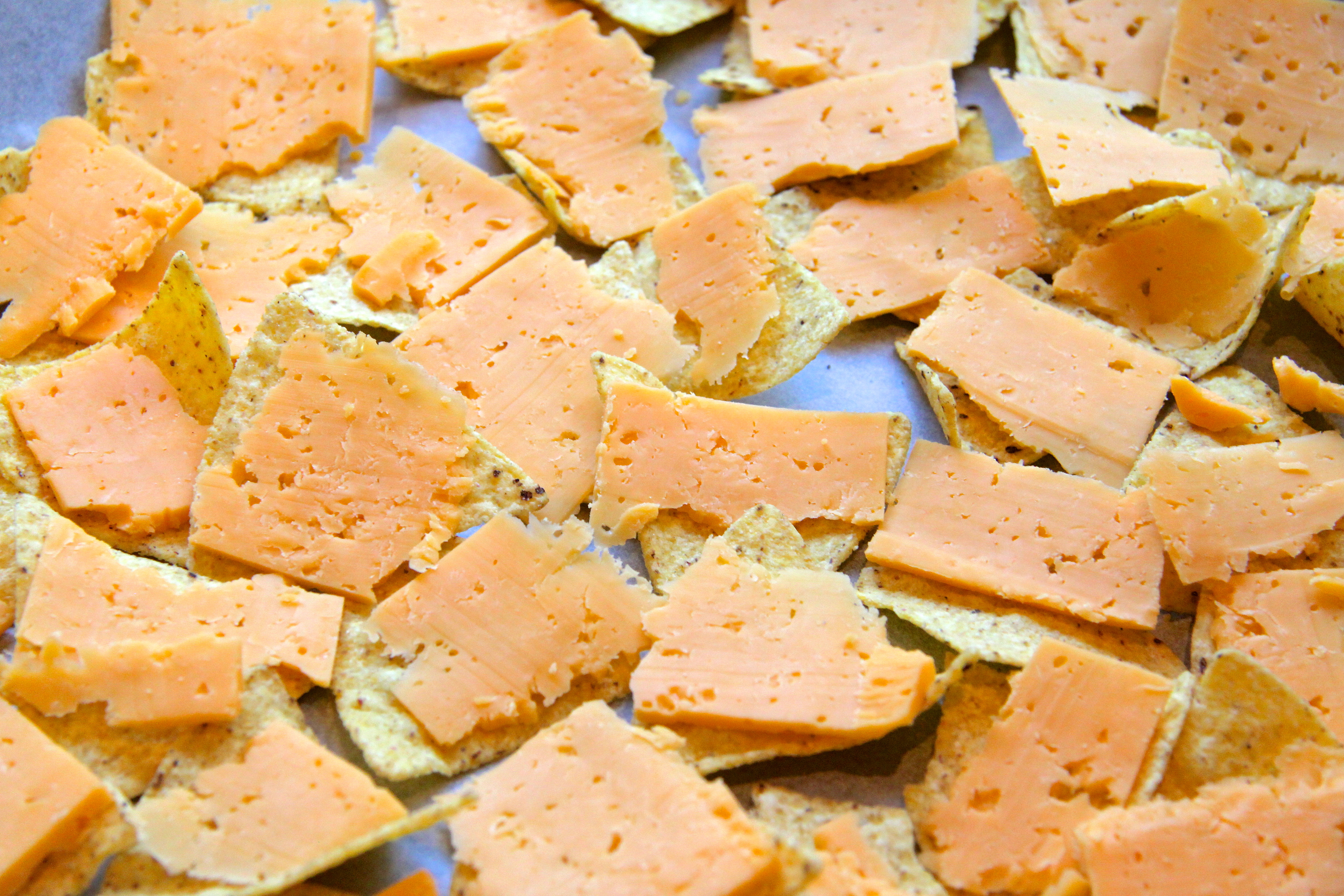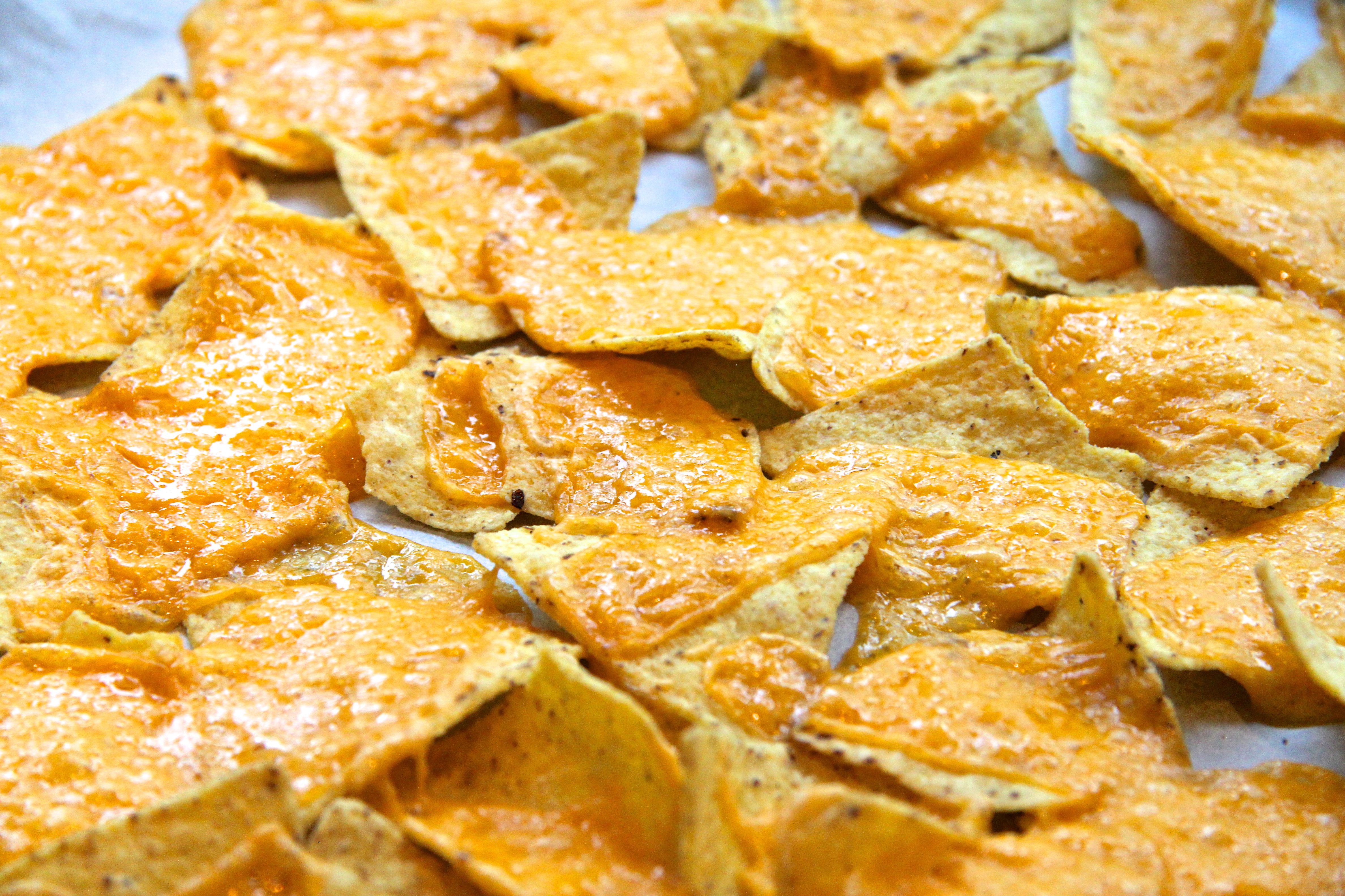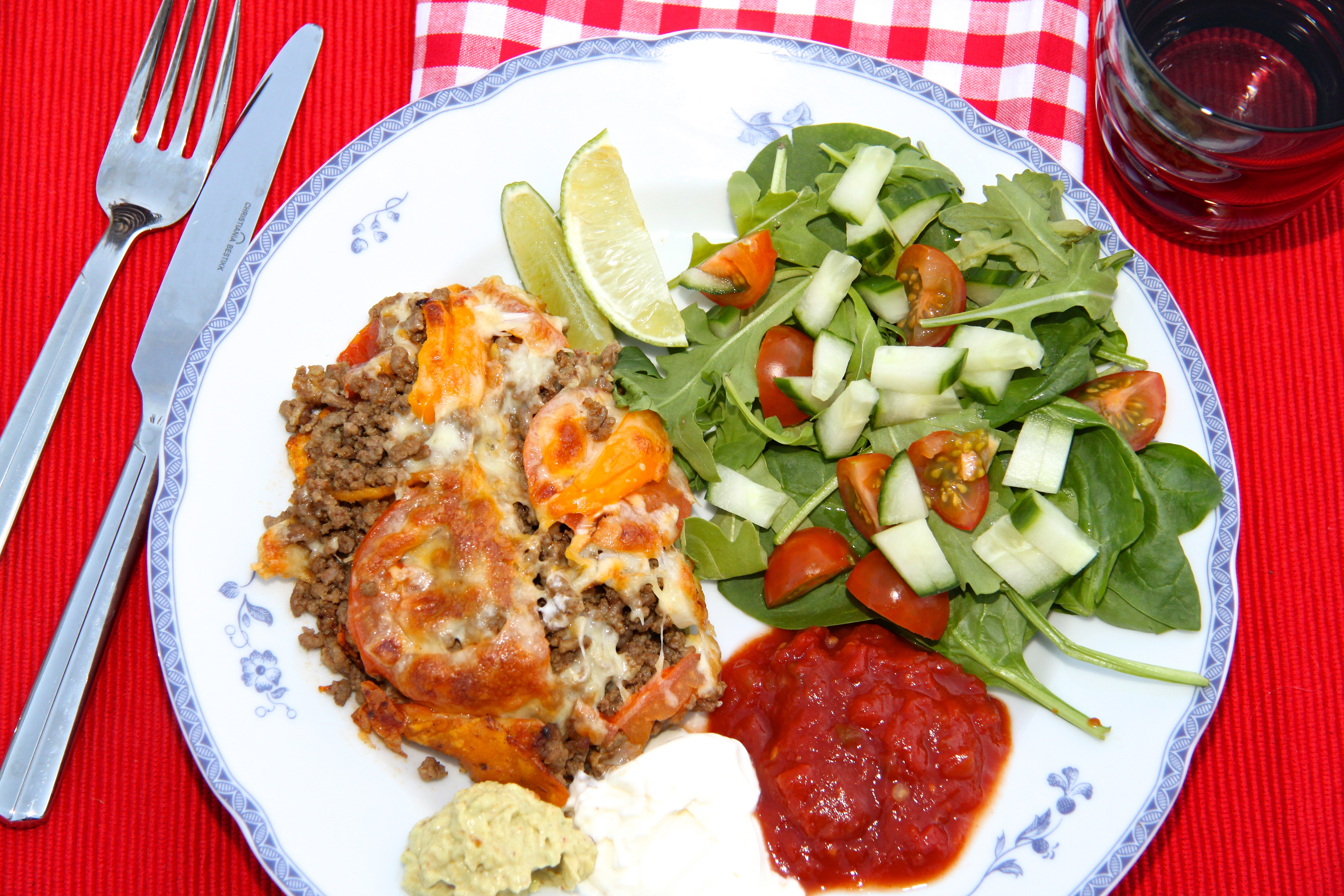 Bakarofn stilltur á 225 gráður. Flögunum dreift á botninn á ofnskúffu. Nautahakk steikt og tacokryddinu bætt út í. Því næst er vatni bætt við ásamt nautakrafti. Hakkið látið malla þar til vökvinn er soðinn niður. Þá er hakkinu dreift yfir flögurnar. Rjómaosti og sýrðum rjóma (báðum dósunum) hrært saman og dreift yfir hakkið. Því næst er grænmetinu dreift yfir og að lokum rifna ostinum. Bakað í ofni í ca. 12 mínútur. Ég stillti á grill síðustu mínúturnar til að osturinn tæki betri lit frekar er en að lengja bökunartímann því þá myndu tortilla flögurnar ekki haldast eins stökkar. Borið fram með salati, guacamole, sýrðum rjóma og salsasósu.
