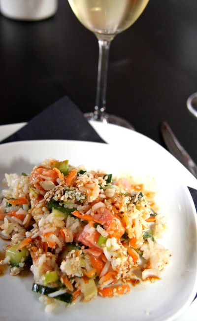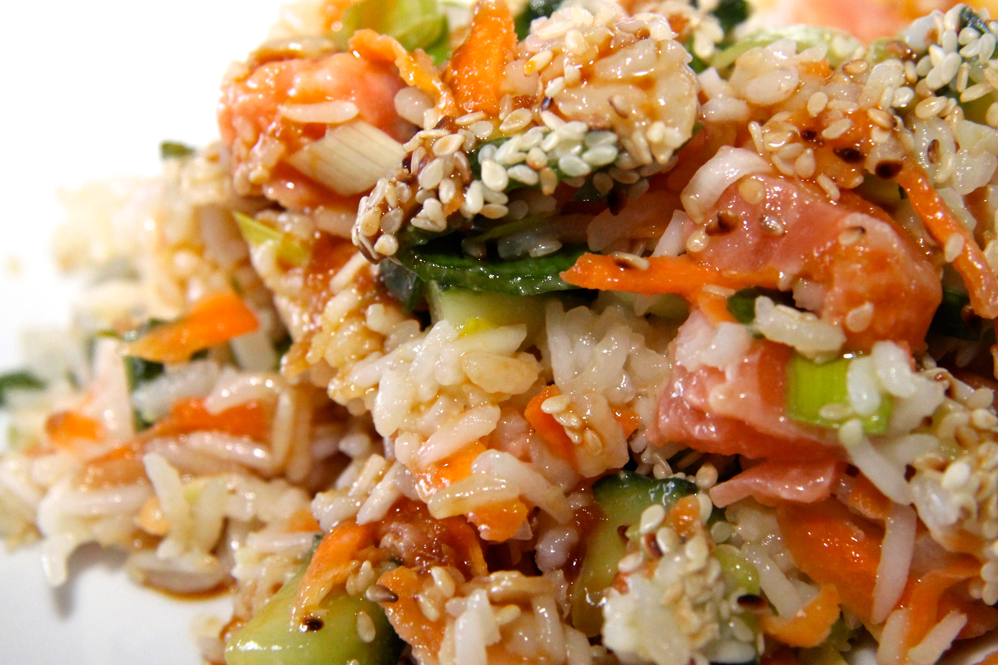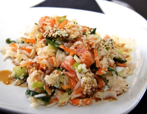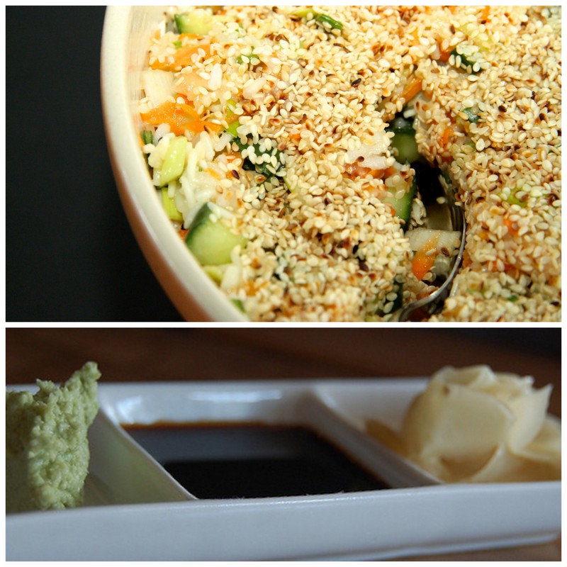 Lax, mangó og avókadó skorið í þunnar sneiðar og raðað fallega á disk. Sojasósunni og ristuðum sesamfræum dreift yfir. Skreytt með nokkrum þunnum chilisneiðum og kóríanderblöðum.