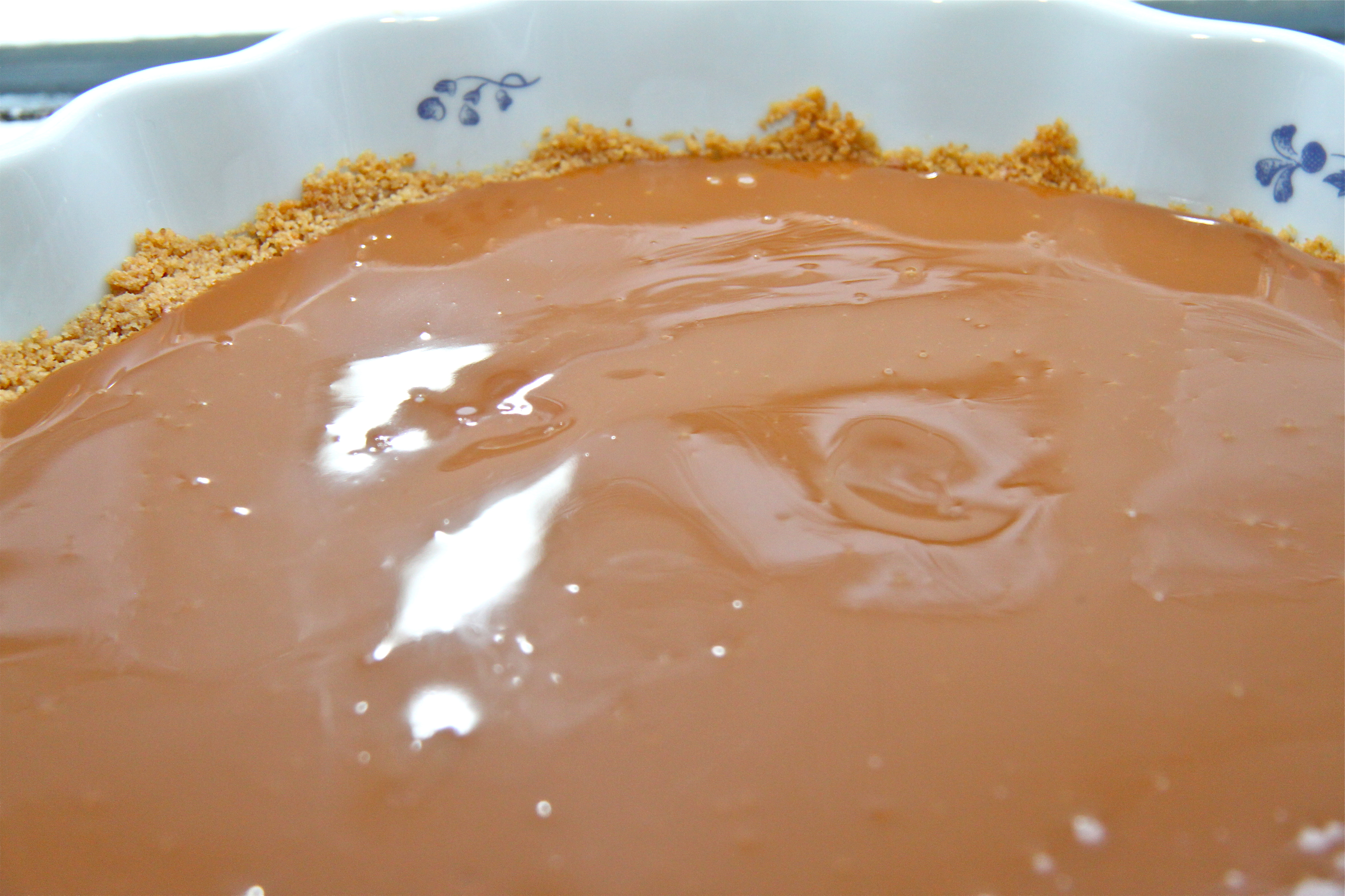 Aðferð: Bræðið smjörið og myljið kexið í matvinnsluvél eða mixer, blandið saman. Blöndunni þrýst í botninn á forminu. Kælið í 30 mínútur í ísskáp eða frysti og bakið svo í ofni við 175°C í 10 mínútur. Leyfið botninum að kólna áður en karamellusósan er sett á botninn. Þegar karamellusósunni hefur verið hellt yfir botninn er hindberjunum raðað yfir og að lokum þeyttum rjóma. Skreytt með súkkulaðispæni. Leyfið bökunni gjarnan að brjóta sig í ísskáp í nokkrar klukkustundir áður en hún er borin fram.