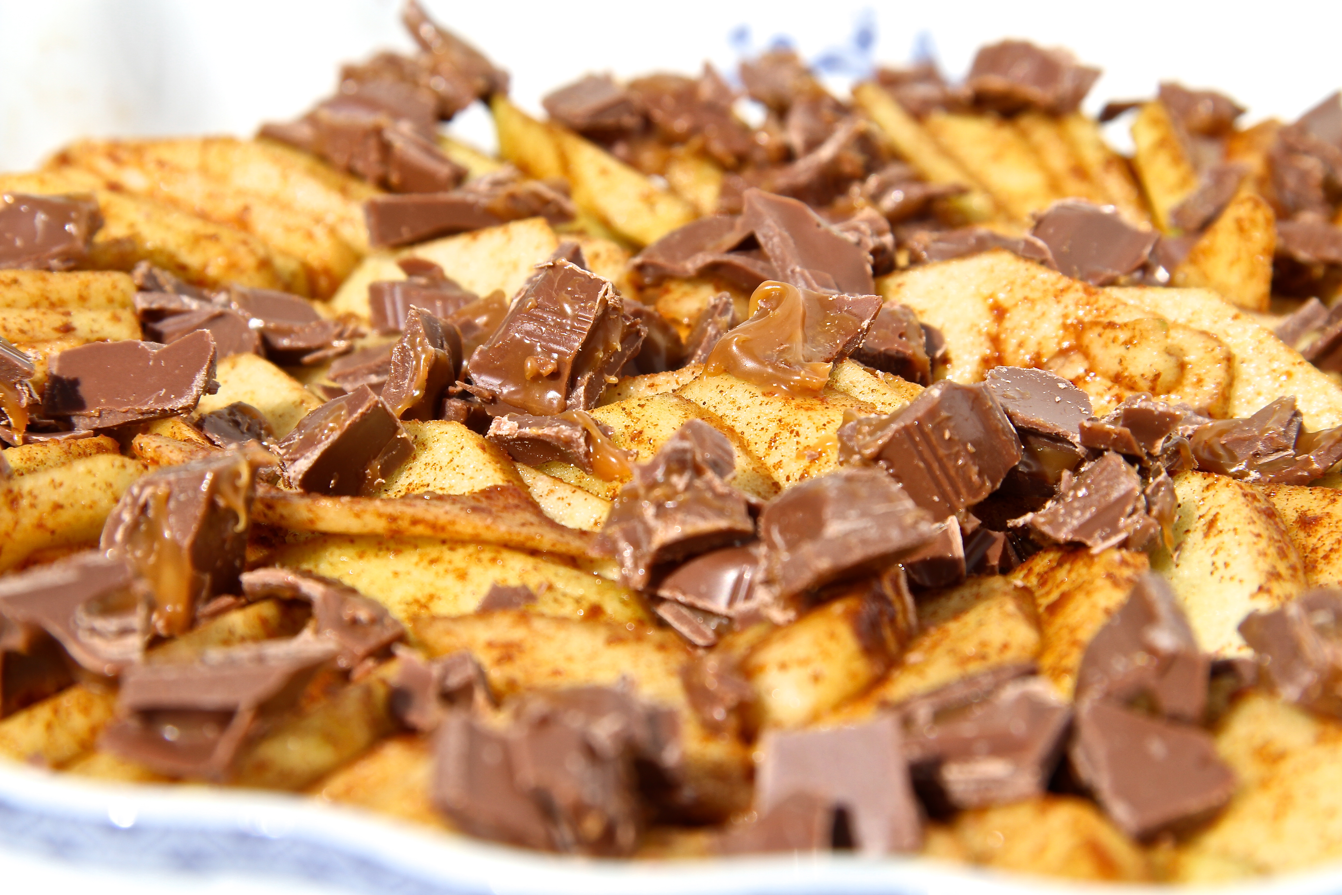 Ofn hitaður í 200 gráður við undir- og yfirhita. Bökuform (ca. 22-24 cm) smurt að innan. Eplunum er velt upp úr kanil og sykri (1 msk) og því næst raðað ofan í bökuformið. Pippsúkkulaðið er saxað smátt og dreift yfir eplin.