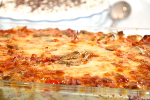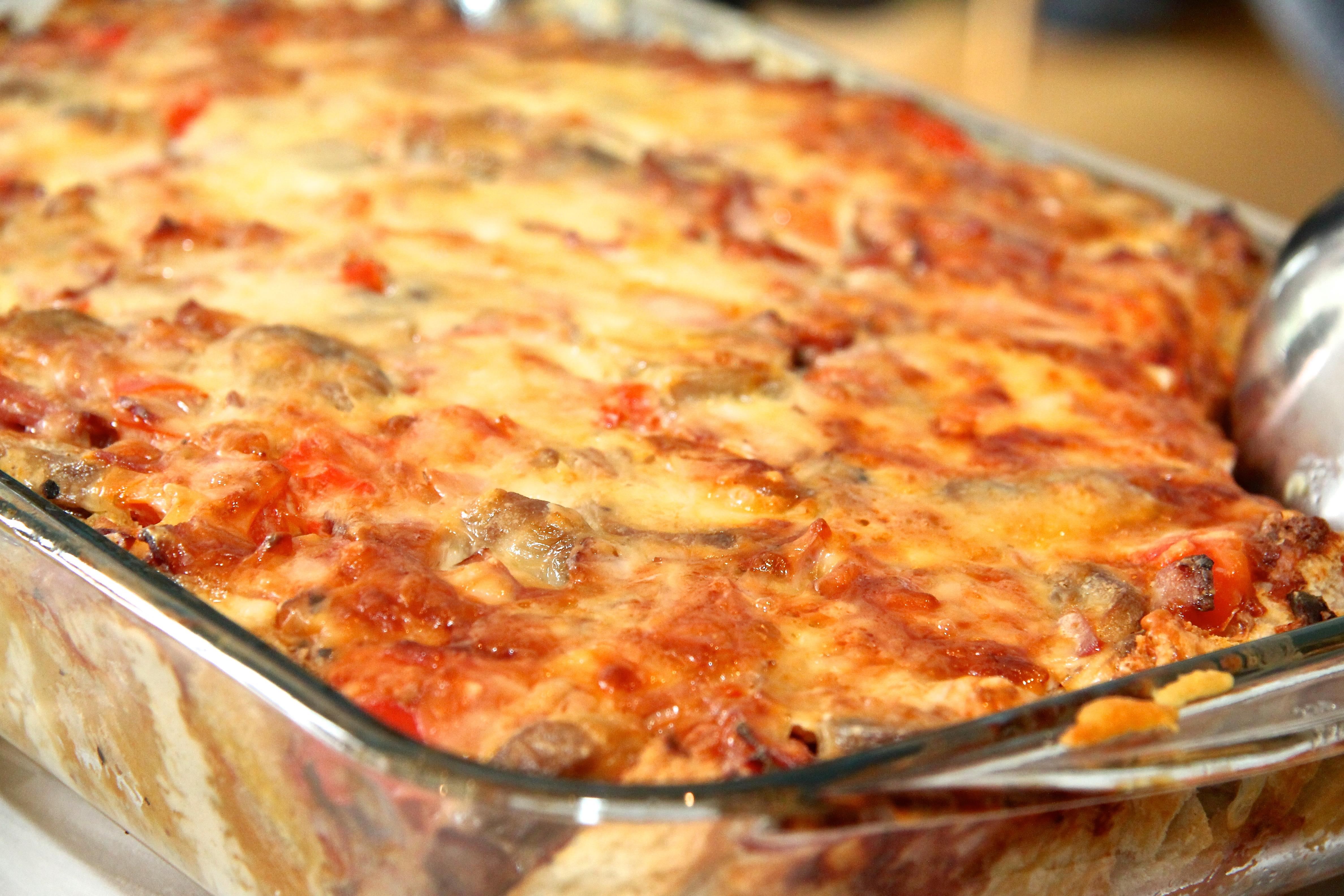 Brauðrétturinn sem ég gerði er ein af þeim uppskriftum sem var næstum því fallinn í gleymskunnar dá þótt að þetta sé „æðislegur brauðréttur“ eins og segir í titlinum. Mér finnst dálítið kjánalegt að láta einhvern rétt heita „æðislegur“ en ákvað bara að láta titilinn standa eins og hann stendur í gömlu uppskriftabókinni minni. Um daginn minnti Hildur vinkona mín mig á þennan brauðrétt og sagðist hafa fengið uppskriftina hjá mér. Hún fór að tala um að rétturinn hefði slegið í gegn hjá henni í saumaklúbbi. Ég mundi ómögulega eftir þessum brauðrétti og fletti í gegnum gömlu uppskriftabókina mína en ég hélt mig hafa fært allar uppskriftirnar hingað inn á bloggið. Svo var greinilega ekki því ég fann þessa uppskrift á snjáðri síðu í bókinni og það rifjaðist upp fyrir mér hversu vinsæll þessi brauðréttur hefur verið í veislum hjá mér í gegnum tíðina. Það er svo skemmtilegt við þennan rétt að það er ekki á honum rifinn ostur heldur þeyttar eggjahvítur með dálitlu majónesi og kryddum.