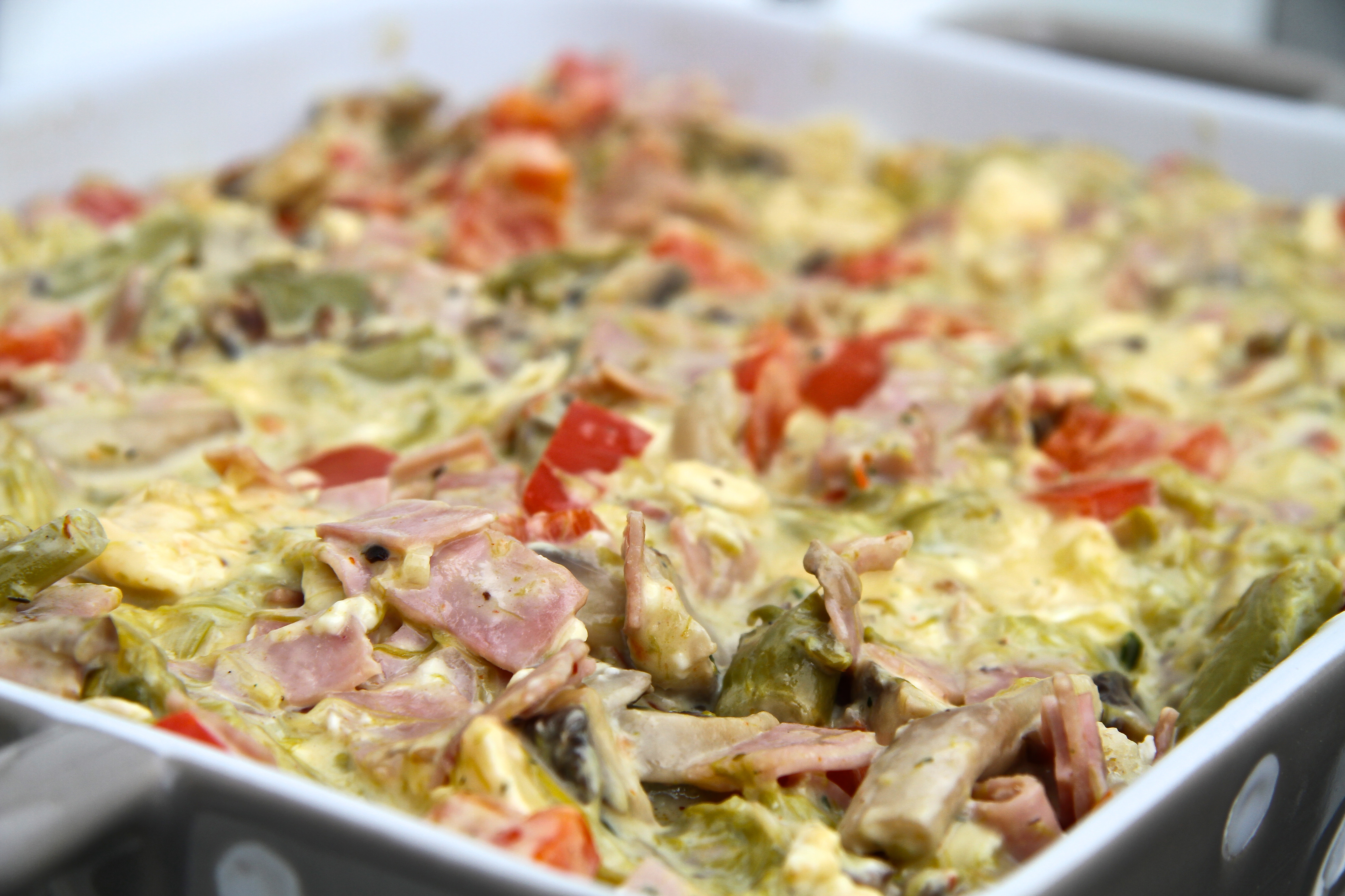 Majónesi, sýrðum rjóma, skinku, aspas, sveppum og hvítlauki er hrært saman.