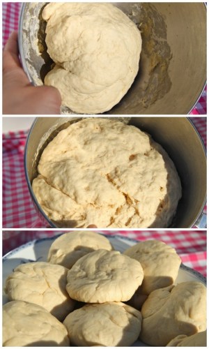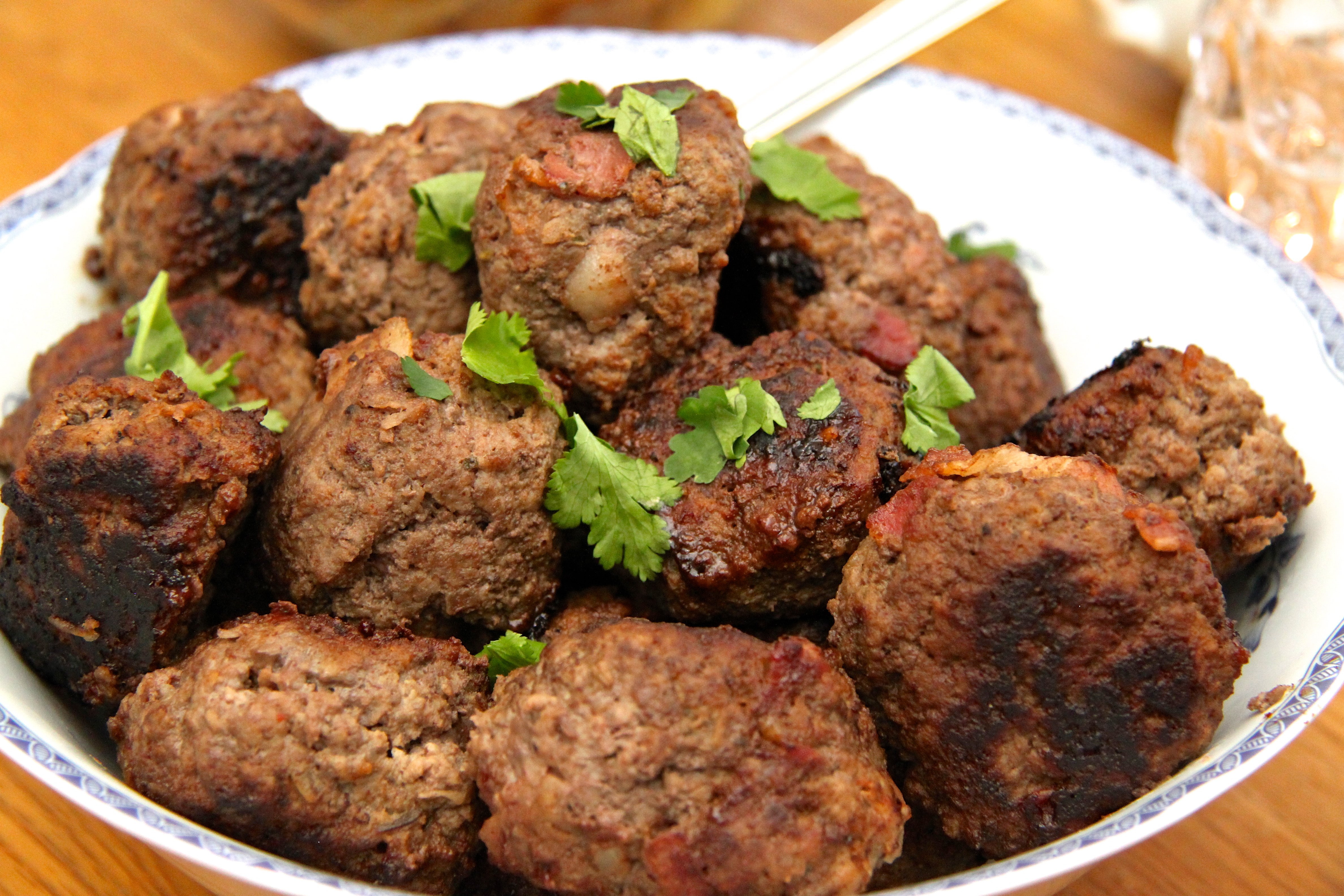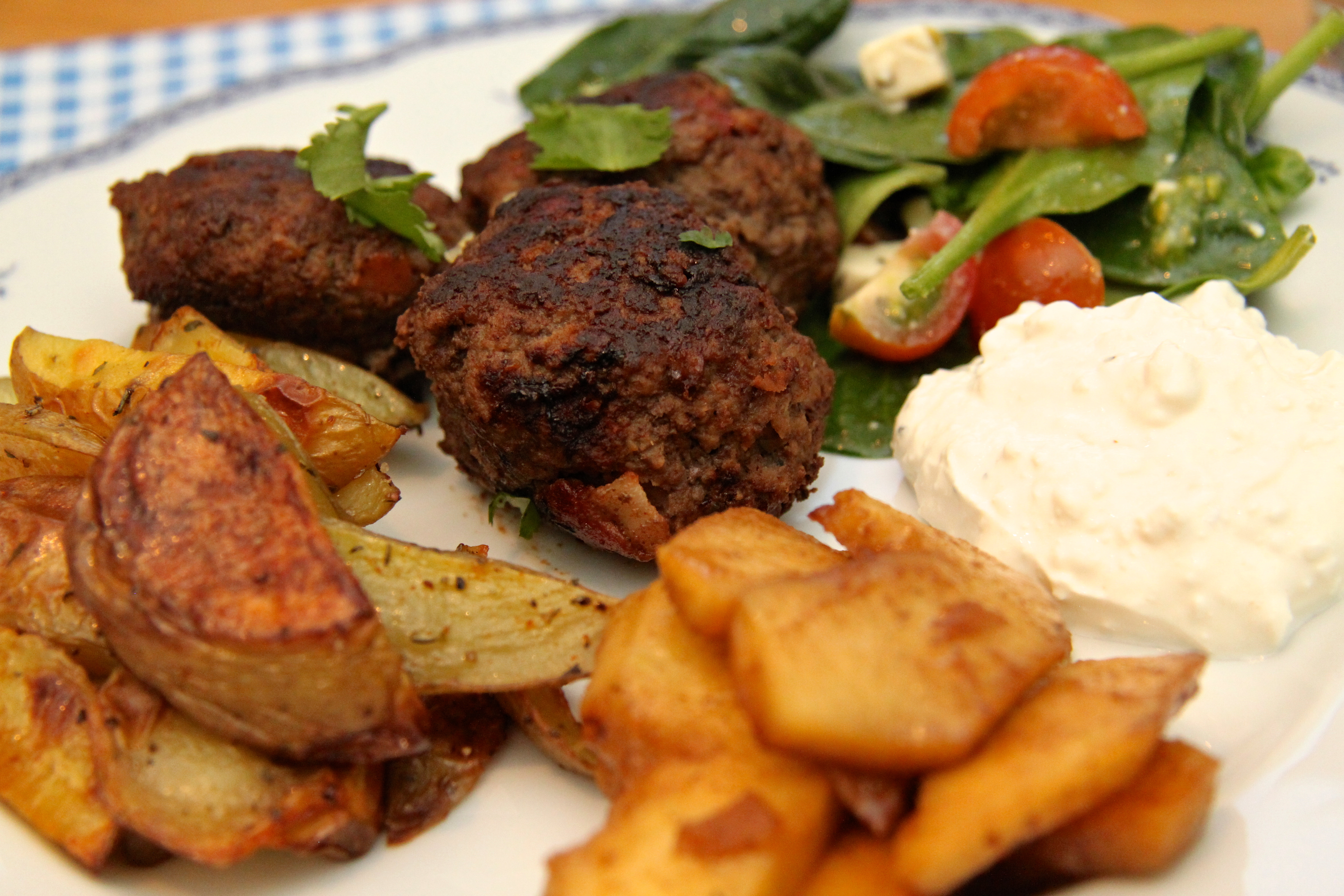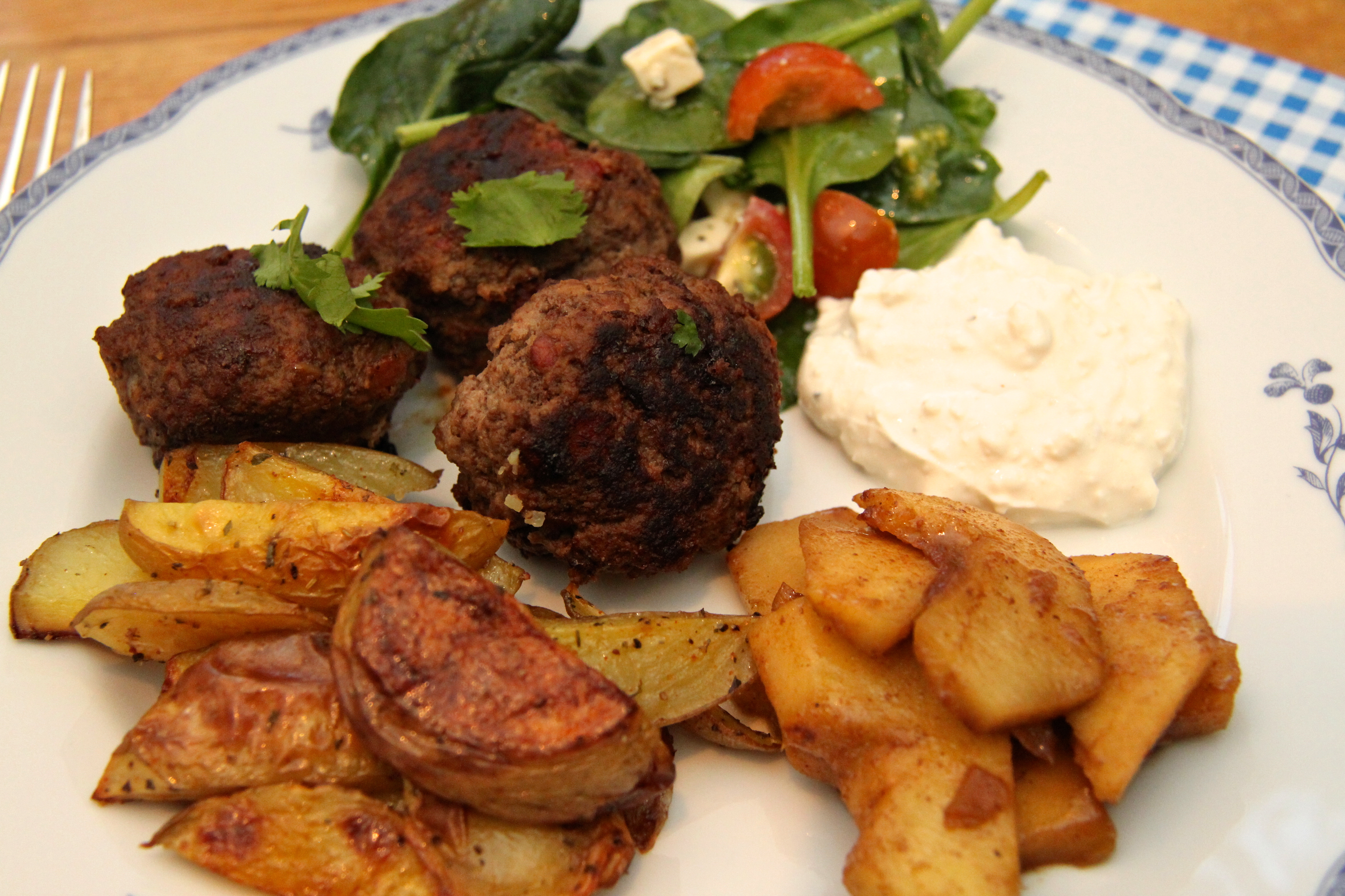 Beikonið er skorið í bita og steikt á pönnu þar til það er orðið stökkt, þá er það tekið af pönnunni og látið renna af því á eldhúspappír. 1 epli er afhýtt og rifið gróft. Laukurinn er saxaður mjög smátt. Rifna eplinu, beikoninu, lauknum, egginu og nautakraftinum er blandað vel saman við nautahakkið og kryddað vel. Því næst eru mótaðar bollur úr hakkinu og þær steiktar á pönnu þar til þær eru eldaðar í gegn. Bollurnar eru því næst veiddar af pönnunni (ekki þvo pönnuna) og þeim haldið heitum (t.d. undir álpappír). Restin af eplunum eru afhýdd og þau svo skorin í báta. Eplabátarnir eru svo steiktir á sömu pönnu og bollurnar voru steiktar á, við meðalhita í nokkrar mínútur, þar til þeir eru orðnir mjúkir. Kjötbollurnar eru bornar fram með steiktu eplabátunum, ofnbökuðum kartöflum, jógúrtsósu með fetaosti og fersku salati.
