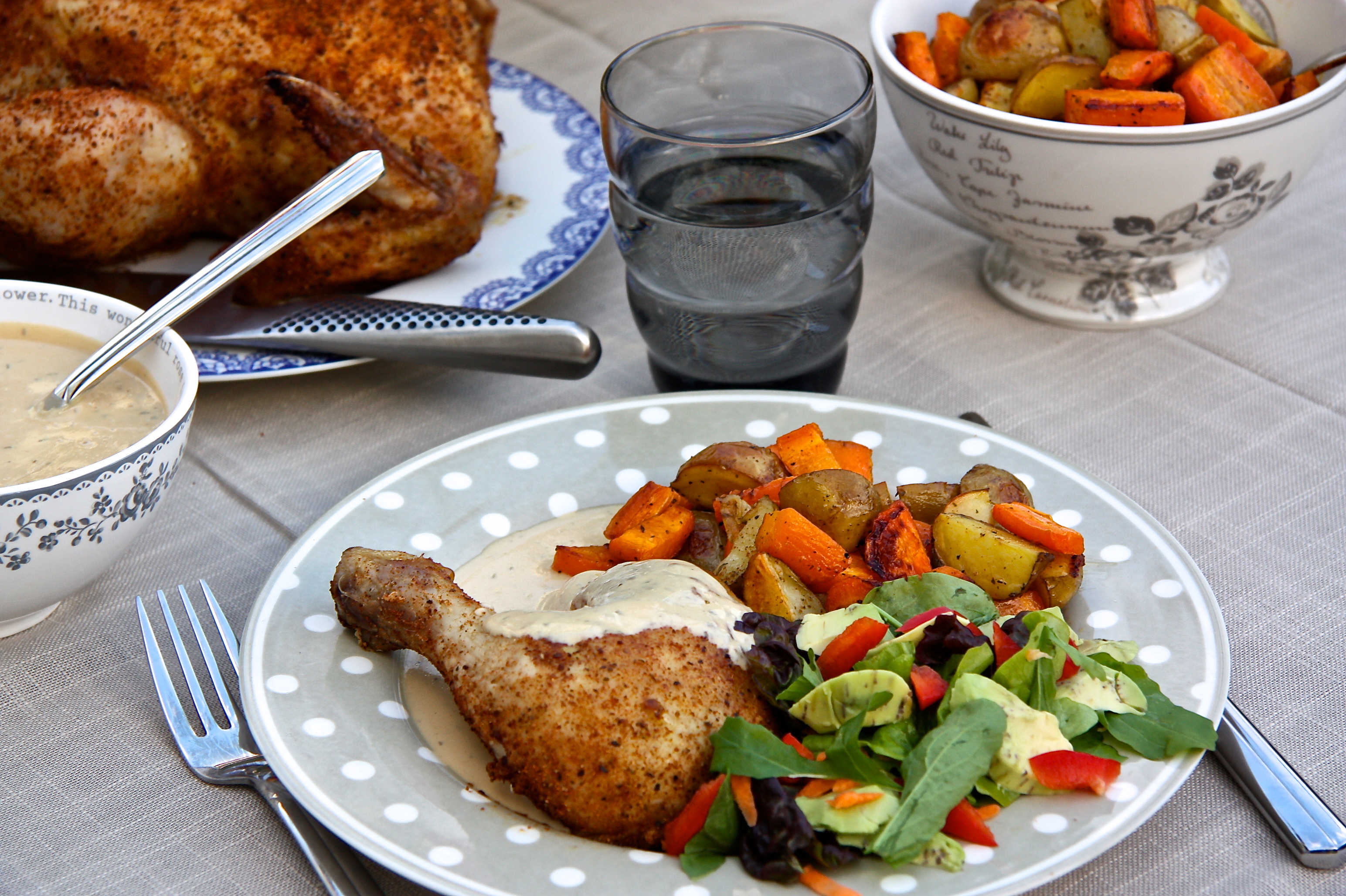 Um síðastliðna helgi var ég með heilan kjúkling í matinn og fór að hugleiða hvort ég gæti ekki hægeldað hann. Ég keypti heilan frosin kjúkling frá Rose (fékk hann í Fjarðarkaup – hef líka séð hann í Hagkaup), mér hann svo mjúkur og góður en ekki síst er frábært hversu stór hann er, 1600 gr, þá þarf ég ekki að elda tvo heila kjúklinga. Ég tók kjúklinginn úr frystinum á laugardegi og setti hann inn í ísskáp. Á sunnudeginum hægeldaði ég kjúklinginn og mikið óskaplega varð hann ljúffengur! Það var dálítið fyndið að fylgjast með viðbrögðum fjölskyldunnar sem settust öll við borðið á mismunandi tíma. Þau brugðust öll nákvæmlega eins við, „ummmm“ heyrðist í þeim eftir fyrsta bita og svo spurðu þau hissa, „hvernig kjúklingur er þetta?!“ Ég mæli því óhikað með þessari eldunaraðferð ef þið viljið fá dásamlega safaríkan kjúkling. Með honum hafði ég allskonar grænmeti, meðal annars fenniku sem mér finnst svo góð með sínum milda anískeimi en það er hægt að notað hvaða rótargrænmeti sem er í þessa uppskrift.