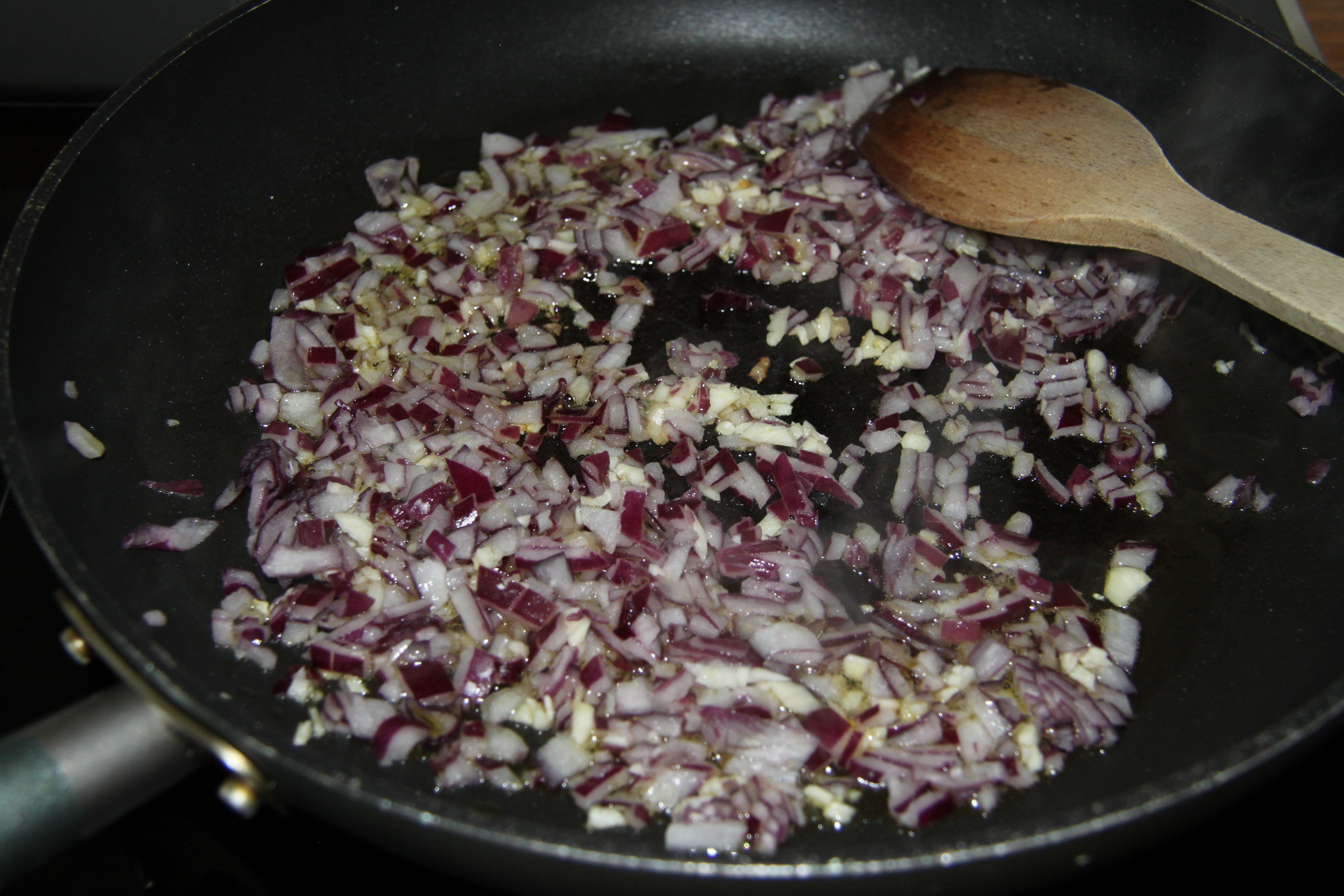 Rauðlaukur og hvítlaukur sneiddur smátt og steiktur á pönnu. Hvítlaukur þarf styttri steikingartíma en laukur. Það er því best að byrja á lauknum, bæta svo hvítlauknum út í, hafa háan hita og steikja í ca. hálfa mínútu. Eftir það brennur hvítlaukurinn auðveldlega. Ég tek svo laukinn og hvítlaukinn af pönnunni á meðan ég steiki grænmetið og kjúklinginn til þess að brenna ekki laukinn.