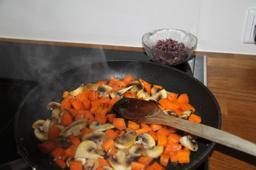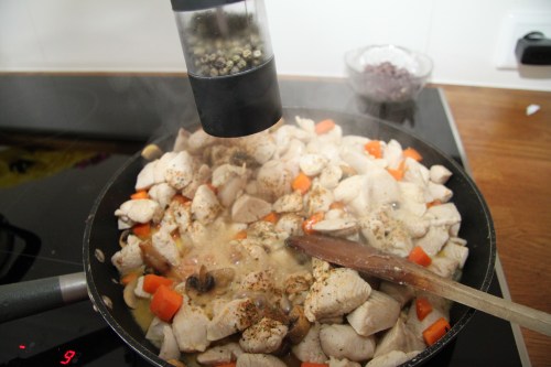 Því næst steiki ég niðursneidda sveppi og gulrætur (líka gott að nota rauða papriku) og bæti svo kjúklingi út í.