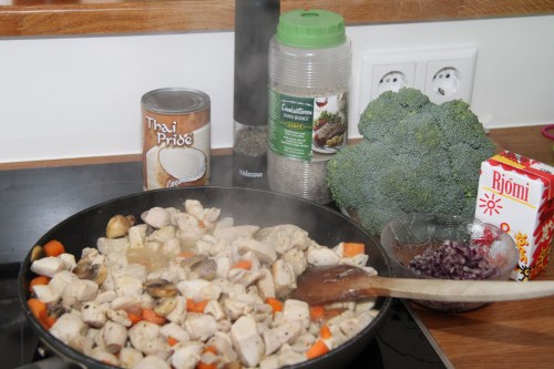 Þessi kjúklingaréttur er klassískur og til í mismunandi útgáfum. Ég geri yfirleitt eftirfarandi útgáfu en nota það grænmeti sem ég á hverju sinni. Það er líka hægt að nota t.d. papriku, púrrlauk og aðrar grænmetistegundir.