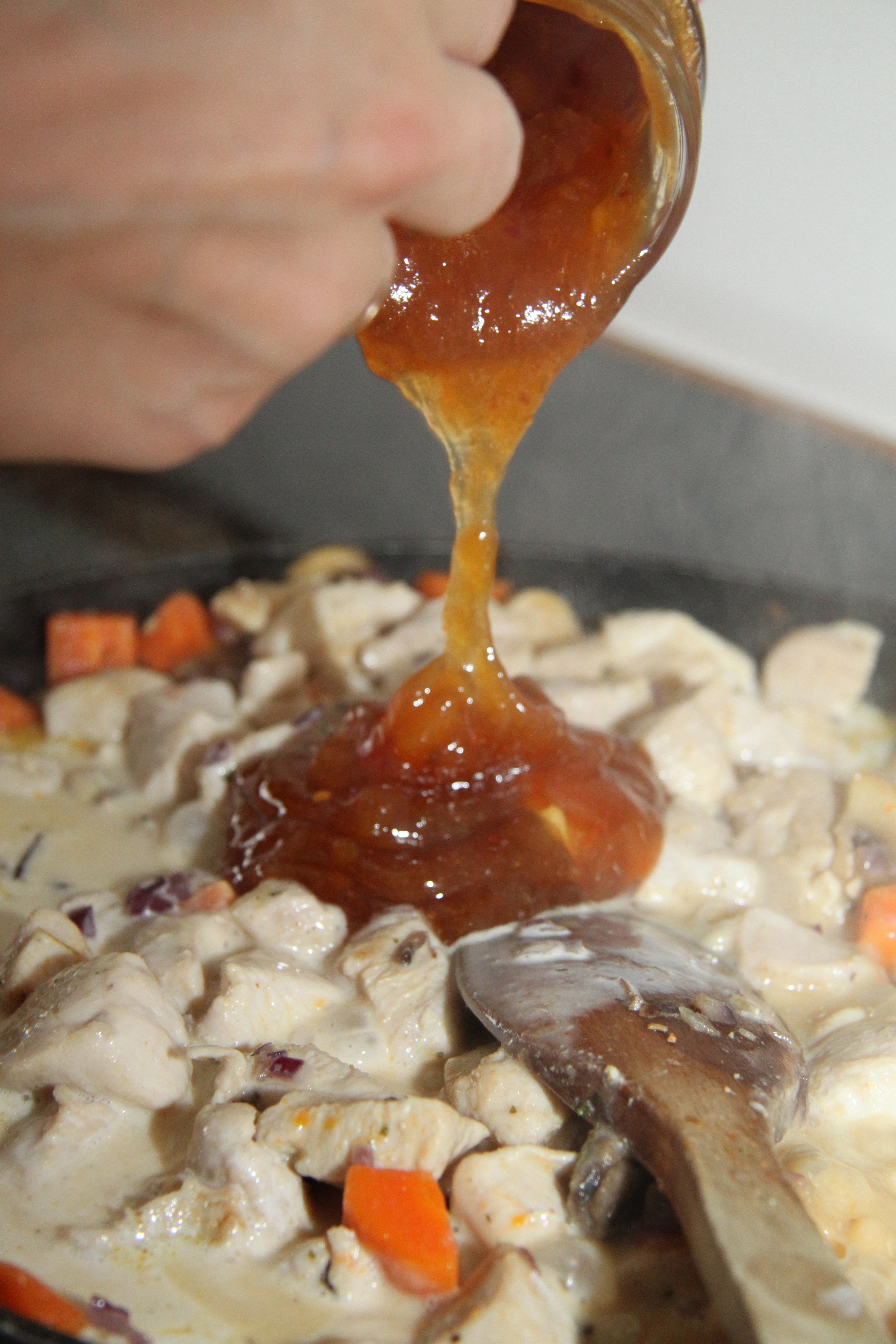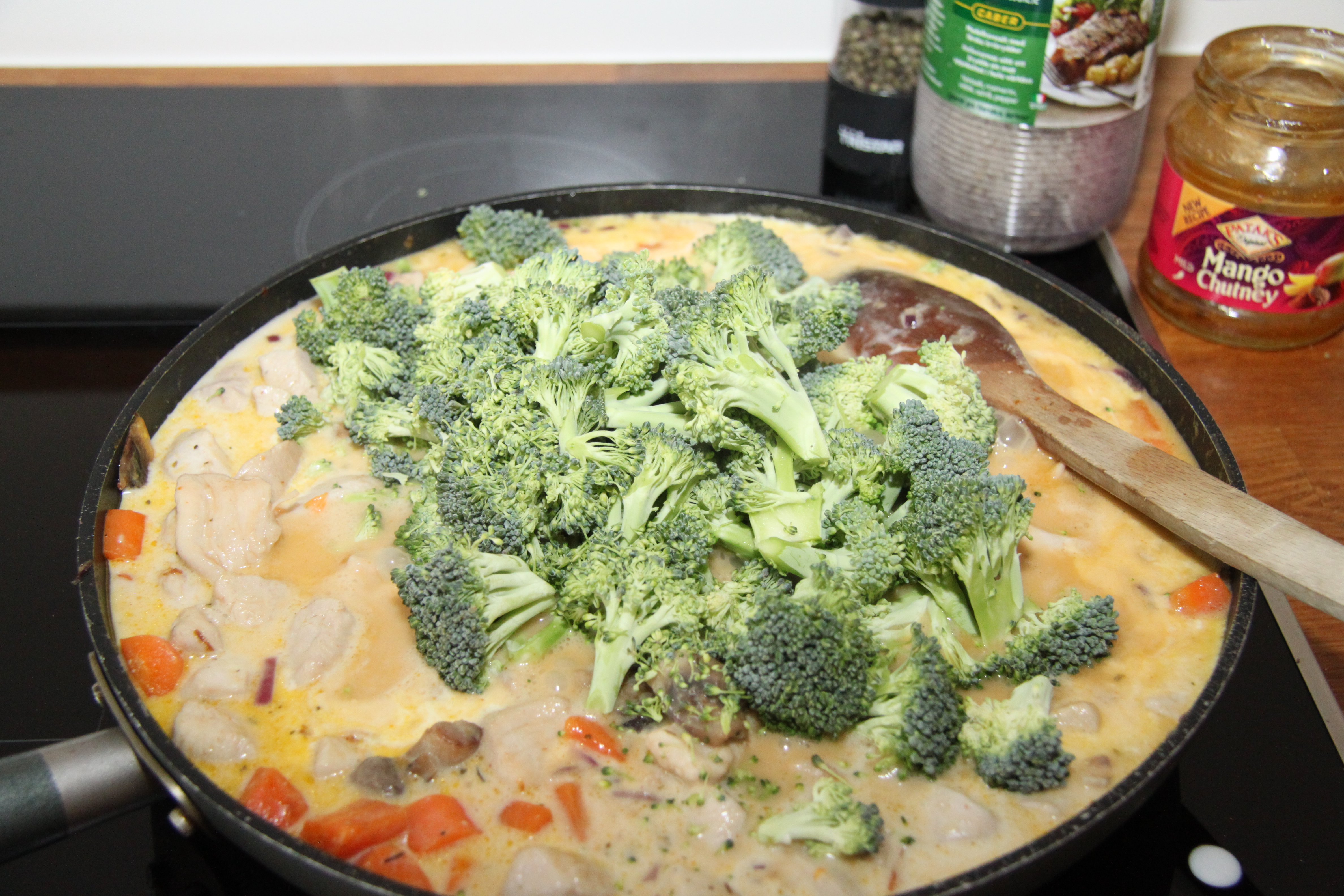 Nú bæti ég lauknum aftur út í, 1 dós kókosmjólk, 1 pela rjóma (eða matreiðslurjóma) ásamt Mango Chutney.