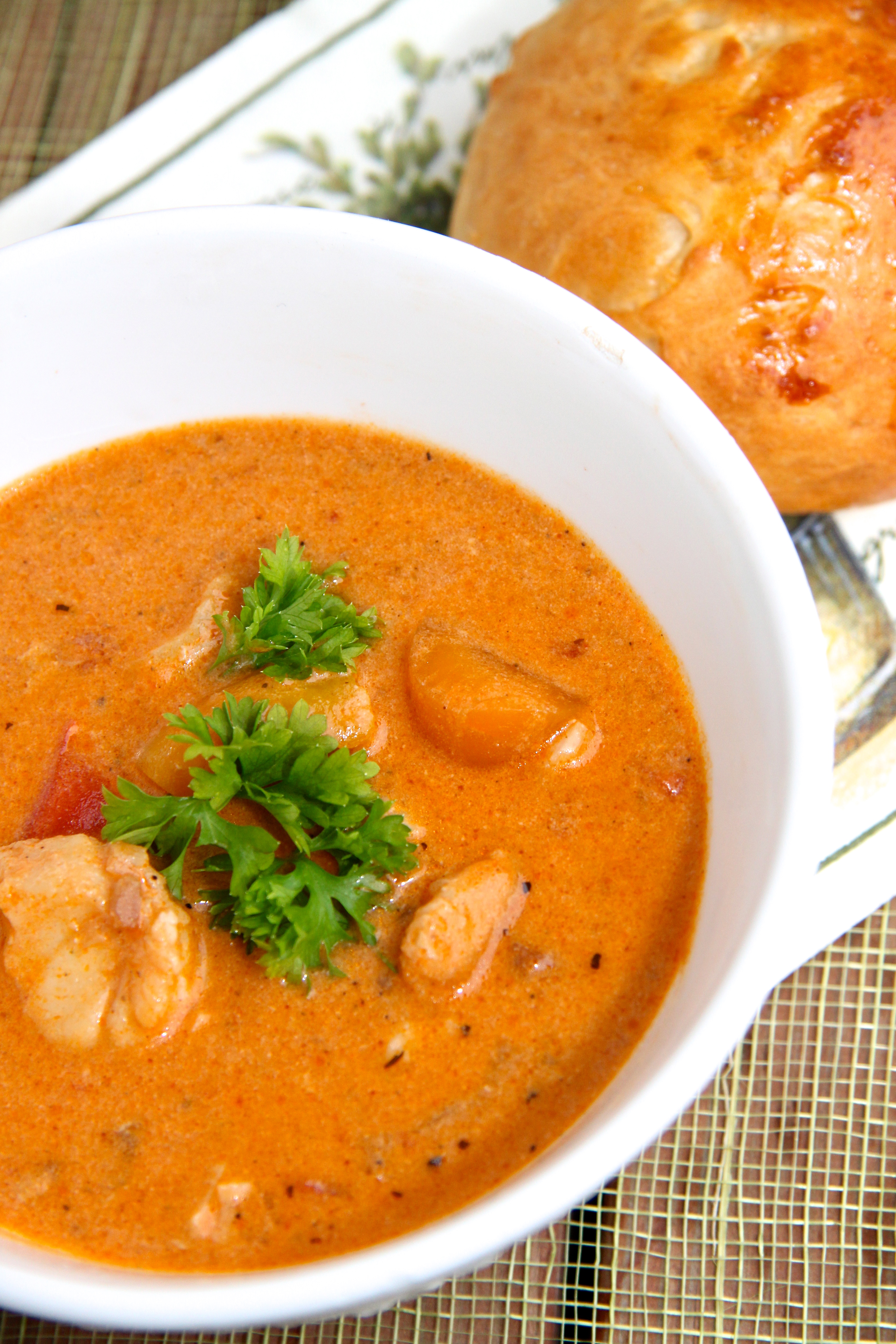 Ein matskeið olíu hituð í potti og hvítlaukurinn steiktur í skamma stund. Áður en hann byrjar að brenna er hann tekinn upp úr og settur til hliðar. Tveimur matskeiðum af olíu bætt við í sama pott og gulrætur, laukur og paprika brúnuð. Því næst er tómatpúrru, niðursoðnu tómötum, vatni, fiskikrafti, kjúklingakrafti, tandoori masala, karríi ásamt hvítlauknum bætt út í. Strax á eftir eru sólþurrkuðu tómatarnir sneiddir niður og þeim ásamt mango chutney, sætu chilisósunni og rjómanum bætt út í. Smakkað til með salti, pipar og meira kryddi ef með þar, látið malla í um það bil fimmtán mínútur (því lengur því betra). Þá er þorsknum og löngunni bætt út í og leyft að malla í súpunni í nokkrar mínútur. Rétt áður en súpan er borin fram er rækjum bætt út í. Fallegt að skreyta með steinselju. Súpan er borin fram með góðu brauði.