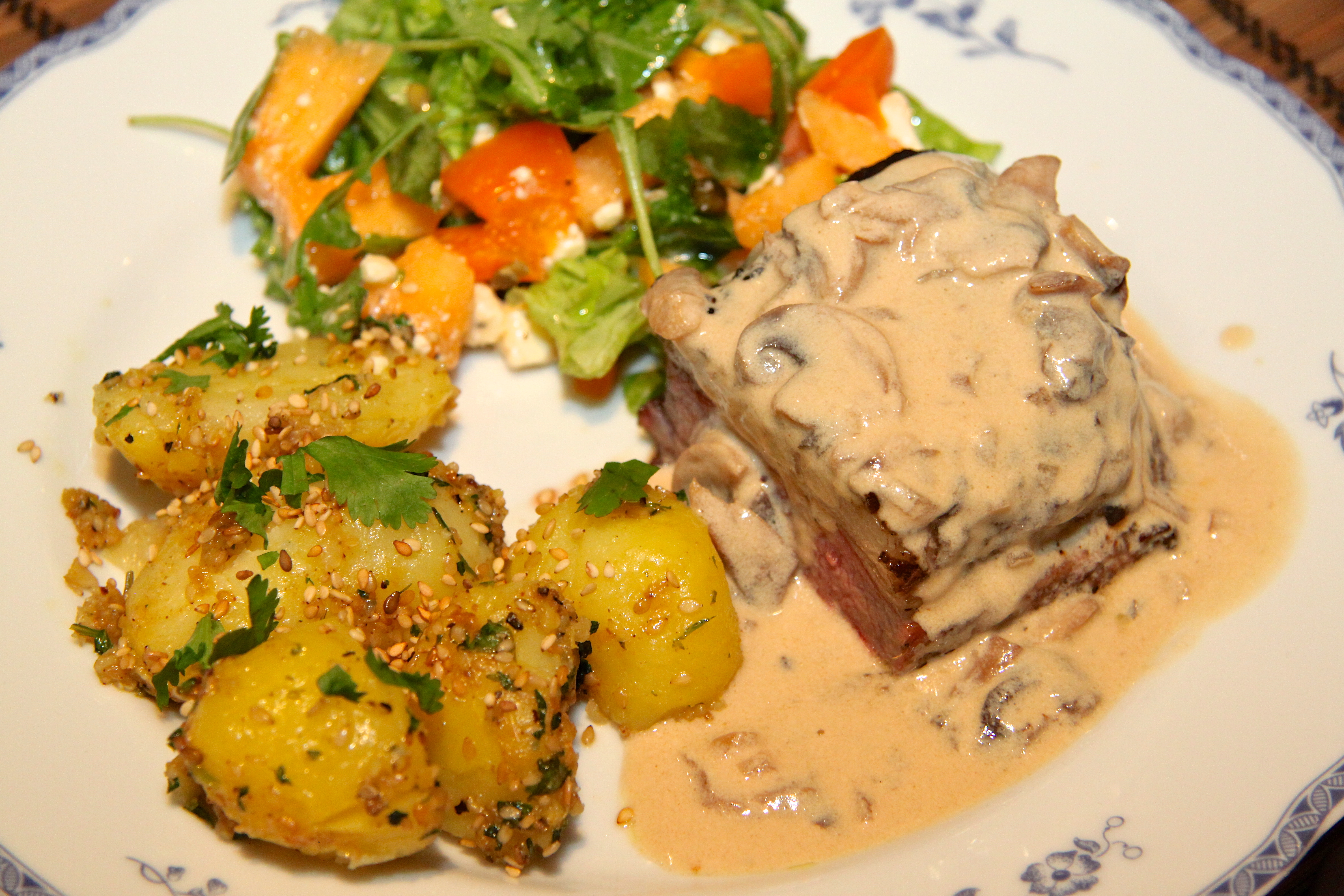 Hluti af gestunum er á LKL mataræði, eða lágkolvetnis lífsstíl. Mér fannst spennandi að finna matrétti sem pössuðu inn þetta mataræði. Í aðalrétt var ég með grillaða sirloin nautasteik, beint af býli, dásamlega gott og meyrt. Meðlætið var bearnaise sósa, sveppasósa, falskt kartöflusalat (með kúrbít), ferskt salat, ofnbakað eggaldin með tómötum og osti auk kartaflna fyrir ekki LKL-ista! Í eftirrétt var súkkulaðifrauð sem passar fyrir LKL. Snakkið var grænmeti og ídýfa, saltaðar Macadamia hnetur en þær hafa lágt kolvetnisinnihald (fást í Kosti), heimatilbúið snakk úr parmesan osti og fleira. Uppskriftirnar af öllum framantöldu munu koma inn á síðuna næstu daga. Ég ætla að byrja á ofnbökuðu eggaldin með tómötum og osti. Frábærlega einfalt og gott meðlæti sem hentar fyrir alla, hvort sem þeir eru á LKL eða ekki! 🙂 Minnir dálítið á þetta meðlæti sem er dásamlega gott líka.