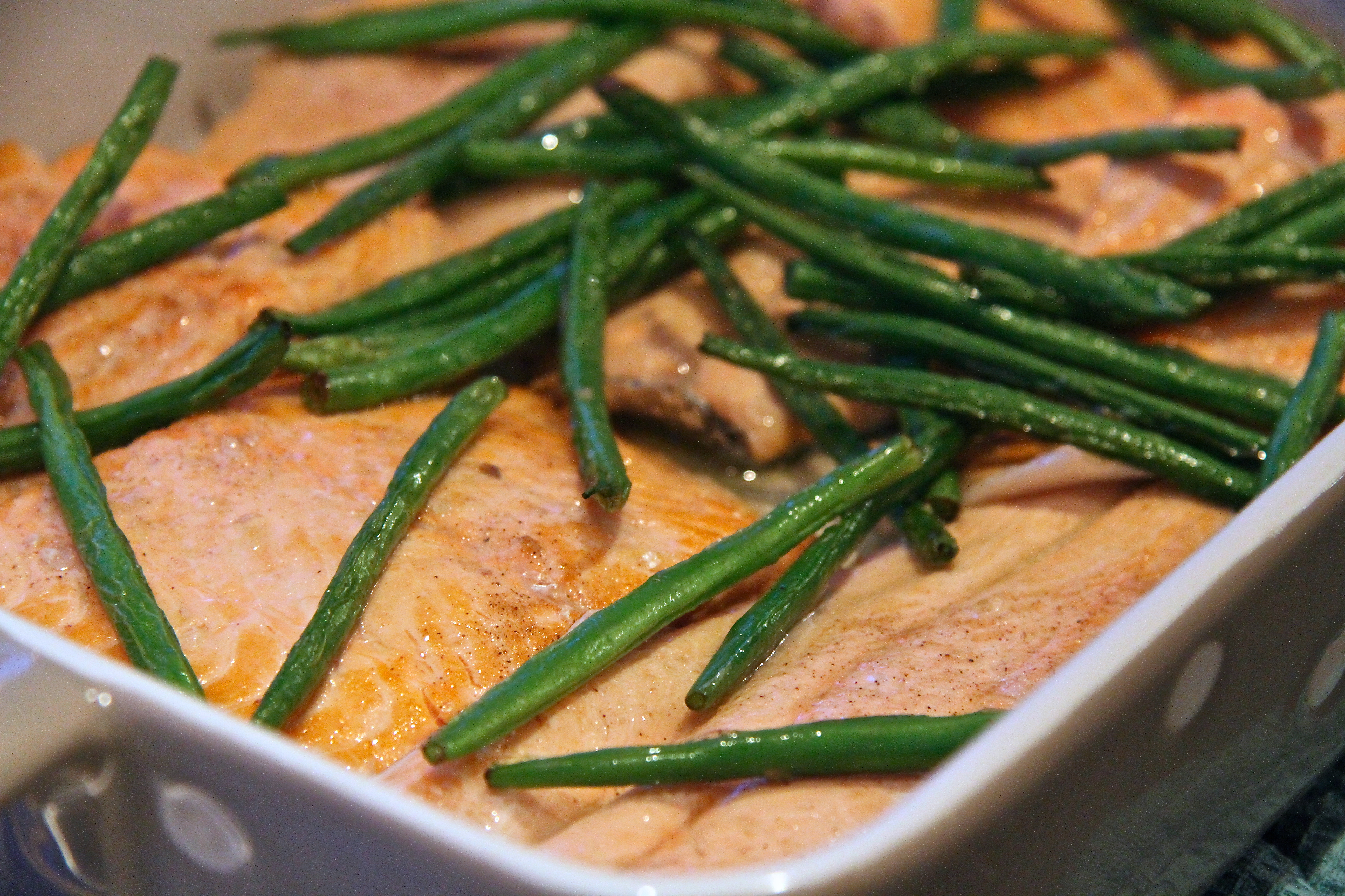 Ofn hitaður í 200 gráður við undir og yfirhita. 8 dl af vatni sett í pott ásamt smá salti og hitað að suðu. Þegar vatnið er byrjað að sjóða er potturinn tekinn af hellunni og kúskús sett út í. Lokið sett á pottinn og hann lagður til hliðar. Laxinn er skolaður og skorinn í hæfilega stóra bita. Olía er hituð á pönnu, laxinn saltaður og pipraður og því næst steiktur í um það bil 2 mínútur á hvorri hlið. Laxinn er lagður í eldfast mót. Strengjabaunirnar eru steiktar í heilu lagi í 1-2 mínútur á pönnunni og settar í mótið með laxinum. Bakað í ofni í 10-12 mínútur.
