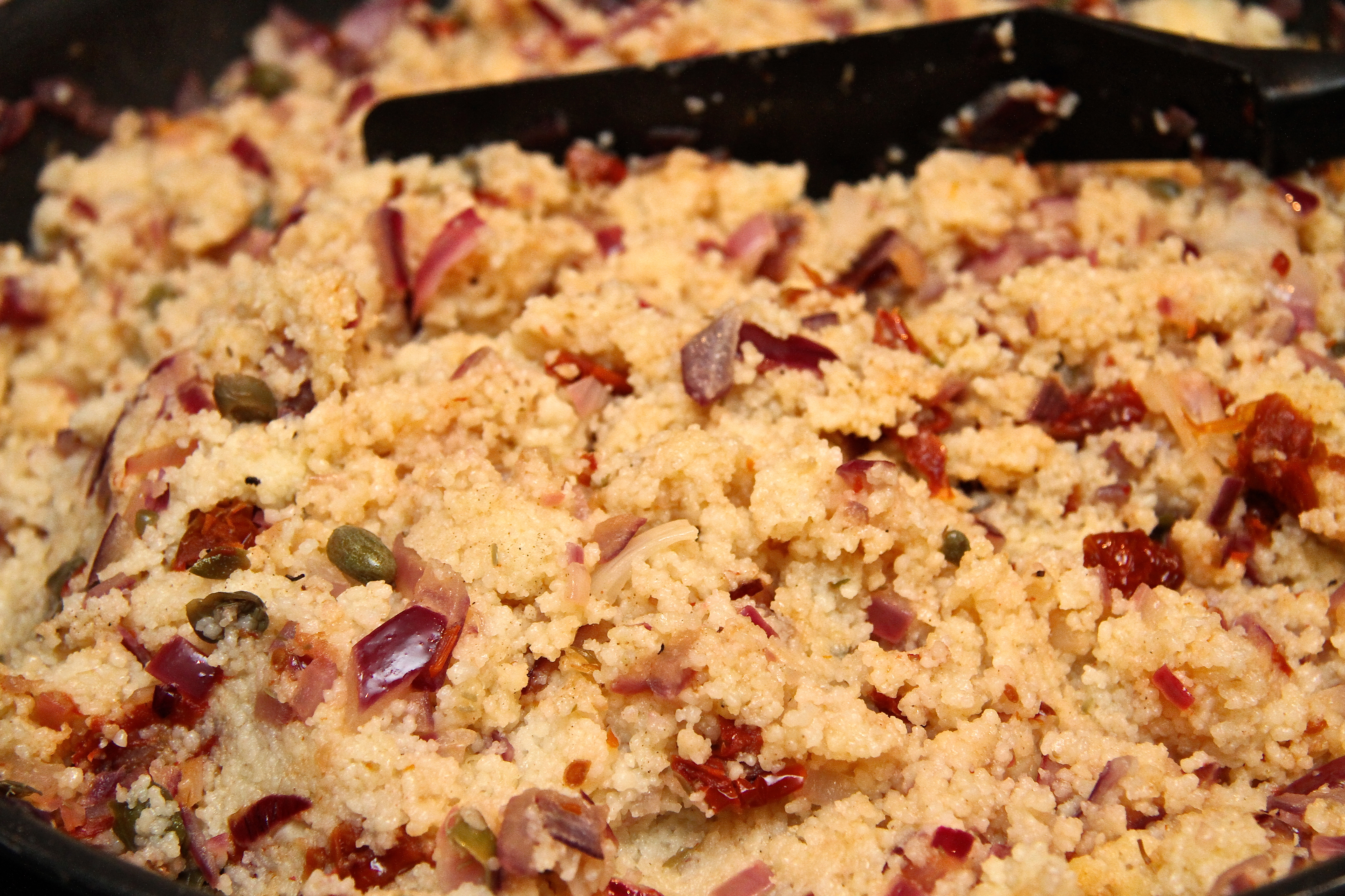 Á meðan er rauðlaukurinn afhýddur og skorinn smátt ásamt kapers og sólþurrkuðum tómötum og þetta er allt steikt saman á pönnu upp úr 2-3 msk af olíu. Þá er kúskúsinu bætt á pönnuna ásamt 2 msk af smjöri og steikt í 2-3 mínútur til viðbótar.