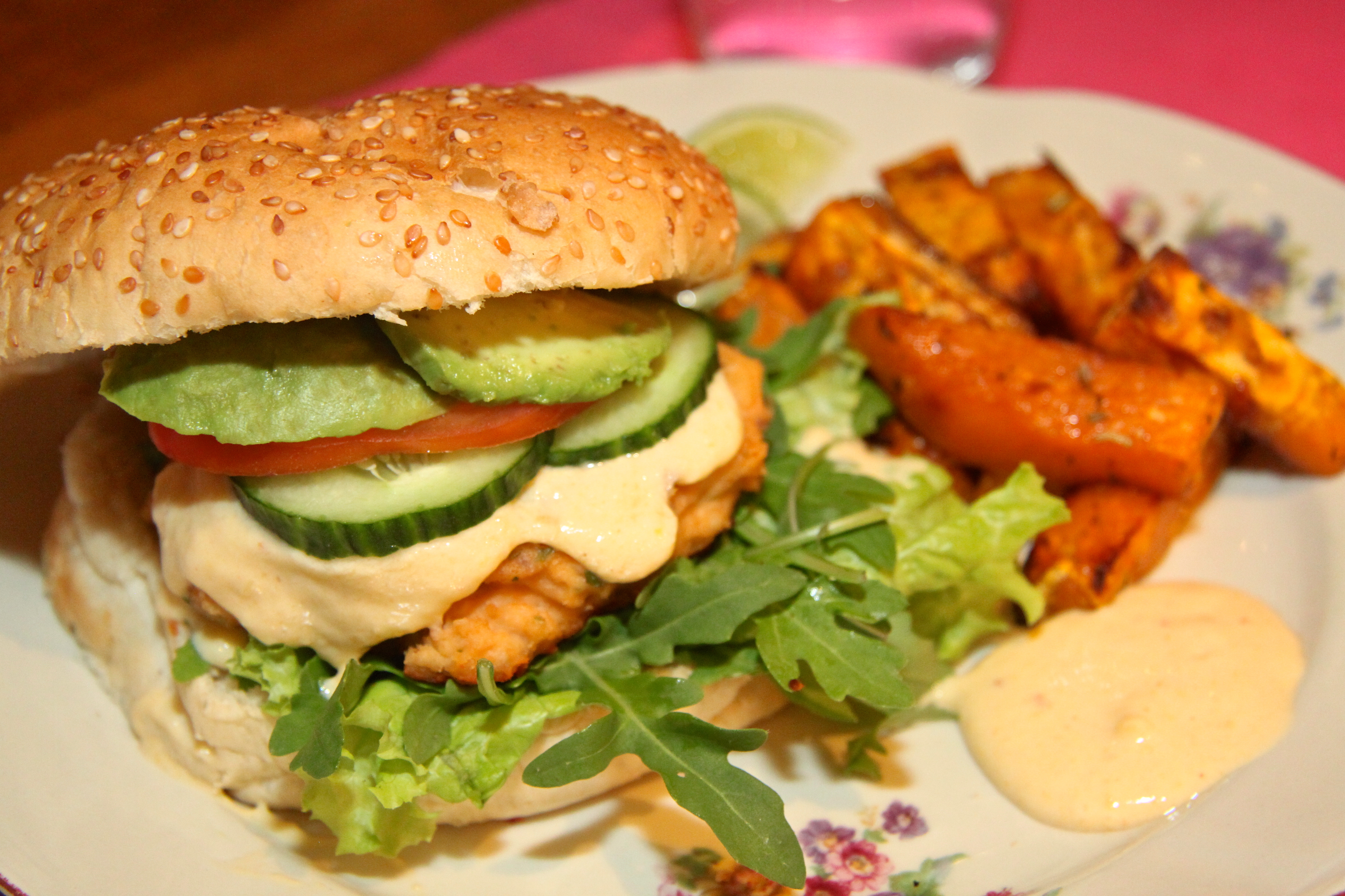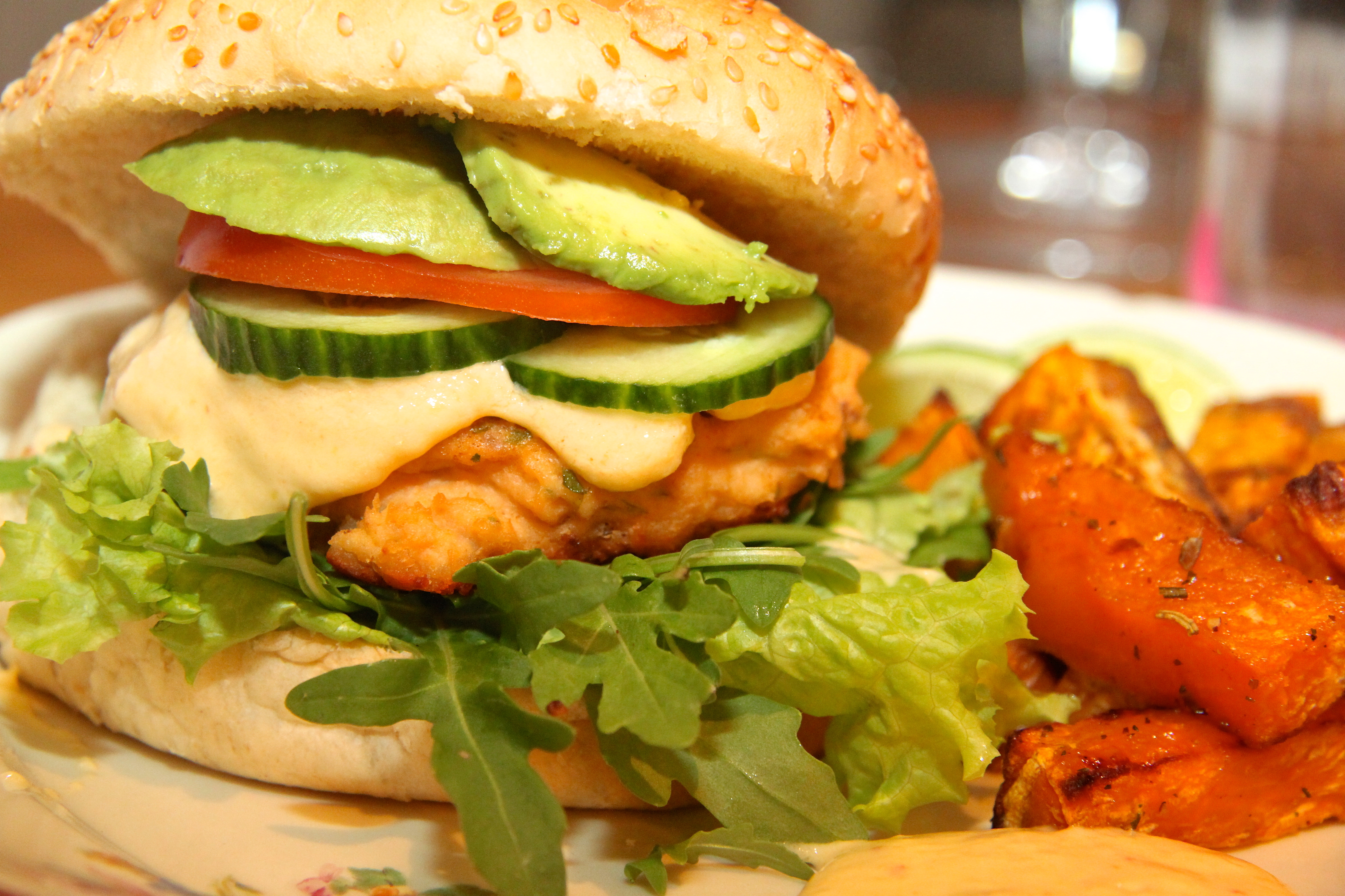 Fyrir löngu síðan fór ég með nokkrum frábærum stelpum úr líkamsræktarhópnum mínum í kraftgöngu vestur á Seltjarnarnes sem endaði svo með notalegri máltíð á Nauthól. Þá voru þeir með á matseðlinum gómsæta laxaborgara með ,,sætkartöflufrönskum“! Þetta var svo ljúffengur matur að ég hef oft hugsað um að endurgera réttinn heima og lét loksins verða af því í kvöld. Namm namm … þetta var svo gott! Meira að segja krakkarnir elskuðu þennan rétt. Það er mjög fljótgert að búa til borgarana, ég setti bara allt hráefnið í matvinnsluvél. En ef maður vill grófari borgara er hægt að mauka hráefnið saman með gaffli. Ég las mér til í sænskri uppskriftabók að það væri mikið betra að sjóða laxinn örstutt áður en búnir eru til borgarar úr þeim, þannig héldust þeir safaríkari. Ég gerði það og borgararnir voru afar safaríkir en ég hef svo sem ekkert viðmið. Ég bar laxaborgarana fram í hamborgarabrauði en þess þarf ekkert endilega. Það er líka gott að bera þá fram með grænmeti, sósu og sætkartöflufrönskum og þá er hægt að kalla þetta laxabuff! Sósan var rosalega góð, ég notaði blöndu af frosnu og fersku mangói en það er hægt að nota bara annað hvort. Þessa sósu er örugglega gott að nota líka með til dæmis grilluðum kjúklingi. En laxaborgararnir og meðlæti er ofsalega ferskur og bragðgóður réttur, mæli með honum!