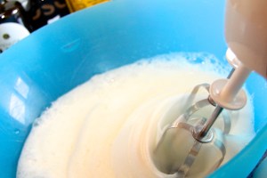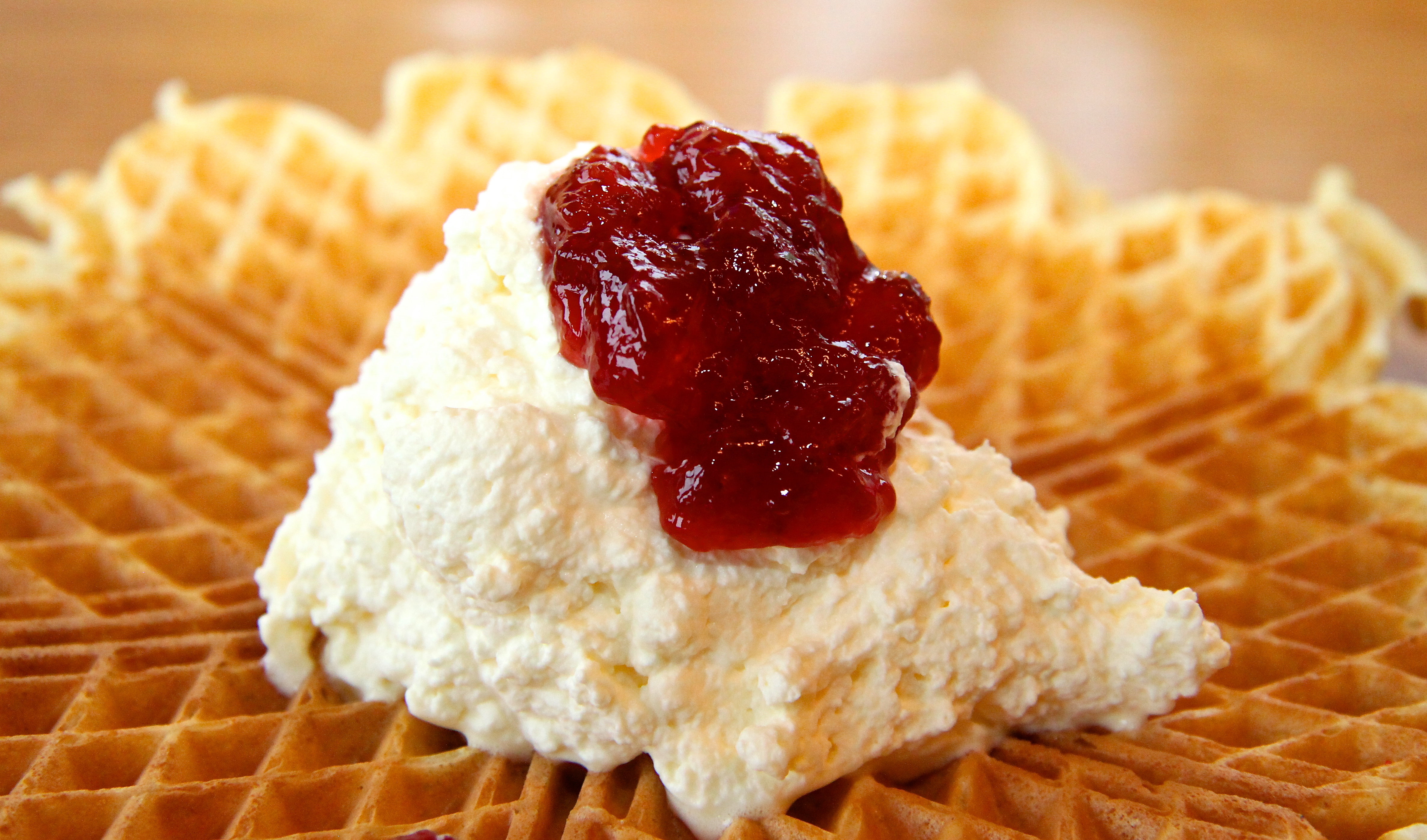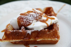 Ofn hitaður í 220 gráður. Smjörið brætt og eggin pískuð létt saman, þá er smjörinu bætt út í eggin. Því næst er mjólkinni bætt út í og hún pískuð saman við eggin og smjörið. Að lokum er þurrefnunum bætt út og og degið hrært saman með písk þar til það er slétt og laust við kekki. Deginu er hellt í formin og bakað í ofni í ca. 8-9 mínútur. Þá eru formin tekin út og vöfflunum hvolft á ofnplötu og þær bakaðar í ca. 5 mínútur til viðbótar (samkvæmt leiðbeiningum á pakkningunum). Ég reyndar bakaði þær í ca. 8 mínútur til þess að fá meiri lit á vöfflurnar. Við bárum fram vöfflurnar með rjóma og sultu annars vegar …