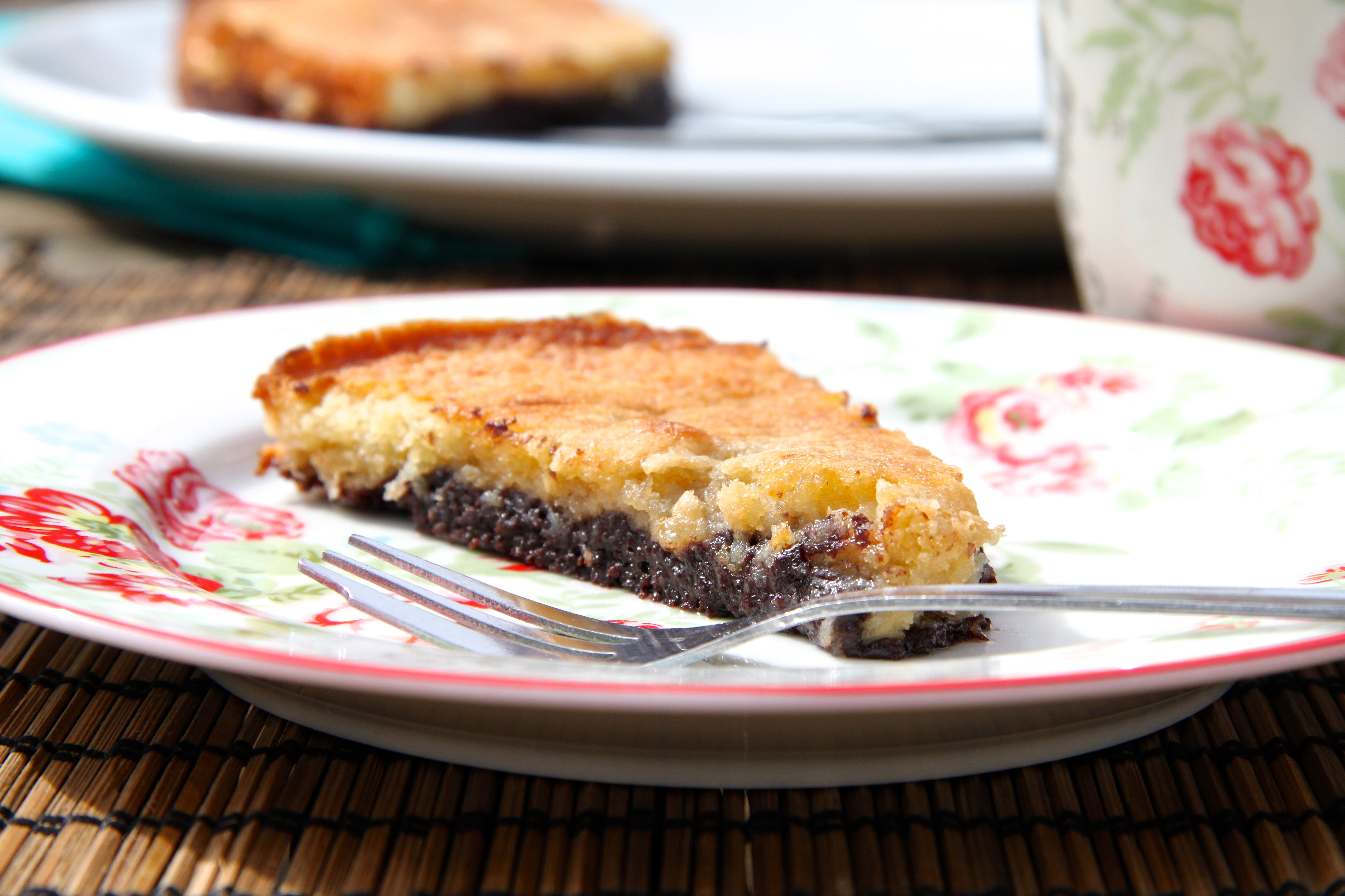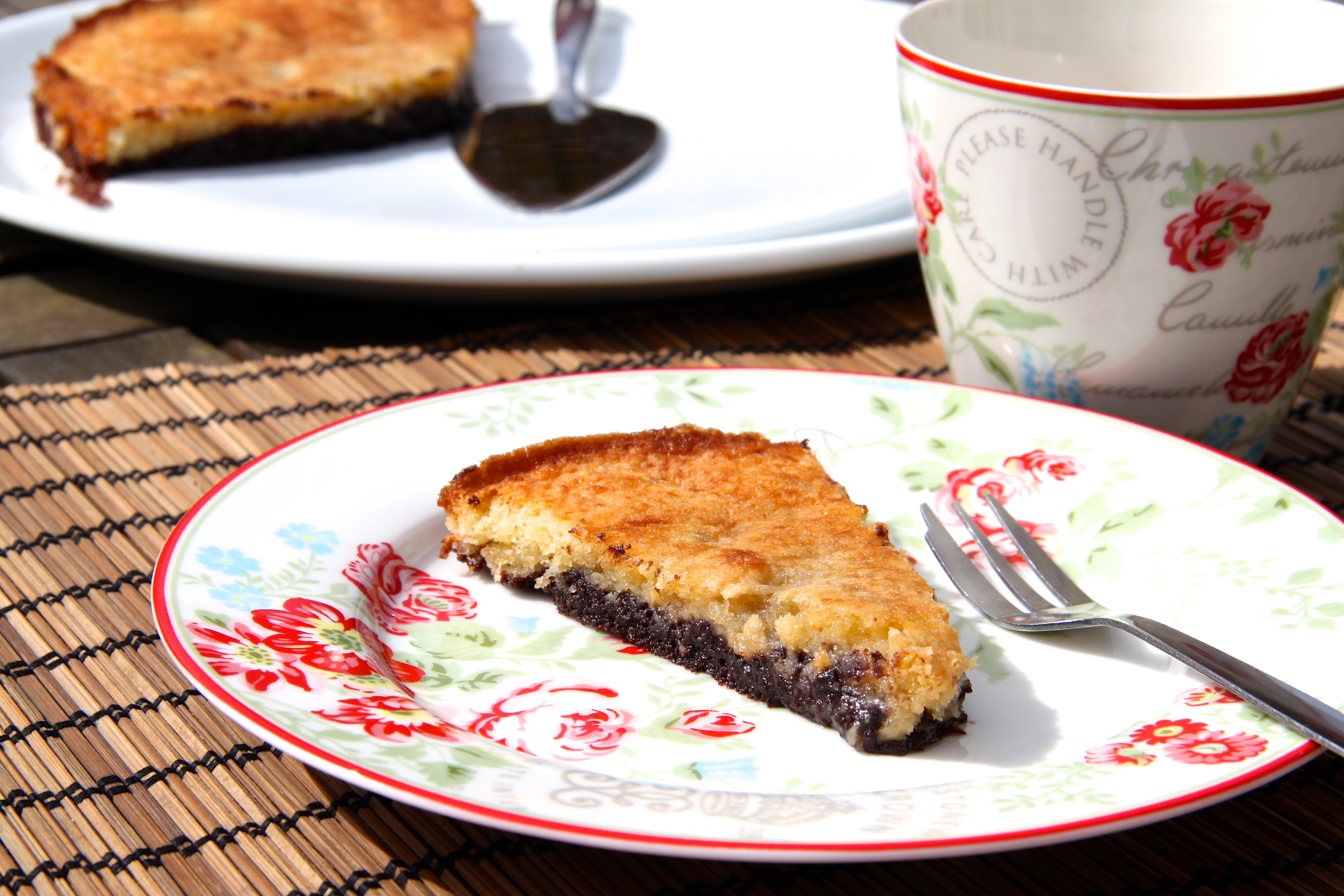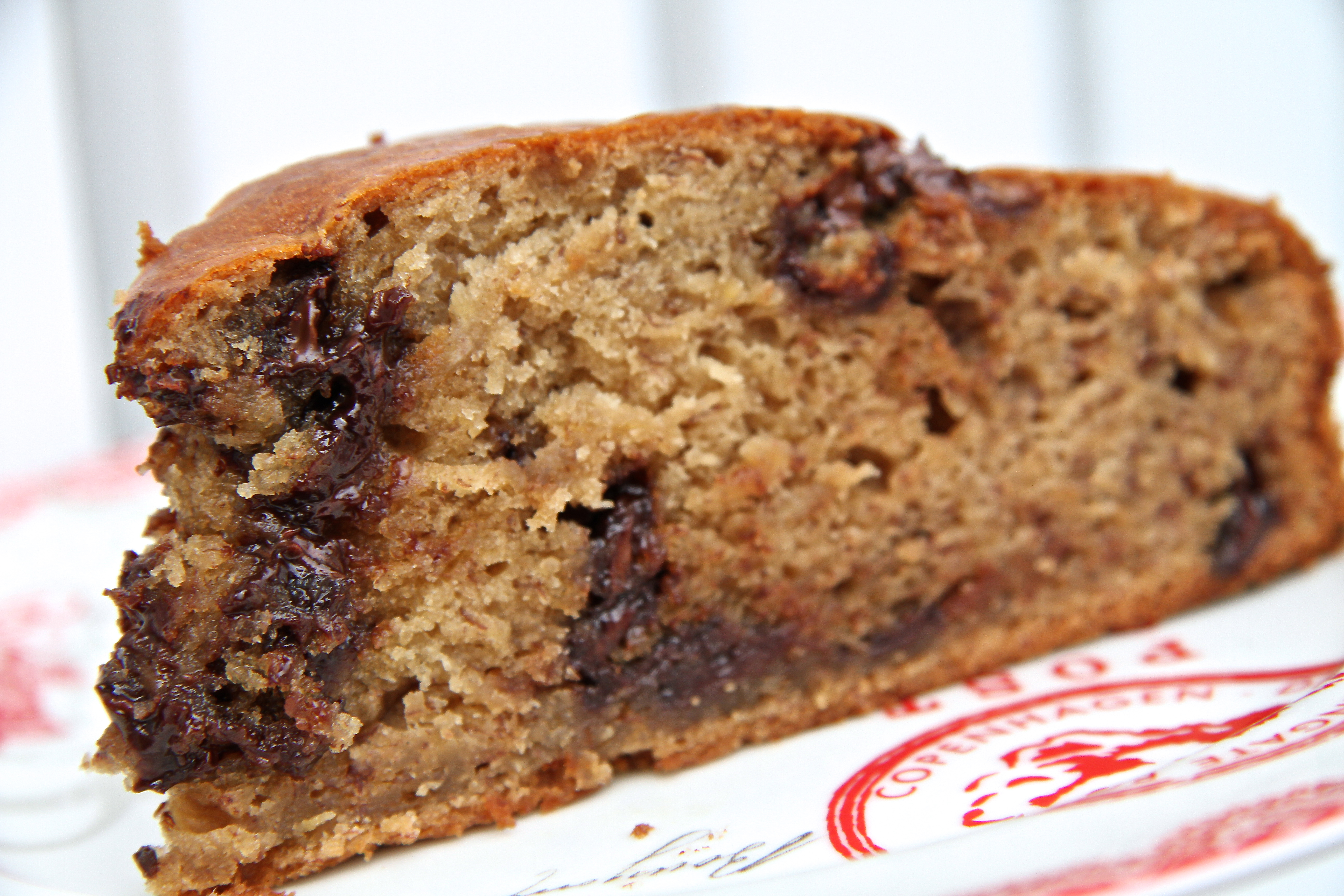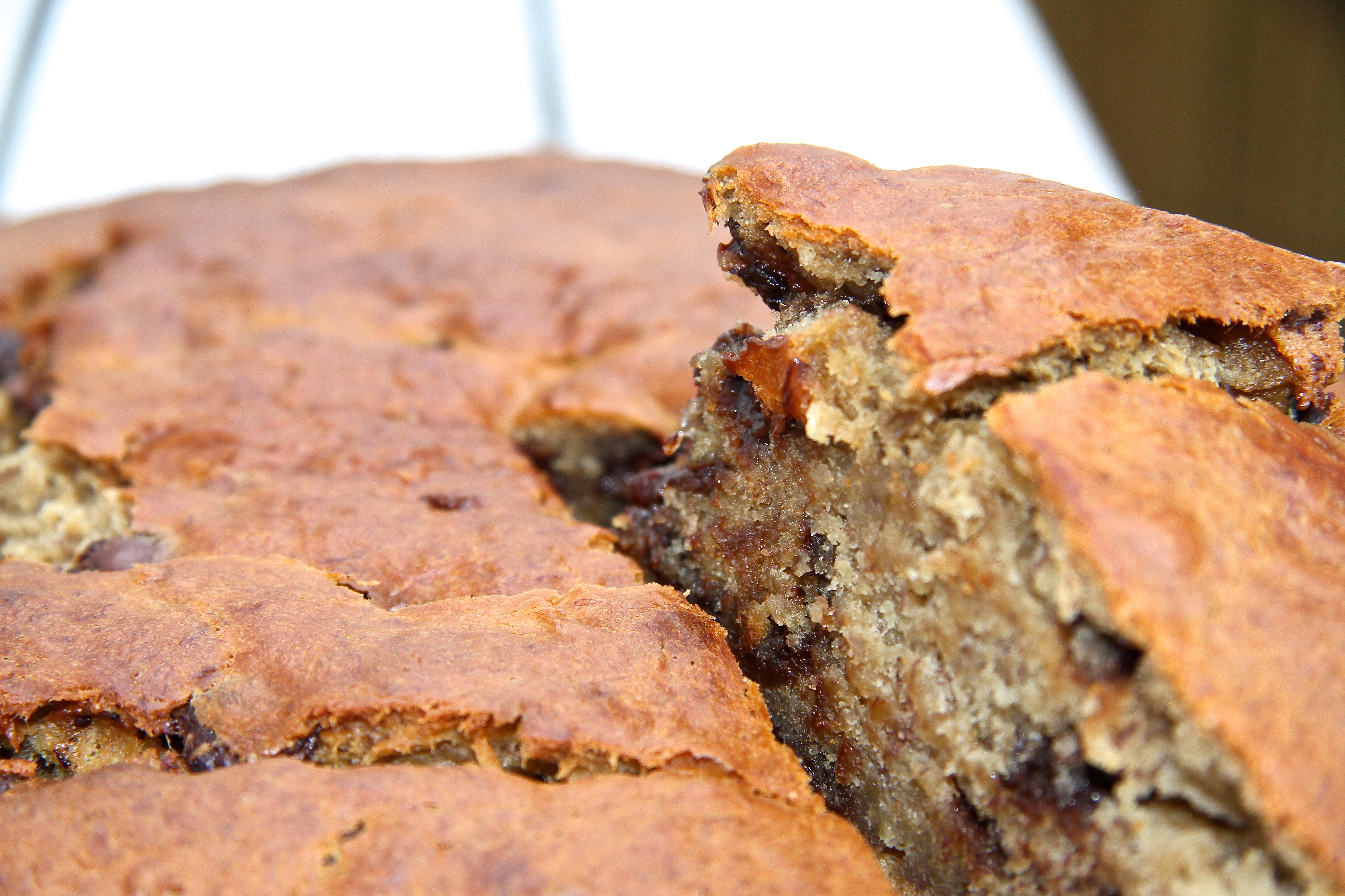 Ég get ekki annað en komið mér beint á efninu í dag! Ég bakaði svo svakalega góða köku að það hálfa væri nóg! Hún var svo góð að þegar ég mundaði myndavélina skömmu eftir að kakan kom úr ofninum þá var bara 1/4 eftir af henni! Ef ég reyni að lýsa þessari köku þá er botninn dásamlega djúsí og blautur súkkulaðikökubotn. Bananakakan sem liggur ofan á súkklaðibotninum er mátulega sæt og pínulítið stökk, með ferskum og suðrænum bananakeim, þessi blanda gerir þetta eina þá bestu köku sem ég hef bragðað! Það er svo gott við þessa köku að hún er ekki massív og er líka svo passlega sæt. Það er sko vel hægt að fá sér þrjár sneiðar – hverja á eftir annarri … ekki það að ég hafi gert það samt! Ókei, ókei, ég viðurkenni það!! Ég var satt best að segja búin að halda mér frá sætindum í viku áður en ég, grunlaus um hvað í vændum væri, bakaði þessa köku! Eins og lög gera ráð fyrir varð ég auðvitað að smakka pínulítinn bita af kökunni. Fyrir bloggið sjáið þið til. Áður en ég vissi af var ég búin með þrjár sneiðar, ég gat bara ekki hamið mig, kakan er algjört sælgæti! Þar með var sætindisbindindið rofið með stæl- takk blogg!!